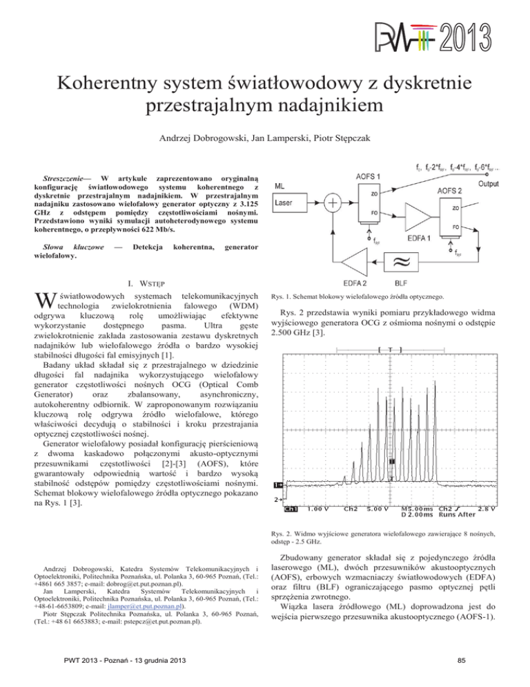 Koherentny system światłowodowy z dyskretnie przestrajalnym nadajnikiem Andrzej Dobrogowski, Jan Lamperski, Piotr Stępczak Streszczenie— W artykule zaprezentowano oryginalną konfigurację światłowodowego systemu koherentnego z dyskretnie przestrajalnym nadajnikiem. W przestrajalnym nadajniku zastosowano wielofalowy generator optyczny z 3.125 GHz z odstępem pomiędzy częstotliwościami nośnymi. Przedstawiono wyniki symulacji autoheterodynowego systemu koherentnego, o przepływności 622 Mb/s. Słowa kluczowe wielofalowy. — Detekcja koherentna, generator I. WSTĘP światłowodowych systemach telekomunikacyjnych technologia zwielokrotnienia falowego (WDM) odgrywa kluczową rolę umożliwiając efektywne wykorzystanie dostępnego pasma. Ultra gęste zwielokrotnienie zakłada zastosowania zestawu dyskretnych nadajników lub wielofalowego źródła o bardzo wysokiej stabilności długości fal emisyjnych [1]. Badany układ składał się z przestrajalnego w dziedzinie długości fal nadajnika wykorzystującego wielofalowy generator częstotliwości nośnych OCG (Optical Comb Generator) oraz zbalansowany, asynchroniczny, autokoherentny odbiornik. W zaproponowanym rozwiązaniu kluczową rolę odgrywa źródło wielofalowe, którego właściwości decydują o stabilności i kroku przestrajania optycznej częstotliwości nośnej. Generator wielofalowy posiadał konfigurację pierścieniową z dwoma kaskadowo połączonymi akusto-optycznymi przesuwnikami częstotliwości [2]-[3] (AOFS), które gwarantowały odpowiednią wartość i bardzo wysoką stabilność odstępów pomiędzy częstotliwościami nośnymi. Schemat blokowy wielofalowego źródła optycznego pokazano na Rys. 1 [3]. W Rys. 1. Schemat blokowy wielofalowego źródła optycznego. Rys. 2 przedstawia wyniki pomiaru przykładowego widma wyjściowego generatora OCG z ośmioma nośnymi o odstępie 2.500 GHz [3]. Rys. 2. Widmo wyjściowe generatora wielofalowego zawierające 8 nośnych, odstęp - 2.5 GHz. Andrzej Dobrogowski, Katedra Systemów Telekomunikacyjnych i Optoelektroniki, Politechnika Poznańska, ul. Polanka 3, 60-965 Poznań, (Tel.: +4861 665 3857; e-mail: [email protected]). Jan Lamperski, Katedra Systemów Telekomunikacyjnych i Optoelektroniki, Politechnika Poznańska, ul. Polanka 3, 60-965 Poznań, (Tel.: +48-61-6653809; e-mail: [email protected]). Piotr Stępczak Politechnika Poznańska, ul. Polanka 3, 60-965 Poznań, (Tel.: +48 61 6653883; e-mail: [email protected]). PWT 2013 - Poznań - 13 grudnia 2013 Zbudowany generator składał się z pojedynczego źródła laserowego (ML), dwóch przesuwników akustooptycznych (AOFS), erbowych wzmacniaczy światłowodowych (EDFA) oraz filtru (BLF) ograniczającego pasmo optycznej pętli sprzężenia zwrotnego. Wiązka lasera źródłowego (ML) doprowadzona jest do wejścia pierwszego przesuwnika akustooptycznego (AOFS-1). 85 Przesunięty w dziedzinie częstotliwości sygnał skierowany jest do pętli sprzężenia zwrotnego. Pętla zawiera kolejny przesuwnik akustooptyczny (AOFS-2), wzmacniacze erbowe (EDFA) kompensujące straty pętli i niską efektywność dyfrakcyjną komórek Bragga oraz filtr pasmowo-przepustowy (BLF). Przesuwniki AOFS sterowane są generatorami RF, które decydują o wartości i stabilności odstępów międzykanałowych. Filtr BLF ogranicza liczbę generowanych częstotliwości nośnych. Wielokrotna cyrkulacja sygnału optycznego w pętli prowadzi do generacji wieloczęstotliwościowego widma wyjściowego. II. REZULTATY OBLICZEŃ W procesie symulacji zastosowano modele pasywnych i aktywnych elementów umożliwiających pełną analizę spektralną badanego systemu. Nadajnik badanego systemu zawierał wielofalowe źródło optycznych częstotliwości nośnych (OCG), do wyjścia którego dołączony był modulator amplitudowy MachaZehndera i demultiplekser. Układ Macha-Zehndera modulował równocześnie wszystkie nośne generowane przez źródło wielofalowe. Całkowicie światłowodowy filtr Fabry-Perot wybrano jako główny element selektywny systemu. Fittry F-P posiadają okresową charakterystykę transmitancyjną z obszarem wolnym od rezonansu (FSR) z zakresie od 100 do 54000GHz oraz finezją (F) sięgającą 16000. Tego typu filtry mogą być zastosowane w przestrajalnych odbiornikach do selekcji kanałów optycznych lub w dyskretnie przestrajalnych układach nadawczych wykorzystujących źródła wielofalowe do skokowego wyboru optycznych częstotliwości nośnych. Światłowodowe filtry Fabry-Perot mogą być zastosowane także do realizacji modułów multiplekserów i demultiplekserów optycznych, a także krotnic transferowych (OADM). W przypadku realizacji krotnic wykorzystuje się zarówno właściwości transmitancyjne jak i odbiciowe filtrów Fabry-Perot [4]. Na Rys. 3 pokazano widmo wyjściowe generatora wielofalowego z dwoma przesuwnikami akustooptycznymi (AOFS) oraz filtrem ograniczającym. Parametry elementów optycznych umożliwiły generację 8 częstotliwości nośnych z odstępem wynoszącym 3.125 GHz. Rys. 3. Widmo wyjściowe źródła wielofalowego generującego częstotliwości nośnych, odstęp międzykanałowy – 3.125 GHz. 8 W systemie zastosowano odbiór autoheterodynowy ze zbalansowanym odbiornikiem. Jako lokalny generator użyto wzmocniony, nieprzesunięty sygnał lasera zastosowanego w module generatora wielofalowego. W rezultacie w systemie wykorzystane było tylko jedno źródło optyczne. Rys. 4 ilustruje zdemodulowany sygnał wyjściowy. Rys. 4 Sygnał na wyjściu odbiornika. III. PODSUMOWANIE W pracy zaprezentowano oryginalną koncepcję systemu koherentnego ze skokowo przestrajalnym nadajnikiem. Przedstawiono wybrane wyniki obliczeń dla nadajnika o skoku przestrajania wynoszącego 3.125 GHz i przepływności 622 Mbps. Praca finansowana jest z Projektu Nr. 1788/B/T02/2009/37. LITERATURA [1] [2] [3] [4] 86 J. P. Laude, DWDM fundamentals, components and applications, Artech House, 2002. P. Coppin et al, “Novel op