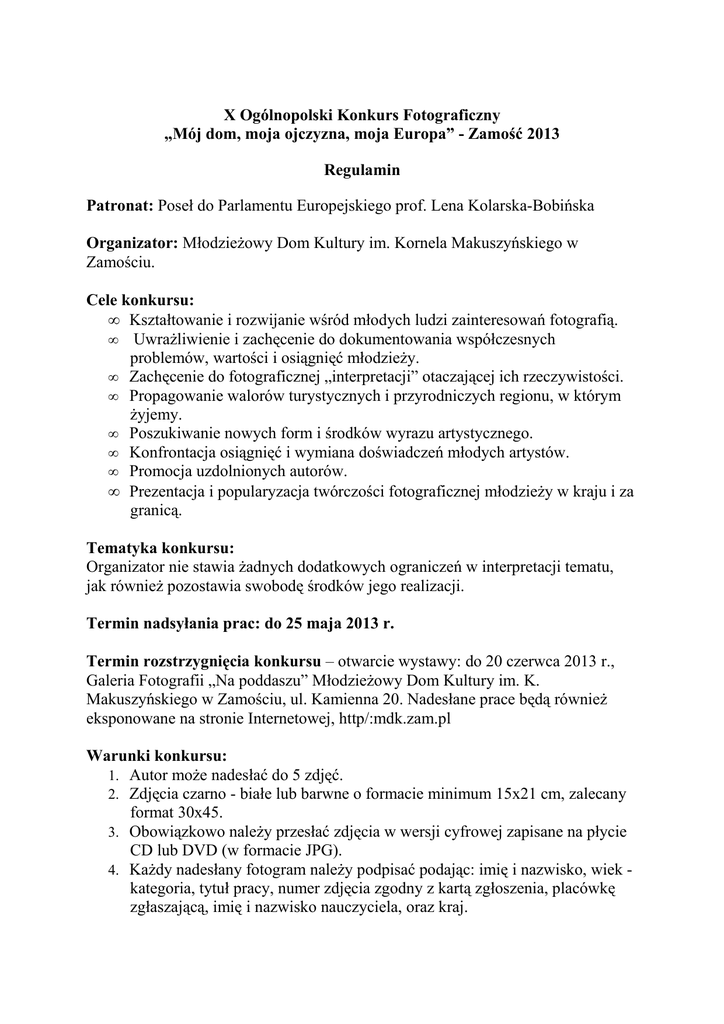 X Ogólnopolski Konkurs Fotograficzny „Mój dom, moja ojczyzna, moja Europa” - Zamość 2013 Regulamin Patronat: Poseł do Parlamentu Europejskiego prof. Lena Kolarska-Bobińska Organizator: Młodzieżowy Dom Kultury im. Kornela Makuszyńskiego w Zamościu. Cele konkursu: • Kształtowanie i rozwijanie wśród młodych ludzi zainteresowań fotografią. • Uwrażliwienie i zachęcenie do dokumentowania współczesnych problemów, wartości i osiągnięć młodzieży. • Zachęcenie do fotograficznej „interpretacji” otaczającej ich rzeczywistości. • Propagowanie walorów turystycznych i przyrodniczych regionu, w którym żyjemy. • Poszukiwanie nowych form i środków wyrazu artystycznego. • Konfrontacja osiągnięć i wymiana doświadczeń młodych artystów. • Promocja uzdolnionych autorów. • Prezentacja i popularyzacja twórczości fotograficznej młodzieży w kraju i za granicą. Tematyka konkursu: Organizator nie stawia żadnych dodatkowych ograniczeń w interpretacji tematu, jak również pozostawia swobodę środków jego realizacji. Termin nadsyłania prac: do 25 maja 2013 r. Termin rozstrzygnięcia konkursu – otwarcie wystawy: do 20 czerwca 2013 r., Galeria Fotografii „Na poddaszu” Młodzieżowy Dom Kultury im. K. Makuszyńskiego w Zamościu, ul. Kamienna 20. Nadesłane prace będą również eksponowane na stronie Internetowej, http/:mdk.zam.pl Warunki konkursu: 1. Autor może nadesłać do 5 zdjęć. 2. Zdjęcia czarno - białe lub barwne o formacie minimum 15x21 cm, zalecany format 30x45. 3. Obowiązkowo należy przesłać zdjęcia w wersji cyfrowej zapisane na płycie CD lub DVD (w formacie JPG). 4. Każdy nadesłany fotogram należy podpisać podając: imię i nazwisko, wiek kategoria, tytuł pracy, numer zdjęcia zgodny z kartą zgłoszenia, placówkę zgłaszającą, imię i nazwisko nauczyciela, oraz kraj. Kategorie wiekowe: • I – do 16 lat, • II – do 25 lat. • Uwago końcowe: 1. Konkurs jest bezpłatny. 2. Autorom najciekawszych prac przyznane zostaną nagrody, wyróżnienia oraz nagrody specjalne, a także specjalne podziękowania dla nauczycieli instruktorów, ufundowane przez organizatora. 3. Nagrody specjalne zostaną ufundowane przez Panią Poseł do Parlamentu Europejskiego prof. Lenę Kolarską-Bobińską. 4. Laureat konkursu w kategorii do lat 16 otrzyma gadżety z Parlamentu Europejskiego. 5. Najlepszy laureat konkursu z województwa lubelskiego w kategorii wiekowej do 25 lat otrzyma zaproszenie na wizytę studyjną do Parlamentu Europejskiego w Brukseli. 6. Organizatorzy zobowiązują się do traktowania nadesłanych prac z należytą starannością, lecz nie odpowiadają za uszkodzenia lub zaginięcia zdjęć wynikłe z winy poczty lub nadawcy. 7. Zdjęcia nagrodzone i wyróżnione przechodzą na własność organizatora. Organizatorzy zastrzegają sobie prawo do bezpłatnej ekspozycji prac oraz promocji zdjęć w celach propagowania idei konkursu. 8. Prace nie spełniające wymagań regulaminowych nie będą oceniane. Nadesłanie prac jest równoznaczne z uznaniem regulaminu. 9. Prace w sztywnych opakowaniach należy przesyłać z dopiskiem: „Konkurs Fotograficzny” na adres organizatora: Młodzieżowy Dom Kultury im. Kornela Makuszyńskiego, 22-400 Zamość, ul. Kamienna 20. Polska. KARTA ZGŁOSZENIA - wzór X Ogólnopolski Konkurs Fotograficzny „Mój dom, moja ojczyzna, moja Europa” - Zamość 2013 Imię i nazwisko: Adres zamieszkania: Data urodzenia: Kategoria wiekowa: Numer telefonu: Adres e-mail: Szkoła/Placówka/Uczelnia (jeśli dotyczy) : Imię i nazwisko opiekuna (jeśli dotyczy): Lp. Tytuł pracy (zestawu) Liczba fotografii Uwagi - Oświadczam, że jestem autorem prac, które zgłaszam do konkursu oraz posiadam do nich pełne prawa autorskie. - Wyrażam zgodę na przetwarzanie moich danych osobowych dla potrzeb niezbędnych do realizacji X Ogólnopolskiego Konkursu Fotograficznego „Mój dom, moja ojczyzna, moja Europa” - Zamość 2013 (Ustawa z dnia 29.08.1997 r. o Ochronie Danych Osobowych; Dz. U. z 2002 r. Nr 101, poz. 926 z póź. zm.) - Wyrażam zgodę na publikację mojego wizerunku wykonanego w czasie przedsięwzięć X Ogólnopolskiego Konkursu Fotograficznego „Mój dom, moja ojczyzna, moja Europa” - Zamość 2013 w celach promocyjnych niniejszego konkursu. .......................................................................... Podpis autora, rodzica lub prawnego opiekuna