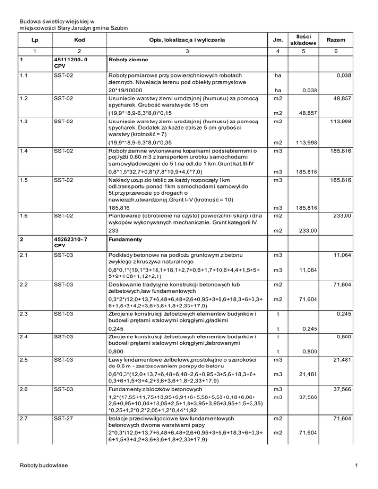 Budowa świetlicy wiejskiej w miejscowości Stary Jarużyn gmina Szubin Lp Kod Opis, lokalizacja i wyliczenia Jm. Ilości składowe Razem 1 2 3 4 5 6 1 45111200- 0 CPV Roboty ziemne 1.1 SST-02 Roboty pomiarowe przy powierzchniowych robotach ziemnych. Niwelacja terenu pod obiekty przemysłowe ha 20*19/10000 ha Usunięcie warstwy ziemi urodzajnej (humusu) za pomocą spycharek. Grubość warstwy do 15 cm m2 (19,9*18,9-6,3*8,0)*0,15 m2 Usunięcie warstwy ziemi urodzajnej (humusu) za pomocą spycharek. Dodatek za każde dalsze 5 cm grubości warstwy (krotność = 7) m2 (19,9*18,9-6,3*8,0)*0,35 m2 Roboty ziemne wykonywane koparkami podsiębiernymi o poj.łyżki 0,60 m3 z transportem urobku samochodami samowyładowczymi do 5 t na odl.do 1 km.Grunt kat.III-IV m3 0,8*1,5*32,7+0,8*(7,8*19,9+4,0*7,0) m3 Nakłady uzup.do tablic za każdy rozpoczęty 1km odl.transportu ponad 1km samochodami samowył.do 5t,przy przewozie po drogach o nawierzch.utwardzonej.Grunt I-IV (krotność = 10) m3 185,816 m3 Plantowanie (obrobienie na czysto) powierzchni skarp i dna wykopów wykonywanych mechanicznie. Grunt kategorii IV m2 233 m2 1.2 SST-02 1.3 SST-02 1.4 SST-02 1.5 SST-02 1.6 SST-02 2 45262310- 7 CPV Fundamenty 2.1 SST-03 Podkłady betonowe na podłożu gruntowym,z betonu zwykłego z kruszywa naturalnego m3 0,8*0,1*(19,1*3+18,1+18,1+2,7+0,6+1,7+10,6+4,4+1,5+5+ 5+9+1,08+1,12+2,1) m3 Deskowanie tradycyjne konstrukcji betonowych lub żelbetowych,ław fundamentowych m2 0,3*2*(12,0+13,7+6,48+6,48+2,6+0,95+3+5,6+18,3+6+0,3+ 6+1,5+3+4,2+3,6+3,6+1,8+2,33+17,9) m2 2.2 SST-03 2.3 SST-03 2.4 SST-03 2.5 SST-03 Zbrojenie konstrukcji żelbetowych elementów budynków i budowli prętami stalowymi okrągłymi,gładkimi t 0,245 t Zbrojenie konstrukcji żelbetowych elementów budynków i budowli prętami stalowymi okrągłymi,żebrowanymi t 0,800 2.6 2.7 SST-03 SST-27 Roboty budowlane t Ławy fundamentowe żelbetowe,prostokątne o szerokości do 0,6 m - zastosowaniem pompy do betonu m3 0,6*0,3*(12,0+13,7+6,48+6,48+2,6+0,95+3+5,6+18,3+6+ 0,3+6+1,5+3+4,2+3,6+3,6+1,8+2,33+17,9) m3 Fundamenty z bloczków betonowych m3 1,2*(17,55+11,75+13,95+0,91+6+5,58+5,58+0,18+6,06+ 2,6+0,95+10,04+18,05+2,5+1,8+3,95+3,95+3,95+1,5+3,35) *0,25+1,2*0,2*2,05+1,2*0,44*1,92 m3 Izolacje przeciwwilgociowe ław fundamentowych betonowych dwoma warstwami papy m2 2*0,3*(12,0+13,7+6,48+6,48+2,6+0,95+3+5,6+18,3+6+0,3+ 6+1,5+3+4,2+3,6+3,6+1,8+2,33+17,9) m2 0,038 0,038 48,857 48,857 113,998 113,998 185,816 185,816 185,816 185,816 233,00 233,00 11,064 11,064 71,604 71,604 0,245 0,245 0,800 0,800 21,481 21,481 37,566 37,566 71,604 71,604 1 Budowa świetlicy wiejskiej w miejscowości Stary Jarużyn gmina Szubin 2.8 2.9 2.10 Lp Kod Opis, lokalizacja i wyliczenia Jm. Ilości składowe Razem 1 2 3 4 5 6 SST-27 SST-27 SST-19 Izolacje przeciwwilgociowe powłokowe,pionowe, wykonywane na zimno z past emulsyjnych asfaltowych,rzadkich.Pierwsza warstwa. m2 2*1,2*(17,55+11,75+13,95+0,91+6+5,58+5,58+0,18+6,06+ 2,6+0,95+10,04+18,05+2,5+1,8+3,95+3,95+3,95+1,5+3,35) *2 m2 Izolacje przeciwwilgociowe powłokowe,pionowe, wykonywane na zimno z past emulsyjnych asfaltowych,rzadkich.Druga i następna warstwa. m2 2*1,2*(17,55+11,75+13,95+0,91+6+5,58+5,58+0,18+6,06+ 2,6+0,95+10,04+18,05+2,5+1,8+3,95+3,95+3,95+1,5+3,35) *2 m2 Ocieplenie ścian z betonu płytami styropianowymi metodą lekką-mokrą wraz z przygotowaniem podłoża ręcznie wykonanie wyprawy elewacyjnej cienkowarstwowej z gotowej suchej mieszanki m2 1,2*(17,55+17,55+18,55+18,55) m2 Ocieplenie ścian budynków płytami styropianowymi metodą lekką-mokrą przy użyciu gotowych zapraw klejących.Ochrona narożników wypukłych kątownikiem metalowym m 6 m 2.11 SST-19 3 45262610- 0 CPV Kominy 3.1 SST-32 Kanały spalinowe i dymowe z pustaków ceramicznych 3.2 SST-32 82,5 m Nakrywy kominów o śred. gr. 7 cm m2 2,5 m2 45262310- 7 CPV Elementy żelbetowe 4.1 SST-03 Betonowanie konstrukcji zbrojonych w deskowaniu tradycyjnym: belek podciągów i wieńców m3 0,24*0,2*(2,82+2,3) m3 4.2 SST-03 Deskowanie tradycyjne konstrukcji betonowych lub żelbetowych,belek podciągów i wieńców m2 3,3 m2 4.3 SST-03 SST-03 4.5 SST-51 4.6 SST-51 4.7 SST-51 4.8 SST-51 Roboty budowlane 576,960 576,960 576,960 86,64 86,64 6,00 6,00 m 4 4.4 576,960 Zbrojenie konstrukcji monolitycznych metodą tradycyjną prętami stalowymi okrągłymi, gładkimi o średnicy do 14 mm t 0,12 t Zbrojenie konstrukcji monolitycznych metodą tradycyjną prętami stalowymi okrągłymi, żebrowanymi o średnicy do 14 mm, podciągi, wieńce stropu i strop t 0,635 t Budynki z elementów typu "bloki żerańskie".Płyty stropowe o powierzchni ponad 6,0 m2 elem. 22 elem. Budynki z elementów typu "bloki żerańskie".Płyty stropowe o powierzchni 2,5-6,0 m2 elem. 7 elem. Deskowanie tradycyjne konstrukcji betonowych lub żelbetowych,płyt stropowych i dachowych m2 255,6 m2 Deskowanie tradycyjne konstrukcji betonowych lub żelbetowych,belek podciągów i wieńców m2 82,50 82,50 2,50 2,50 0,246 0,246 3,30 3,30 0,12 0,12 0,635 0,635 22,00 22,00 7,00 7,00 255,60 255,60 19,20 2 Budowa świetlicy wiejskiej w miejscowości Stary Jarużyn gmina Szubin 4.9 Lp Kod Opis, lokalizacja i wyliczenia Jm. Ilości składowe Razem 1 2 3 4 5 6 SST-03 19,2 m2 Betonowanie konstrukcji zbrojonych w deskowaniu systemowym drobnowymiarowym z transportem betonu pompą. Płyty stropowe m3 12,5 m3 5 4562522- 6 CPV Konstrukcja budynku - ściany 5.1 SST-27 Izolacje przeciwwilgociowe ścian fundamentowych betonowych dwiema warstwami papy m2 2*0,25*(12,0+13,7+6,48+6,48+2,6+0,95+3+5,6+18,3+6+ 0,3+6+1,5+3+4,2+3,6+3,6+1,8+2,33+17,9) m2 Ściany budynków jednokondygnacyjnych z bloczków z betonu komórkowego,o wysokości do 4,5 m i grubości 24 cm. m2 413,22 m2 Ścianki działowe z cegieł budowlanych pełnych,o grubości 1/2 cegły. m2 80,45 m2 Ścianki działowe z cegieł budowlanych pełnych,o grubości 1/4 cegły. m2 68,4 m2 Dodatek za zbrojenie ścianek pełnych. m2 5.2 SST-32 5.3 SST-32 5.4 SST-32 5.5 SST-32 5.6 