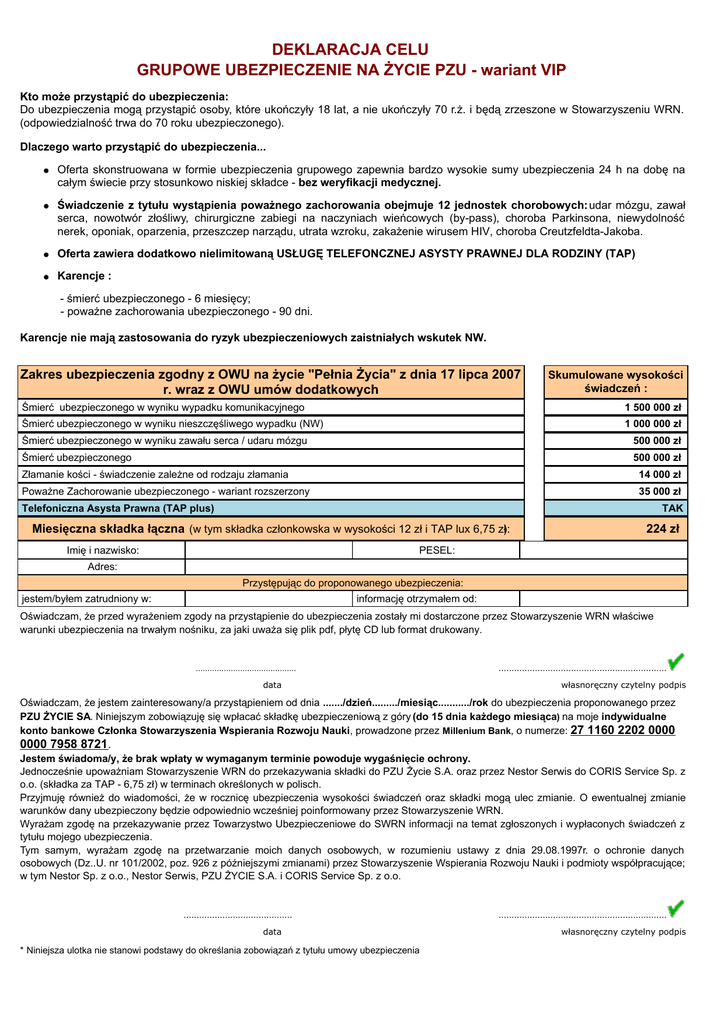 DEKLARACJA CELU GRUPOWE UBEZPIECZENIE NA ŻYCIE PZU - wariant VIP Kto może przystąpić do ubezpieczenia: Do ubezpieczenia mogą przystąpić osoby, które ukończyły 18 lat, a nie ukończyły 70 r.ż. i będą zrzeszone w Stowarzyszeniu WRN. (odpowiedzialność trwa do 70 roku ubezpieczonego). Dlaczego warto przystąpić do ubezpieczenia... Oferta skonstruowana w formie ubezpieczenia grupowego zapewnia bardzo wysokie sumy ubezpieczenia 24 h na dobę na całym świecie przy stosunkowo niskiej składce - bez weryfikacji medycznej. Świadczenie z tytułu wystąpienia poważnego zachorowania obejmuje 12 jednostek chorobowych: udar mózgu, zawał serca, nowotwór złośliwy, chirurgiczne zabiegi na naczyniach wieńcowych (by-pass), choroba Parkinsona, niewydolność nerek, oponiak, oparzenia, przeszczep narządu, utrata wzroku, zakażenie wirusem HIV, choroba Creutzfeldta-Jakoba. Oferta zawiera dodatkowo nielimitowaną USŁUGĘ TELEFONCZNEJ ASYSTY PRAWNEJ DLA RODZINY (TAP) Karencje : - śmierć ubezpieczonego - 6 miesięcy; - poważne zachorowania ubezpieczonego - 90 dni. Karencje nie mają zastosowania do ryzyk ubezpieczeniowych zaistniałych wskutek NW. Zakres ubezpieczenia zgodny z OWU na życie "Pełnia Życia" z dnia 17 lipca 2007 r. wraz z OWU umów dodatkowych Skumulowane wysokości świadczeń : Śmierć ubezpieczonego w wyniku wypadku komunikacyjnego 1 500 000 zł Śmierć ubezpieczonego w wyniku nieszczęśliwego wypadku (NW) 1 000 000 zł Śmierć ubezpieczonego w wyniku zawału serca / udaru mózgu 500 000 zł Śmierć ubezpieczonego 500 000 zł Złamanie kości - świadczenie zależne od rodzaju złamania 14 000 zł Poważne Zachorowanie ubezpieczonego - wariant rozszerzony 35 000 zł Telefoniczna Asysta Prawna (TAP plus) TAK Miesięczna składka łączna (w tym składka członkowska w wysokości 12 zł i TAP lux 6,75 zł): Imię i nazwisko: 224 zł PESEL: Adres: Przystępując do proponowanego ubezpieczenia: jestem/byłem zatrudniony w: informację otrzymałem od: Oświadczam, że przed wyrażeniem zgody na przystąpienie do ubezpieczenia zostały mi dostarczone przez Stowarzyszenie WRN właściwe warunki ubezpieczenia na trwałym nośniku, za jaki uważa się plik pdf, płytę CD lub format drukowany. ........................................... data ................................................................. własnoręczny czytelny podpis Oświadczam, że jestem zainteresowany/a przystąpieniem od dnia ......./dzień........./miesiąc.........../rok do ubezpieczenia proponowanego przez PZU ŻYCIE SA. Niniejszym zobowiązuję się wpłacać składkę ubezpieczeniową z góry (do 15 dnia każdego miesiąca) na moje indywidualne konto bankowe Członka Stowarzyszenia Wspierania Rozwoju Nauki, prowadzone przez Millenium Bank, o numerze: 27 1160 2202 0000 0000 7958 8721. Jestem świadoma/y, że brak wpłaty w wymaganym terminie powoduje wygaśnięcie ochrony. Jednocześnie upoważniam Stowarzyszenie WRN do przekazywania składki do PZU Życie S.A. oraz przez Nestor Serwis do CORIS Service Sp. z o.o. (składka za TAP - 6,75 zł) w terminach określonych w polisch. Przyjmuję również do wiadomości, że w rocznicę ubezpieczenia wysokości świadczeń oraz składki mogą ulec zmianie. O ewentualnej zmianie warunków dany ubezpieczony będzie odpowiednio wcześniej poinformowany przez Stowarzyszenie WRN. Wyrażam zgodę na przekazywanie przez Towarzystwo Ubezpieczeniowe do SWRN informacji na temat zgłoszonych i wypłaconych świadczeń z tytułu mojego ubezpieczenia. Tym samym, wyrażam zgodę na przetwarzanie moich danych osobowych, w rozumieniu ustawy z dnia 29.08.1997r. o ochronie danych osobowych (Dz..U. nr 101/2002, poz. 926 z późniejszymi zmianami) przez Stowarzyszenie Wspierania Rozwoju Nauki i podmioty współpracujące; w tym Nestor Sp. z o.o., Nestor Serwis, PZU ŻYCIE S.A. i CORIS Service Sp. z o.o. .......................................... data * Niniejsza ulotka nie stanowi podstawy do określania zobowiązań z tytułu umowy ubezpieczenia ................................................................. własnoręczny czytelny podpis PZUŻ 8155/3 Nr polisy 719622979 Nr deklaracji DEKLARACJA PRZYSTĄPIENIA do grupowego ubezpieczenia pracowniczego typu P Plus na życie typ P na życie Pełnia Życia i ubezpieczeń dodatkowych Zmiana deklaracji z powodu (proszę zakreślić odpowiednie pole) zmiany uposażonych - unieważniam wszystkie poprzednie dyspozycje dotyczące zmiany zakresu ubezpieczenia zmiany danych ubezpieczonego uposażonych na rzecz osób wskazanych poniżej w części IV Określenia, które zostały zdefiniowane w warunkach ubezpieczenia, używane są w tym dokumencie w takim samym znaczeniu. I. DANE DOTYCZĄCE UBEZPIECZONEGO - (proszę o czytelne wypełnienie deklaracji drukowanymi literami) osoba pozostająca w stosunku prawnym z ubezpieczającym (np.pracownik) Pan Pani małżonek bądź dziecko nie pozostający w stosunku prawnym z ubezpieczającym Data urodzenia Miejsce urodzenia Nazwisko Imię Obywatelstwo polskie PESEL inne Kraj stałego Zamieszkania Adres do korespondencji: Ulica Nr domu Miejscowość Kraj Kod pocztowy Poczta Telefon kontaktowy e-mail Nr lokalu Polska inny II ŁĄCZNA WYSOKOŚĆ SKŁADEK 205,25 zł Wysokość miesięcznego wynagrodzenia brutto - ...............zł 2) Upoważniam ubezpieczającego do potrącenia składek za ubezpieczenie z mojego wynagrodzenia za pracę lub innych wypłat i przekazywania ich do PZU Życie SA (oświadczenie dotyczy wyłącznie osoby pozostającej w stosunku prawnym z ubezpieczającym). 2) proszę wypełnić w przypadku przystępowania do ubezpieczenia Pełnia Życia tylko wówczas, gdy suma ubezpieczenia określana jest jako wielokrotność miesięcznego wynagrodzenia brutto. Zmiana wysokości wynagrodzenia nie powoduje zmiany wysokości sumy ubezpieczenia. III. ASSISTANCE NALEŻY WYPEŁNIĆ W PRZYPADKU PRZYSTĘPOWANIA DO GRUPOWEGO UBEZPIECZENIA DORAŹNA OCHRONA MEDYCZNA Wybieram zakres pods
