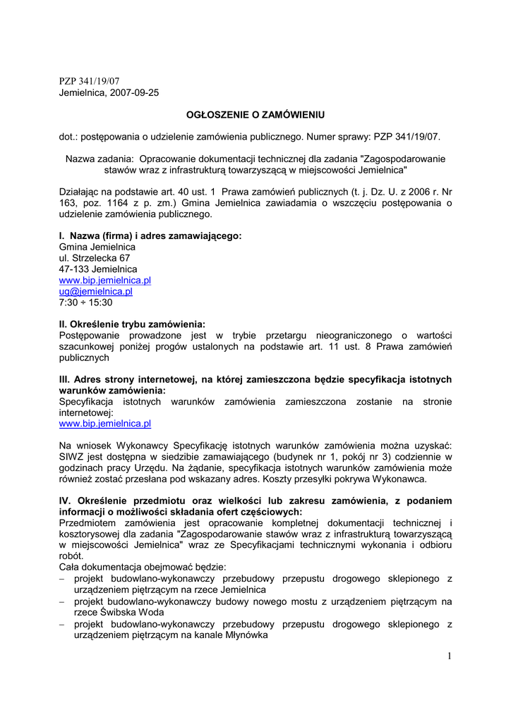 Ogłoszenie o przetargu - Urząd Gminy Jemielnica