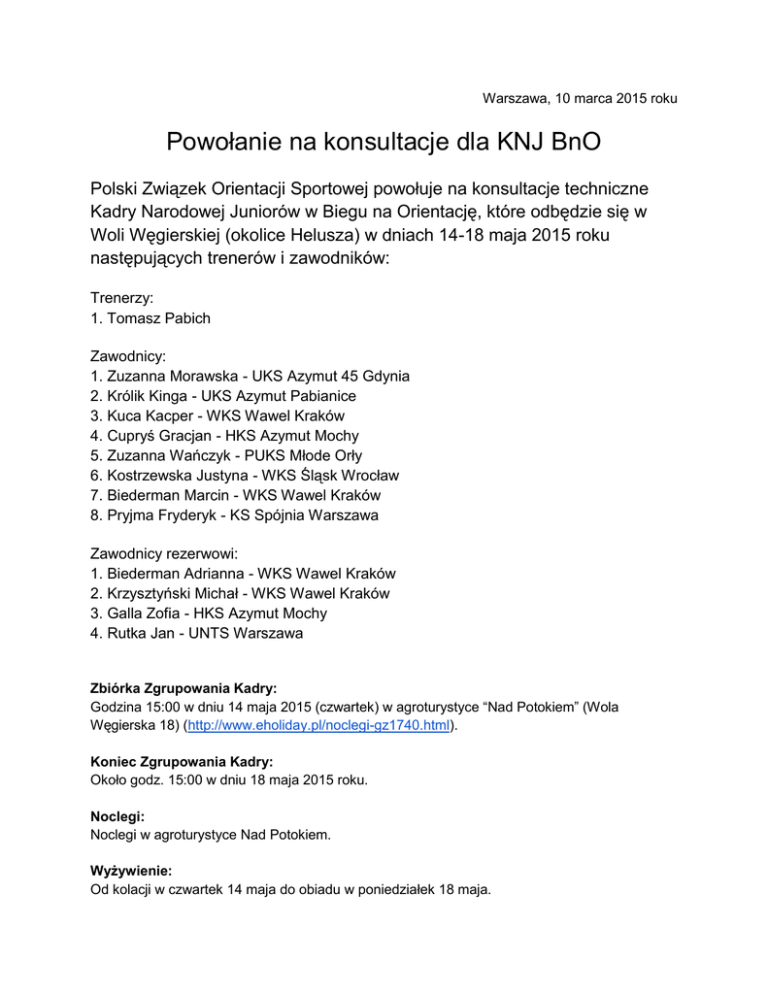 Warszawa, 10 marca 2015 roku Powołanie na konsultacje dla KNJ BnO Polski Związek Orientacji Sportowej powołuje na konsultacje techniczne Kadry Narodowej Juniorów w Biegu na Orientację, które odbędzie się w Woli Węgierskiej (okolice Helusza) w dniach 14-18 maja 2015 roku następujących trenerów i zawodników: Trenerzy: 1. Tomasz Pabich Zawodnicy: 1. Zuzanna Morawska - UKS Azymut 45 Gdynia 2. Królik Kinga - UKS Azymut Pabianice 3. Kuca Kacper - WKS Wawel Kraków 4. Cupryś Gracjan - HKS Azymut Mochy 5. Zuzanna Wańczyk - PUKS Młode Orły 6. Kostrzewska Justyna - WKS Śląsk Wrocław 7. Biederman Marcin - WKS Wawel Kraków 8. Pryjma Fryderyk - KS Spójnia Warszawa Zawodnicy rezerwowi: 1. Biederman Adrianna - WKS Wawel Kraków 2. Krzysztyński Michał - WKS Wawel Kraków 3. Galla Zofia - HKS Azymut Mochy 4. Rutka Jan - UNTS Warszawa Zbiórka Zgrupowania Kadry: Godzina 15:00 w dniu 14 maja 2015 (czwartek) w agroturystyce “Nad Potokiem” (Wola Węgierska 18) (http://www.eholiday.pl/noclegi-gz1740.html). Koniec Zgrupowania Kadry: Około godz. 15:00 w dniu 18 maja 2015 roku. Noclegi: Noclegi w agroturystyce Nad Potokiem. Wyżywienie: Od kolacji w czwartek 14 maja do obiadu w poniedziałek 18 maja. Można zamówić wyżywienie wegetariańskie lub wegańskie. Stosowną informację proszę podać w mejlowym potwierdzeniu udziału w konsultacjach. Dojazd na konsultacje i powrót: Koszty dojazdu i powrotu będą zwracane na podstawie przedstawionych biletów podróżnych. Maksymalna kwota zwracana jednemu zawodnikowi to 120 PLN. Pozostała część kosztów transportu jest pokrywana ze środków własnych zawodnika lub jego klubu. Na wyjazd zawodnicy zobowiązani są zabrać: 1. Aktualne badania sportowo – lekarskie. 2. Sprzęt sportowy do treningów w lesie. 3. Zeszyt, długopis. 4. Kartę SI Program: 14 maja - czwartek 15:00-16:00 - przyjazd, zakwaterowanie 16:00-19:00 - trening z mapą (middle lub skrócony middle / intensywność wysoka) 19:00-20:00 - kolacja 20:30-22:00 - trening pamięci 15 maja - piątek 8:00-9:00 - śniadanie 9:00-10:00 - spotkanie z zawodnikami: powitanie, omówienie planu zgrupowania 10:00-13:00 - obserwowany bieg z mapą (skrócony klasyk / prędkość startowa) 13:00-14:00 - obiad 14:00-16:00 - odpoczynek, czas wolny 16:00-19:00 - bieg z mapą (niepełna mapa / bieg na niskiej intensywności) 19:00-20:00 - kolacja 20:30-21:30 - analiza tras 16 maja - sobota 8:00-9:00 - śniadanie 9:00-10:00 - wykład teoretyczny - koncentracja i nawyki 10:00-13:00 - bieg z mapą (niepełna mapa / niska intensywność) lub sprint miejski 13:00-14:00 - obiad 14:00-16:00 - odpoczynek, czas wolny 16:00-19:00 - gry i zabawy w lesie (niska intensywność + przyspieszenia, rytmy) 19:00-20:00 - kolacja 20:00-21:00 - analiza tras 21:00-22:00 - gra pamięciowa 17 maja - niedziela 8:00-9:00 - śniadanie 9:00-9:30 - wykład teoretyczny - regeneracja 9:30-13:00 - bieg kwalifikacyjny do EYOC (klasyk, skala 1:10 000) 13:00-14:00 - obiad 14:00-16:00 - odpoczynek, czas wolny 16:00-19:00 - bieg z mapą (wejście wyjście / średnia intensywność) 19:00-20:00 - kolacja 20:00-21:00 - analiza tras 18 maja - poniedziałek 8:00-9:00 - śniadanie 9:00-10:00 - wykład teoretyczny 10:00-13:00 - bieg z mapą (niepełna mapa / wysoka intensywność) 13:00-14:00 - obiad 14:00-15:00 - zakończenie Koszty ponoszone przez powołanych zawodników (środki klubów i własne): Zawodnicy powołani na wyjazd dopłacają do wyjazdu po 185 PLN. Opłaty za wyjazd należy uiścić do dnia 08.05.2015 na konto PZOS (PEKAO SA o/Warszawa 09 1240 6218 1111 0000 4619 0314). Opłata pokrywa koszty zakwaterowania, wyżywienia (od kolacji 14 maja do obiadu 18 maja), organizację treningów i biegu kwalifikacyjnego, cenę map, oraz koszty dojazdu i powrotu ze zgrupowania (do 120 PLN). Udział w zgrupowaniu należy potwierdzić do dnia 5.05.2015 mejlowo u trenera kadry: [email protected] W razie pytań lub wątpliwości można kontaktować się z trenerem telefonicznie pod numerem: 732-004-796. Udział w konsultacjach osób dodatkowych i trenerów zawodników: Zawodnicy z KNJ niepowołani na wyjazd, zawodnicy spoza kadry planujący kwalifikować się na EYOC i JWOC (planowany bieg kwalifikacyjny 17 maja dotyczy tylko EYOC) oraz trenerzy mogą zgłosić swój udział w konsultacjach pod warunkiem opłacenia wszystkich kosztów ze środków własnych lub klubowych. Nocleg i wyżywienie będą kosztować około 250-300 PLN. Transport we własnym zakresie. Dodatkowo 5-10 PLN za mapy treningowe. Zgłoszenia proszę wysyłać mejlowo do trenera kadry (dane kontaktowe na końcu dokumentu). Podając ilość osób, kategorię wiekową oraz w jakim terminie osoby będą chciały brać udział w treningach i biegach. UWAGA: zawodnicy niepowołani na wyjazd muszą zapewnić sobie transport, który będzie potrzebny by dojechać na treningi. Dla zawodników powołanych na wyjazd transport zapewni trener kadry. Ilość miejsc noclegowych w agroturystyce Nad Potokiem jest ograniczona, ale można również zakwaterować się w innym miejscu. Trener dysponuje kontaktem do ośrodka w Heluszu, który posiada dodatkowe miejsca noclegowe w tej samej cenie (z wyżywieniem), ale noc z 15-16 maja trzeba spędzić na podłodze (własny materac + śpiwór), ze względu na to, że tego dnia ośrodek będzie zajęty. Oczywiście cena za ten jeden nocleg będzie niższa. Płatność gotówką na miejscu. Osoby spoza Kadry Narodowej Juniorów BnO startują na odpowiedzialność własną lub delegujących klubów. Trener KNJ Tomasz Pabich