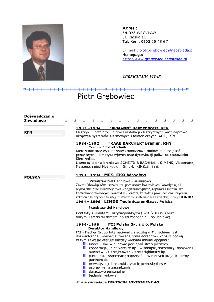 Adres : 54-028 WROCŁAW ul. Rajska 11 Tel. Kom. 0603 10 45 67 E- mail : [email protected] Homepage: http://www.grebowiec.neostrada.pl CURRICULUM VITAE Piotr Grębowiec Doświadczenie Zawodowe RFN 1982 -1984 "APMANN" Delmenhorst. RFN Elektryk - Instalator - Serwis instalacji elektrycznych oraz naprawa urządzeń systemów alarmowych i telefonicznych ,AGD, RTV. 1984-1992 "RAAB KARCHER" Bremen, RFN Technik Elektrotechnik Kierowanie oraz wykonawstwo montaŜowo-budowlane urządzeń grzewczych i klimatyzacyjnych oraz dystrybucji paliw, na stanowisku Kierownika. Liczne szkolenia branŜowe SCHEITD & BACHMAN . SIMENS, Viessmann, Messerschmied Moelkoblom GmbH. KINZLE i inni. POLSKA 1993 - 1994 MES–EKO Wrocław Przedstawiciel Handlowo - Serwisowy Zakres Obowiązków : serwis urz. pomiarowo kontrolnych, koordynacja i wykonanie prac gwarancyjnych - pogwarancyjnych, naprawa i montaŜ urz. kontrolnopomiarowych, kontakt z klientem, kontakt z producentem urządzeń, szkolenie kadry technicznej, tłumaczenie materiałów austriackiej firmy HORIBA. 1994 - 1996 LINDE Techniczne Gazy, Polska Przedstawiciel Handlowy Kontakty z klientami Instytucjonalnymi ( WIOŚ, PIOŚ ) oraz duŜymi i średnimi firmami polski zachodnio – południowej. 1996-1998 FCI Polska SP . Z O.O. Polska Dyrektor Handlowy FCI - Fischer Group International z siedzibą w Monachium jest doświadczoną i wyspecjalizowaną firmą doradczo - konsultingową. W tym zakresie oferuje między wieloma innymi opcjami : Know - How w budowie powiązań strategicznych kooperacja, Joint-Venture itp. w zakupie, sprzedaŜy, nabywaniu udziałów lub przejmowaniu przedsiębiorstw itp. partnerską współpracę poprzez filie w róŜnych krajach i firmy partnerskie prywatyzację i restrukturyzację przedsiębiorstw usprawnienia zarządzania doradztwo personalne badania rynkowe Firma sprzedana DEUTSCHE INVESTMENT AG. Doświadczenie Zawodowe 1998 - 2000 POLSKI LEASING PRZEMYSŁOWY S.A. ( filia DEUTSCHE LEASING A.G.) odział Wrocław. Przedstawiciel - Doradca Finansowy Obowiązki : Reprezentowanie firmy na terenie Zach. Polski Kontakty z klientami oraz ich zdobywanie Przygotowanie dokumentów oraz raportowanie Badanie kondycji finansowej Leasingobiorcy Kooperatywne planowanie i kontrola Działania strategiczne Motywacja i optymalizacja pracy Działania marketingowe badania rynkowe desk research Znajdowywanie i nawiązywanie nowych oraz pielęgnowanie starych kontaktów Mediacje i tłumaczenia Organizacja odpraw celnych Koordynacja logistyczna od 2001 – 2003 PELIPAL Polska Sp. z o.o. Smolec k/ Wrocławia, grupa producentów mebli łazienkowych PELIPAL GmbH z siedzibą w Schlangen ( RFN ). Dyrektor ds. Handlu i Finansów Obszar działalności Odbiorcy : EUROPA Wschodnia + Polska + Finlandia : Sieci Handlowe PRAKTIKER, OBI, CASTORAMA itp. od 2000 - 2009 DFI s.c. Doradztwo Finansowo Inwestycyjne Właściciel firmy zajmującej się pośrednictwem i konsultingiem. Leasing, Kredyty, Fundusze Inwestycyjne, - Badania rynkowe (Rynki Zachodniej Europy), - Wywiad Gospodarczy / Recruitment, - Promocja polskich firm / Plasowanie oraz Wejście na rynki Zach. - Doradztwo personalne od 2008 Połączenie się z DKI Doradztwo Księgowo – Informatyczne - świadczenie usług w zakresie rachunkowości finansowej i zarządczej, spraw kadrowo płacowych oraz doradztwa w zakresie organizacji i informatyzacji przedsiębiorstw Wykształcenie 1978 - 1981 Technikum Elektrotechniczne, Wrocław ze specjalnością - Elektromechanik Maszyn i Urządzeń Przemysłowych zakończone dyplomem Technika Elektromechanika. 1991 - 1993 Technikerhochschule Bremen, Deutschland WyŜsza Szkoła Techniczna, wydział informatyki łączności ze specjalizacją przesyłu danych w sieciach zintegrowanych. Kursy i Szkolenia 2002 - 2003 WyŜsza Szkoła Bankowa we Wrocławiu, Obywatelstwo Europäische Sprachschule w Oldenburg, RFN Bundes- Fachlehranstalt für das Elektrohandwerk w Oldenburg, RFN Erfolgreich Verkaufen (Efektywna SprzedaŜ) - LINDE Gas, Mannheim, RFN Schulung - Immissionsgeräte ( Urządzenia Emisyjne) HORIBA - Tuln, Austria Badanie Finansowe Firmy - Polski Związek Ekonomistów w Warszawie Zarządzanie Finansami Firmy - Projekt Management Advisers, Szklarska Poręba Podyplomowe studia MenedŜerskie – Marketing i Zarządzanie. Polskie, Niemieckie Członkostwo • Członek Izby Gospodarczej Konsulatu Generalnego Republiki Federalnej Niemiec Europejska Izba Gospodarcza - EUROPA FORUM • Doradca Techniczny, Tłumacz Dok. Techn. – Audi, VW Posiadane Referencje POLSKA NORDDEUTSCHE ZUCKER POLSKA. – A. Nowak MES – EKO - Dyr. Tadeusz Piekoś, INCO - VERITAS - Członek Zarządu / Dyr. ds. Przemysłu Andrzej Nowak , Agencja Rozwoju Przemysłu - Wiceprezes St. Padykuła, Dyr. Pani A. Malewicz, XI NFI - Członek Zarządu / Dyr. Inwestycyjny Stanisław Poczobut, IMPEXMETAL - Dyr. Finansowy Z. Janczyk , jak i nawiązane kontakty z urzędami takimi jak Ministerstwo Skarbu Państwa ( Departament Prywatyzacji Spółek i restrukturyzacji ) oraz NFI imienia E. Kwiatkowskiego jest dodatkowym atutem w działalności przedstawicielskiej. NIEMCY HORIBA - Direktor . Zibuschka WERNER & MÄRZ - ( Erdal - Schuhkreme ) Dr. Holzer, WOERMAN ( Schwenk - Bauchemie ) Dr. Bechtold, ERLING - KLINGER ( Zylinderkopfdichtung ) Dr. Hölzer, FREUDENBERG ( Gummidichtung ) Frau Lendel. Osobiste kontakty z firmami oraz przedstawicielami producentów maszyn i urządzeń: WEINIG AG, WANDALEX S.A. STILL POLSKA, LINDE, ANKOVO, ITA, RETMA, GEORG GEISS, DEMAGERGOTECH, KRAUSMAFFEI, SAMA, KAMPF GMBH, ZEPPELIN, HACO, CLARC,CHRISTOFFERS, HORIBA, SAUTER, LEITZ, KALTENBACH I INNI. Piotr Grębowiec