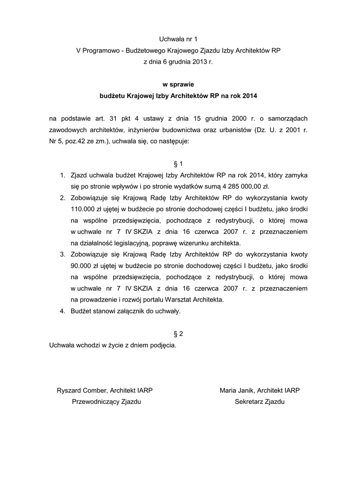 Uchwała nr 1 V Programowo - Budżetowego Krajowego Zjazdu Izby Architektów RP z dnia 6 grudnia 2013 r. w sprawie budżetu Krajowej Izby Architektów RP na rok 2014 na podstawie art. 31 pkt 4 ustawy z dnia 15 grudnia 2000 r. o samorządach zawodowych architektów, inżynierów budownictwa oraz urbanistów (Dz. U. z 2001 r. Nr 5, poz.42 ze zm.), uchwala się, co następuje: §1 1. Zjazd uchwala budżet Krajowej Izby Architektów RP na rok 2014, który zamyka się po stronie wpływów i po stronie wydatków sumą 4 285 000,00 zł. 2. Zobowiązuje się Krajową Radę Izby Architektów RP do wykorzystania kwoty 110.000 zł ujętej w budżecie po stronie dochodowej części I budżetu, jako środki na wspólne przedsięwzięcia, pochodzące z redystrybucji, o której mowa w uchwale nr 7 IV SKZIA z dnia 16 czerwca 2007 r. z przeznaczeniem na działalność legislacyjną, poprawę wizerunku architekta. 3. Zobowiązuje się Krajową Radę Izby Architektów RP do wykorzystania kwoty 90.000 zł ujętej w budżecie po stronie dochodowej części I budżetu, jako środki na wspólne przedsięwzięcia, pochodzące z redystrybucji, o której mowa w uchwale nr 7 IV SKZIA z dnia 16 czerwca 2007 r. z przeznaczeniem na prowadzenie i rozwój portalu Warsztat Architekta. 4. Budżet stanowi załącznik do uchwały. §2 Uchwała wchodzi w życie z dniem podjęcia. Ryszard Comber, Architekt IARP Maria Janik, Architekt IARP Przewodniczący Zjazdu Sekretarz Zjazdu Załącznik do uchwały nr 1 V Programowo - Budżetowego Krajowego Zjazdu Izby Architektów RP w sprawie budżetu Krajowej Izby Architektów RP na rok 2014. Projekt budżetu Krajowej Izby Architektów RP na 2014 rok L.p. Wpływy wg rodzajów Projekt budżetu na 2014 r. 1. 2 3 1. Przychody statutowe /suma 1a) do 1c)/ 3 100 000 1a. Składki i inne wpływy z odpisu na KIA * 2 900 000 1b. Środki na wspólne przedsięwzięcia na legislację i wizerunek 110 000 1c. Środki na wspólne przedsięwzięcia na Warsztat Architekta 90 000 2. Przychody operacyjne/suma2a i 2b/ 2a. Przychody z reklam dla wydawnictwa Zawód:Architekt 900 000 2b. Inne przychody operacyjne 250 000 3. Rezerwa(wolne środki pieniężne) 4. Razem przychody(poz. od 1 do 3) 1 150 000 35 000 4 285 000 L.p. Wydatki wg rodzajów Projekt budżet na 2014 r. 1. 2 3 I. Koszty działalności statutowej (poz.I.1+I.2+I.3+I.4+I.5+I.6) 2 822 000 I.1 Zjazdy 70 000 I.2 Krajowa Rada Izby(suma od a) do l)) a. bieżąca statutowa działalność KRIA b. działalność wydawnicza KRIA c. działalność KRIA w UE i poza UE d. działalność legislacyjna KRIA e. działania dla poprawy wizerunku architekta 75 000 f. powszechna edukacja architektoniczna (2 zespoły) 30 000 g. kształcenie ustawiczne architektów 40 000 h. elektroniczny system informacji dla architektów 60 000 i. standardy i warunki wykonywania zawodu architekta 25 000 j. Polska Polityka Architektoniczna 10 000 k. portal Warsztat Architekta 90 000 I.3 Krajowa Komisja Rewizyjna 18 000 I.4 Krajowa Komisja Kwalifikacyjna 60 000 I.5 Krajowy Sąd Dyscyplinarny 90 000 I.6 Krajowy Rzecznik Odpowiedzialności Zawodowej 140 000 II. Koszty ogólnoadministracyjne 687 000 III. Rezerwa na wydatki IV. Obsługa kredytu i alokacji zwrotnej IV. Wydatki łącznie (I+II+III+IV) 2 444 000 1 000 000 936 000 49 000 129 000 36 000 740 000 4 285 000 Ryszard Comber, Architekt IARP Maria Janik, Architekt IARP Przewodniczący Zjazdu Sekretarz Zjazdu