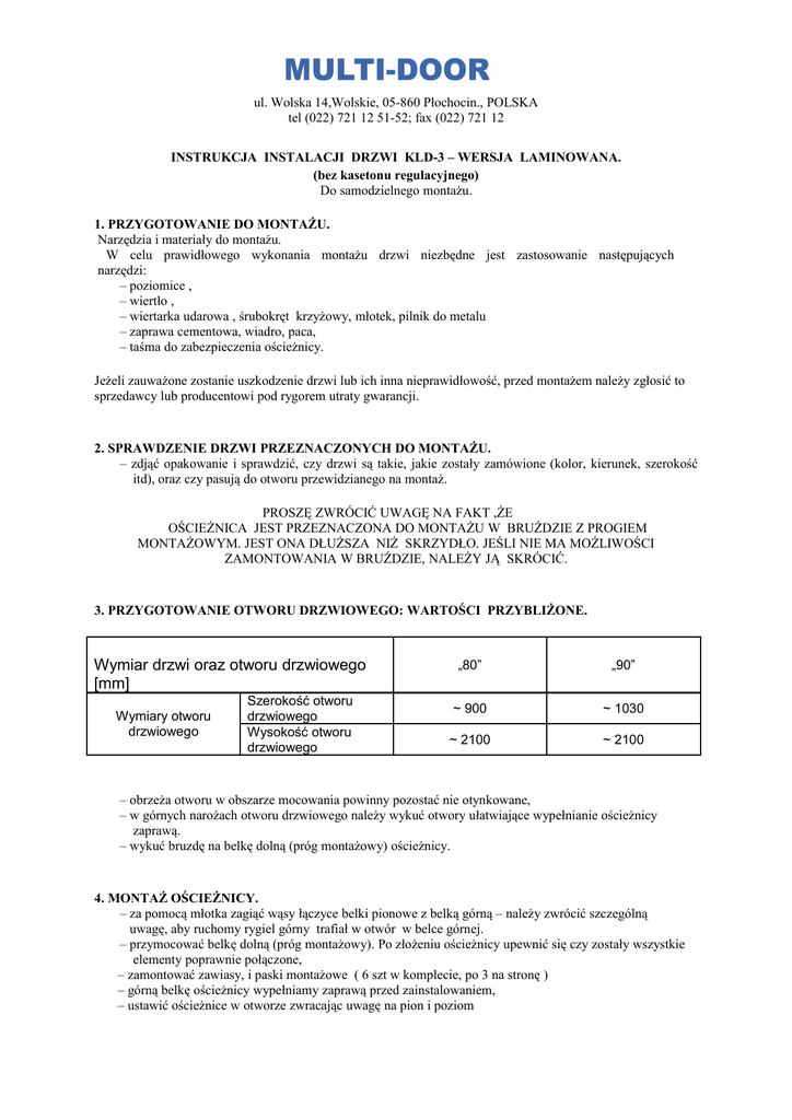 ul. Wolska 14,Wolskie, 05-860 Płochocin., POLSKA tel (022) 721 12 51-52; fax (022) 721 12 INSTRUKCJA INSTALACJI DRZWI KLD-3 – WERSJA LAMINOWANA. (bez kasetonu regulacyjnego) Do samodzielnego montażu. 1. PRZYGOTOWANIE DO MONTAŻU. Narzędzia i materiały do montażu. W celu prawidłowego wykonania montażu drzwi niezbędne jest zastosowanie następujących narzędzi: – poziomice , – wiertło , – wiertarka udarowa , śrubokręt krzyżowy, młotek, pilnik do metalu – zaprawa cementowa, wiadro, paca, – taśma do zabezpieczenia ościeżnicy. Jeżeli zauważone zostanie uszkodzenie drzwi lub ich inna nieprawidłowość, przed montażem należy zgłosić to sprzedawcy lub producentowi pod rygorem utraty gwarancji. 2. SPRAWDZENIE DRZWI PRZEZNACZONYCH DO MONTAŻU. – zdjąć opakowanie i sprawdzić, czy drzwi są takie, jakie zostały zamówione (kolor, kierunek, szerokość itd), oraz czy pasują do otworu przewidzianego na montaż. PROSZĘ ZWRÓCIĆ UWAGĘ NA FAKT ,ŻE OŚCIEŻNICA JEST PRZEZNACZONA DO MONTAŻU W BRUŹDZIE Z PROGIEM MONTAŻOWYM. JEST ONA DŁUŻSZA NIŻ SKRZYDŁO. JEŚLI NIE MA MOŻLIWOŚCI ZAMONTOWANIA W BRUŹDZIE, NALEŻY JĄ SKRÓCIĆ. 3. PRZYGOTOWANIE OTWORU DRZWIOWEGO: WARTOŚCI PRZYBLIŻONE. Wymiar drzwi oraz otworu drzwiowego [mm] Wymiary otworu drzwiowego Szerokość otworu drzwiowego Wysokość otworu drzwiowego „80” „90” ~ 900 ~ 1030 ~ 2100 ~ 2100 – obrzeża otworu w obszarze mocowania powinny pozostać nie otynkowane, – w górnych narożach otworu drzwiowego należy wykuć otwory ułatwiające wypełnianie ościeżnicy zaprawą. – wykuć bruzdę na belkę dolną (próg montażowy) ościeżnicy. 4. MONTAŻ OŚCIEŻNICY. – za pomocą młotka zagiąć wąsy łączyce belki pionowe z belką górną – należy zwrócić szczególną uwagę, aby ruchomy rygiel górny trafiał w otwór w belce górnej. – przymocować belkę dolną (próg montażowy). Po złożeniu ościeżnicy upewnić się czy zostały wszystkie elementy poprawnie połączone, – zamontować zawiasy, i paski montażowe ( 6 szt w komplecie, po 3 na stronę ) – górną belkę ościeżnicy wypełniamy zaprawą przed zainstalowaniem, – ustawić ościeżnice w otworze zwracając uwagę na pion i poziom – przymocować ościeżnice do muru paskami montażowymi przy pomocy kołków do szybkiego montażu (nie ma w komplecie), sprawdzić czy nie ma naprężeń ,skorygować pion i poziom, – ościeżnicę zabezpieczyć taśmą malarską, – wypełnić wnętrze ościeżnicy zaprawą cementową !!!!!!! 5. MONTAŻ SZYLDÓW, WKŁADEK, WIZJERA. – wkręcić trzy zawiasy drzwiowe , – zawiesić skrzydło wbijając trzpienie zawiasowe , –zamontować wkładkę bębenkową dolną z zębatką , tarczka zabezpieczająca dolną wkładkę musi być zamontowana od strony narażonej na włamanie ,zbyt mocne jej skręcenie może powodować ciężką pracę zamka – należy skręcać i kontrolować na bieżąco pracę zamka wkładając klucz z obydwu stron i obracając. Następnie skręcamy szyld i klamki, oraz montujemy wkładkę bębenkową górną z pokrętłem, które powinno być od strony mieszkania. – klucze powinny się wysuwać w pozycji POZIOMEJ –zamontować wizjer (wysokość dowolna), zwracając uwagę aby otwór był wywiercony symetrycznie na skrzydle powyżej klamki –sprawdzić ponownie poprawność montażu poprzez sprawdzenie przylegania skrzydła. Wyregulować położenie skrzydła względem ościeżnicy, regulując ustawienie zawiasów w skrzydle i ościeżnicy. NIE SMAROWAĆ WKŁADEK BĘBENKOWYCH. ŚRUBA USTALAJĄCA POZYCJĘ WKŁADKI POWINNA BYĆ DOKRĘCONA Z SIŁĄ UNIEMOŻLIWIAJĄCĄ JEJ ODKRĘCENIE. ZBYT DUŻA SIŁA MOŻE SPOWODOWAĆ ZŁE FUNKCJONOWANIE WKŁADKI. 6. UWAGI KOŃCOWE. – dopuszcza się powiększenie otworów w ościeżnicy (na „języczek” zamka głównego i rygli zamków) – nie należy dokręcać szyldów siłą większą niż potrzebna gdyż zbyt mocne dokręcenie może spowodować naprężenia zamka i wkładki , oraz uszkodzenie laminatu . – dopuszczalne odchylenie skrzydła od płaszczyzny wynosi 2-4 mm, – należy pamiętać, aby zamontować ogranicznik (nie ma w komplecie) do drzwi montowanych na zewnątrz w celu uniknięcia wyłamywania zawiasów, jeśli drzwi są zamontowane między wystającymi glifami – przypominamy że skrzydło powinno być zawieszone nad posadzką ,tak żeby była możliwość zamontowania progu docelowego (nie ma w komplecie) – nieprawidłowy montaż może spowodować złe funkcjonowanie drzwi oraz problemy z zamykaniem . 7. KONSERWACJA I CZYSZCZENIE DRZWI. – Wskazane jest okresowe, co najmniej raz w roku, przeprowadzanie konserwacji okuć, zamontowanych w drzwiach. Miejsca poślizgu w zawiasach przesmarować olejem do smarowania okuć w sprayu lub smarem stałym. Przesmarowanie poprawia poślizg i zmniejsza opory przy otwieraniu i zamykaniu drzwi. – w czasie rutynowych zabiegów mycia i czyszczenia drzwi należy używać łagodnych środków myjących, zmywać drzwi gąbką i wycierać do sucha miękką szmatką. Do usuwania zabrudzeń drzwi nie można też używać rozpuszczalników na bazie NITRO,i alkoholi. 8. UŻYTKOWANIE DRZWI. – drzwi należy użytkować zgodnie z przeznaczeniem, – nie należy narażać drzwi na trzaskanie pod wpływem przeciągów ani obciążać skrzydła ciężarami, które mogą naruszyć ustawienie okuć i pogorszyć funkcjonowanie drzwi, – drzwi należy obsługiwać za pomocą klamek. Otwieranie lub zamykanie poprzez trzaskanie nimi nie powinno się zdarzać, może to spowodować uszkodzenie powłoki wykończeniowej na drzwiach bądź pogorszenie funkcjonowania okuć, uszczelnień, zwichrowanie skrzydła, itp, 9. INFORMACJE DODATKOWE. Roszczenia reklamacyjne do drzwi po ich zabudowaniu dotyczą wad ukrytych a nie wad montażu czy powstałych w wyniku nieodpowiedniej ich eksploatacji.