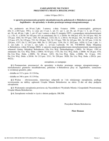 ZARZĄDZENIE NR 274/2013 PREZYDENTA MIASTA BOLESŁAWIEC z dnia 10 lipca 2013 r. w sprawie przeznaczenia gruntów niezabudowanych, położonych w Bolesławcu przy ul. Jagiellonów - do sprzedaży w drodze przetargu ustnego nieograniczonego. Na podstawie art. 30 ust. 2 pkt. 3 ustawy z dnia 8 marca 1990r. o samorządzie gminnym (Dz. U. z 2013 poz. 594 j. t.) oraz art. 11 ust. 1, art. 13. ust 1, art. 28, art. 35 ust. 1 i 2, art. 37 ust. 1, art. 38, art. 40 ust. 1 pkt. 1, art. 67 ust.1 ustawy z dnia 21 sierpnia 1997r. o gospodarce nieruchomościami ( j. t. Dz. U. z 2010r. Nr 102 poz. 651 ze zmianami; Dz. U. z 2010r. Nr 106 poz. 675, Nr 143 poz. 963, Nr 155 poz. 1043, Nr 197 poz. 1307, Nr 200 poz. 1323; Dz. U. z 2011r. Nr 64 poz. 341, Nr 106 poz. 622, Nr 115 poz. 673, Nr 129 poz. 732, Nr 130 poz. 762, Nr 135 poz. 789, Nr 163 poz. 981, Nr 187 poz. 1110, Nr 224 poz. 1337; Dz. U. 2012 poz. 908, Dz. U. 2012 poz. 1256, Dz. U. 2012 poz. 1429) i § 2 ust. 1 pkt. 1 i 2, ust. 2 pkt. 3, § 3 ust. 1, ust. 2 pkt. 1, § 6 ust. 1 uchwały Nr XL VII/400/02 Rady Miejskiej w Bolesławcu z dnia 26 lutego 2002r. w sprawie zasad gospodarowania nieruchomościami stanowiącymi własność Gminy Miejskiej Bolesławiec (Dz. Urz. Woj. Dolnośląskiego z 2002r. Nr 90 poz. 1501 ze zmianami: Dz. Urz. Woj. Doln. z 2003r. Nr 83 poz. 1733; Dz. Urz. Woj. Doln. z 2004r. Nr 26 poz. 474; Dz. Urz. Woj. Doln. z 2005r. Nr 69 poz. 1453; Dz. Urz. Woj. Doln. z 2008r. Nr 12 poz. 193; Dz. Urz. Woj. Doln. z 2010r. Nr 213 poz. 3311, Nr 230 poz. 3820; Dz. Urz. Woj. Doln. z 2012r. poz. 4622),zarządzam, co następuje: § 1. Postanawiam przeznaczyć do sprzedaży w drodze przetargu ustnego nieograniczonego nieruchomości gruntowe niezabudowane, położone w Bolesławcu przy ul. Jagiellonów, oznaczone w ewidencji gruntów, jako: - działka nr 315 o pow. 0.1154 ha, - działka nr 346 o pow. 0.1154 ha. § 2. Wykaz - obwieszczenie, stanowiący załącznik nr 1 do niniejszego zarządzenia, podlega wywieszeniu na tablicy ogłoszeń Urzędu Miasta Bolesławiec na okres 21 dni od daty podjęcia zarządzenia. § 3. Wykonanie zarządzenia powierza się Naczelnikowi Wydziału Mienia i Gospodarki Przestrzennej Urzędu Miasta Bolesławiec. § 4. Zarządzenie wchodzi w życie z dniem podjęcia. DK/DK Prezydent Miasta Bolesławiec Piotr Roman Id: 0813161E-1989-4C00-92CF-FFA3864A59C4. Podpisany Strona 1 Załącznik Nr 1 do Zarządzenia Nr 274/2013 Prezydenta Miasta Bolesławiec z dnia 10 lipca 2013 r. WYKAZ – OBWIESZCZENIE działek niezabudowanych, przewidzianych do sprzedaży w drodze przetargu ustnego nieograniczonego – z przeznaczeniem pod zabudowę mieszkaniową jednorodzinną 1. ul. Jagiellonów - działka niezabudowana nr 315 o pow. 0.1154 ha, AM 02, obręb 14, o użytku RIVa. Cena gruntu (brutto) wynosi – 79.000 zł – wywoławcza do przetargu 2. ul. Jagiellonów - działka niezabudowana nr 346 o pow. 0.1154 ha, AM 02, obręb 14, o użytku RIVa. Cena gruntu (brutto) wynosi – 79.000 zł – wywoławcza do przetargu W cenę gruntu wliczony jest należny podatek od towarów i usług, według obowiązującej stawki podatku VAT. Cena osiągnięta w przetargu, płatna będzie w całości przed zawarciem umowy notarialnej, łącznie z podatkiem VAT. 3. Działki położone są w pośredniej strefie miasta Bolesławiec. Dostępność komunikacyjna średnia, drogą gruntową. W najbliższym sąsiedztwie znajdują się: ogrody działkowe, teren szpitala oraz tereny lasu. W miejscowym planie zagospodarowania przestrzennego miasta Bolesławca, uchwalonym przez Radę Miasta w Bolesławcu, uchwałą nr XLV/374/09 z dnia 25 listopada 2009 roku - działki przeznaczone są pod tereny zabudowy mieszkaniowej jednorodzinnej – symbol z planu D-MN1. 4. Działki wpisane są w księdze wieczystej Kw nr JG1B/00025280/7 – prowadzonej przez V Wydział Ksiąg Wieczystych Sądu Rejonowego w Bolesławcu, bez obciążeń na rzecz osób trzecich. 5. Na przedmiotowych działkach występuje zadrzewienie i zakrzewienie. Usunięcie drzew z terenu działki wymagać będzie uzyskanie zezwolenia i wniesienia opłat zgodnie z ustawą o ochronie przyrody z dnia 16 kwietnia 2004r. (Dz. U. z 2009r. Nr 151, poz. 1220 ze zm.). 6. Ustala się 5 letni termin zabudowy wymienionych działek. Rozpoczęcie zabudowy winno nastąpić w ciągu 2 lat, a zakończenie w ciągu następnych 3 lat, licząc od daty zawarcia umowy notarialnej sprzedaży. Za rozpoczęcie budowy, zgodnie z art. 62 ust. 3 ustawy o gospodarce nieruchomościami, uważa się wybudowanie fundamentów, a za zakończenie budowy wybudowanie budynku w stanie surowym zamkniętym. Określone terminy wiążą również następców prawnych. 7. Mając na celu racjonalną gospodarkę terenami przeznaczonymi pod budownictwo mieszkaniowe oraz dla zapewnienia dotrzymania ustalonych w pkt. 6 terminów zabudowy działki - sprzedający zastrzega sobie: ustawowe prawo pierwokupu określone w art. 109-111 ustawy o gospodarce nieruchomościami, umowne prawo pierwokupu określone w art. 596-602 Kodeksu Cywilnego oraz prawo odkupu nieruchomości zgodnie z art. 593-595 Kodeksu Cywilnego. Prawo to zostanie ujawnione w księdze wieczystej. 8. Umowne prawo pierwokupu oraz prawo odkupu przysługiwało będzie sprzedającemu w okresie 5 lat, od dnia zawarcia umowy sprzedaży. 9. Nabywca nieruchomości jest zobowiązany zapoznać się w terenie ze stanem zagospodarowania działki, na własny koszt uporządkować teren i przygotować go do zabudowy, a także do realizacji Id: 0813161E-1989-4C00-92CF-FFA3864A59C4. Podpisany Strona 1 niezbędnego dla zamierzonej inwestycji uzbrojenia technicznego. W zależności od charakteru użytkowania, nabywca we własnym zakresie uzyska indywidualne zapewnienie dostawy mediów. Projekt budowlany należy wykonać zgodnie z ustaleniami miejscowego planu zagospodarowania przestrzennego miasta Bolesławiec. 10. Cudzoziemcy w rozumieniu ustawy z dnia 24 marca 1920 roku o nabywaniu nieruchomości przez cudzoziemców ( 