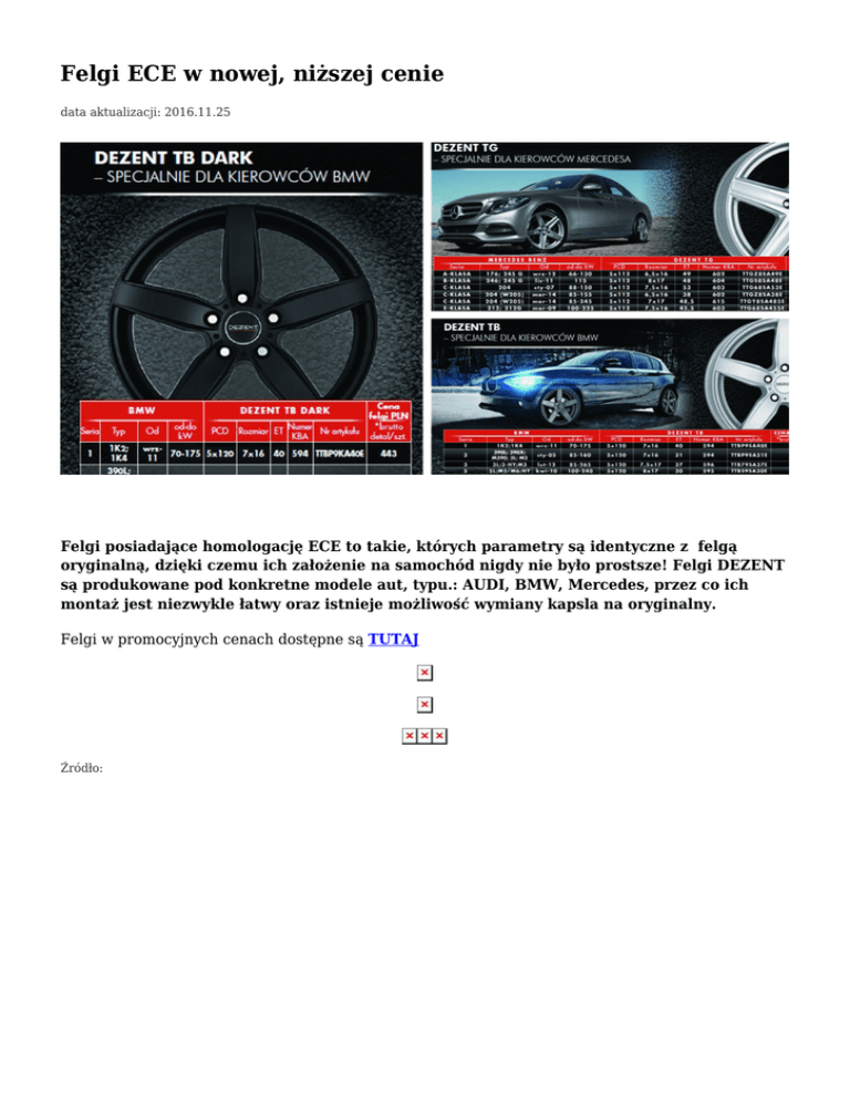 Felgi ECE w nowej, niższej cenie data aktualizacji: 2016.11.25 Felgi posiadające homologację ECE to takie, których parametry są identyczne z felgą oryginalną, dzięki czemu ich założenie na samochód nigdy nie było prostsze! Felgi DEZENT są produkowane pod konkretne modele aut, typu.: AUDI, BMW, Mercedes, przez co ich montaż jest niezwykle łatwy oraz istnieje możliwość wymiany kapsla na oryginalny. Felgi w promocyjnych cenach dostępne są TUTAJ Źródło: