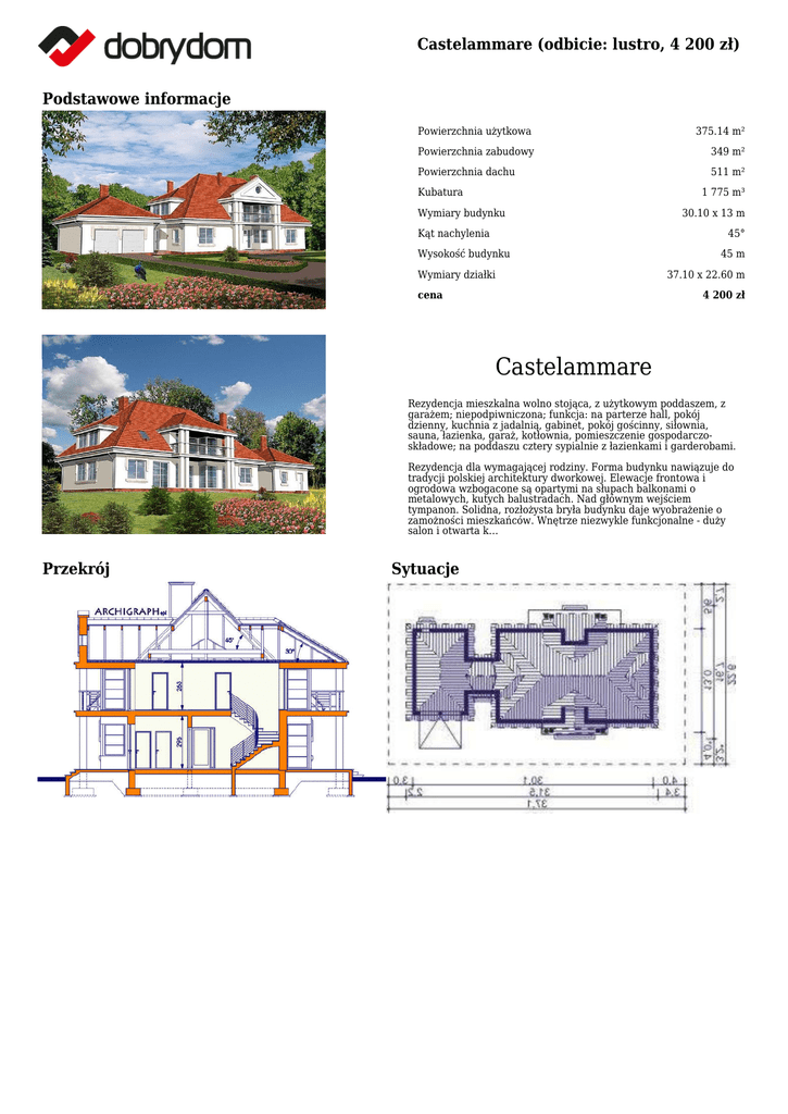Castelammare (odbicie: lustro, 4 200 zł) Podstawowe informacje Powierzchnia użytkowa 375.14 m² Powierzchnia zabudowy 349 m² Powierzchnia dachu 511 m² Kubatura 1 775 m³ Wymiary budynku Kąt nachylenia 30.10 x 13 m 45° Wysokość budynku Wymiary działki cena 45 m 37.10 x 22.60 m 4 200 zł Castelammare Rezydencja mieszkalna wolno stojąca, z użytkowym poddaszem, z garażem; niepodpiwniczona; funkcja: na parterze hall, pokój dzienny, kuchnia z jadalnią, gabinet, pokój gościnny, siłownia, sauna, łazienka, garaż, kotłownia, pomieszczenie gospodarczoskładowe; na poddaszu cztery sypialnie z łazienkami i garderobami. Rezydencja dla wymagającej rodziny. Forma budynku nawiązuje do tradycji polskiej architektury dworkowej. Elewacje frontowa i ogrodowa wzbogacone są opartymi na słupach balkonami o metalowych, kutych balustradach. Nad głównym wejściem tympanon. Solidna, rozłożysta bryła budynku daje wyobrażenie o zamożności mieszkańców. Wnętrze niezwykle funkcjonalne - duży salon i otwarta k… Przekrój Sytuacje Castelammare (odbicie: lustro, 4 200 zł) Rzuty Parter 0 m² Hall Pokój gościnny 9.12 m² 16.61 m² Łazienka 7.82 m² Sauna 6.91 m² Korytarz 4.27 m² Hall boczny 6.27 m² Pomieszczenie gospodarcze 5.02 m² Kotłownia 11.46 m² Pomieszczenie ogrodowe 12.01 m² Garaż 40.72 m² Komunikacja 14.40 m² Salon 48.83 m² Kuchnia z jadalnią 18.65 m² Spiżarnia 5.74 m² Garderoba 4.59 m² WC 3.28 m² Gabinet 16.87 m² Pokój rekreacyjny 27.52 m² Poddasze 189.45 m² Hall 21.30 m² Garderoba I 0.75 m² Garderoba II 0.75 m² Sypialnia I 27.92 m² Sypialnia II 30.82 m² Sypialnia III 30.65 m² Sypialnia IV 28.49 m² Łazienka I 5.42 m² Łazienka II 2.25 m² Łazienka III 2.07 m² Łazienka IV 5.35 m²