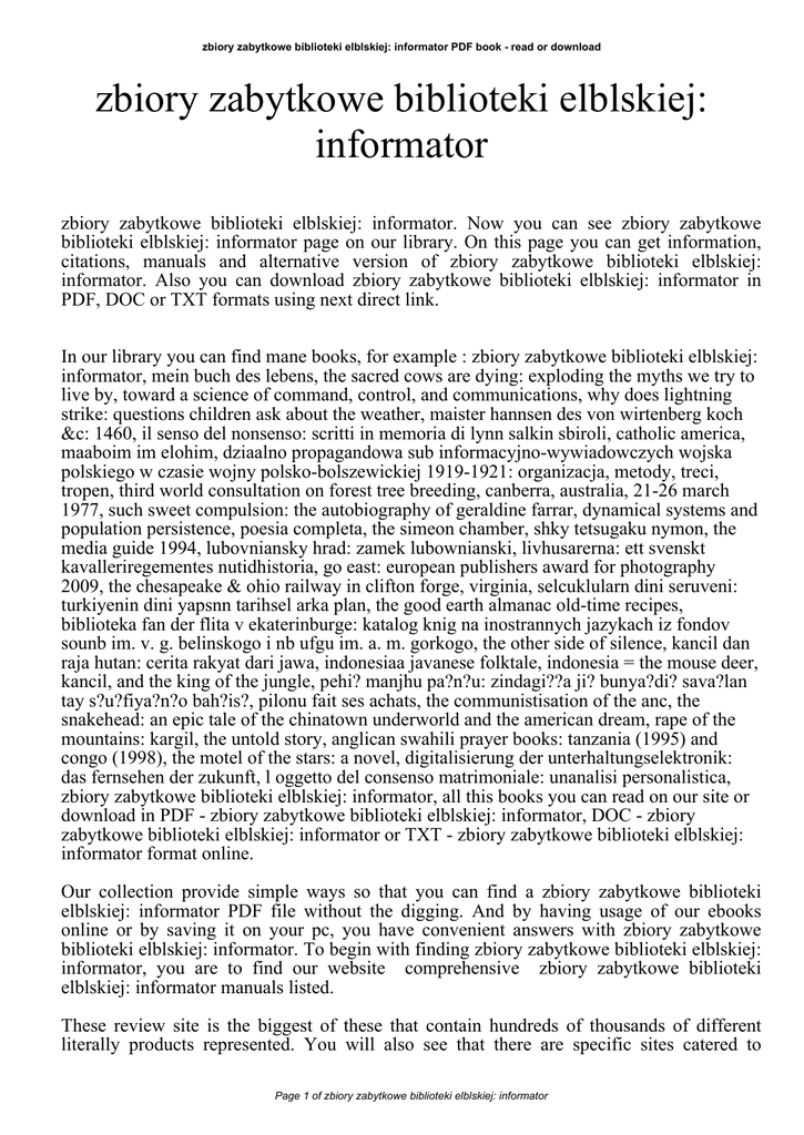 zbiory zabytkowe biblioteki elblskiej: informator PDF book - read or download zbiory zabytkowe biblioteki elblskiej: informator zbiory zabytkowe biblioteki elblskiej: informator. Now you can see zbiory zabytkowe biblioteki elblskiej: informator page on our library. On this page you can get information, citations, manuals and alternative version of zbiory zabytkowe biblioteki elblskiej: informator. Also you can download zbiory zabytkowe biblioteki elblskiej: informator in PDF, DOC or TXT formats using next direct link. In our library you can find mane books, for example : zbiory zabytkowe biblioteki elblskiej: informator, mein buch des lebens, the sacred cows are dying: exploding the myths we try to live by, toward a science of command, control, and communications, why does lightning strike: questions children ask about the weather, maister hannsen des von wirtenberg koch &c: 1460, il senso del nonsenso: scritti in memoria di lynn salkin sbiroli, catholic america, maaboim im elohim, dziaalno propagandowa sub informacyjno-wywiadowczych wojska polskiego w czasie wojny polsko-bolszewickiej 1919-1921: organizacja, metody, treci, tropen, third world consultation on forest tree breeding, canberra, australia, 21-26 march 1977, such sweet compulsion: the autobiography of geraldine farrar, dynamical systems and population persistence, poesia completa, the simeon chamber, shky tetsugaku nymon, the media guide 1994, lubovniansky hrad: zamek lubownianski, livhusarerna: ett svenskt kavalleriregementes nutidhistoria, go east: european publishers award for photography 2009, the chesapeake & ohio railway in clifton forge, virginia, selcuklularn dini seruveni: turkiyenin dini yapsnn tarihsel arka plan, the good earth almanac old-time recipes, biblioteka fan der flita v ekaterinburge: katalog knig na inostrannych jazykach iz fondov sounb im. v. g. belinskogo i nb ufgu im. a. m. gorkogo, the other side of silence, kancil dan raja hutan: cerita rakyat dari jawa, indonesiaa javanese folktale, indonesia = the mouse deer, kancil, and the king of the jungle, pehi? manjhu pa?n?u: zindagi??a ji? bunya?di? sava?lan tay s?u?fiya?n?o bah?is?, pilonu fait ses achats, the communistisation of the anc, the snakehead: an epic tale of the chinatown underworld and the american dream, rape of the mountains: kargil, the untold story, anglican swahili prayer books: tanzania (1995) and congo (1998), the motel of the stars: a novel, digitalisierung der unterhaltungselektronik: das fernsehen der zukunft, l oggetto del consenso matrimoniale: unanalisi personalistica, zbiory zabytkowe biblioteki elblskiej: informator, all this books you can read on our site or download in PDF - zbiory zabytkowe biblioteki elblskiej: informator, DOC - zbiory zabytkowe biblioteki elblskiej: informator or TXT - zbiory zabytkowe biblioteki elblskiej: informator format online. Our collection provide simple ways so that you can find a zbiory zabytkowe biblioteki elblskiej: informator PDF file without the digging. And by having usage of our ebooks online or by saving it on your pc, you have convenient answers with zbiory zabytkowe biblioteki elblskiej: informator. To begin with finding zbiory zabytkowe biblioteki elblskiej: informator, you are to find our website comprehensive zbiory zabytkowe biblioteki elblskiej: informator manuals listed. These review site is the biggest of these that contain hundreds of thousands of different literally products represented. You will also see that there are specific sites catered to Page 1 of zbiory zabytkowe biblioteki elblskiej: informator zbiory zabytkowe biblioteki elblskiej: informator PDF book - read or download different product categories or types, brands or niche categories related with zbiory zabytkowe biblioteki elblskiej: informator. So depending on just what you are searching, you'll be able to choose ebooks zbiory zabytkowe biblioteki elblskiej: informator to fit your own needs, zbiory zabytkowe biblioteki elblskiej: informator. Page 2 of zbiory zabytkowe biblioteki elblskiej: informator