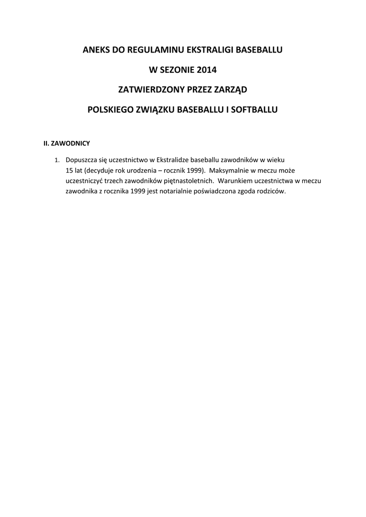 ANEKS DO REGULAMINU EKSTRALIGI BASEBALLU W SEZONIE 2014 ZATWIERDZONY PRZEZ ZARZĄD POLSKIEGO ZWIĄZKU BASEBALLU I SOFTBALLU II. ZAWODNICY 1. Dopuszcza się uczestnictwo w Ekstralidze baseballu zawodników w wieku 15 lat (decyduje rok urodzenia – rocznik 1999). Maksymalnie w meczu może uczestniczyć trzech zawodników piętnastoletnich. Warunkiem uczestnictwa w meczu zawodnika z rocznika 1999 jest notarialnie poświadczona zgoda rodziców.