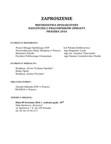 ZAPROSZENIE MISTRZOSTWA OPOLSZCZYZNY NAUCZYCIELI I PRACOWNIKÓW OŚWIATY PRASZKA 2016 PATRONAT HONOROWY: Prezes Okręgu Opolskiego ZNP Przewodniczący Rady Miejskiej w Praszce Burmistrz Praszki Dyrektor Publicznego Gimnazjum kol Wanda Sobiborowicz mgr Bogusław Łazik mgr inż. Jarosław Tkaczyński mgr Danuta Czemielewska-Cholak PATRONAT MEDIALNY: Redakcja „Nowa Trybuna Opolska” Radio Opole Redakcja „Kulisy Powiatu” ORGANIZATORZY: Zarząd Oddziału ZNP w Praszce MGOKiS w Praszce TERMIN I MIEJSCE: Dnia 09 kwietnia 2016 r. (sobota) godz. 1000 Hala Sportowa „Kotwica” ul. Sportowa 7 A, 46-320 Praszka tel. (0-34) 35-92-273 DYSCYPLINY : 1. Piłka siatkowa kobiet - 6 osobowa 2. Piłka siatkowa mężczyzn - 6 osobowa UDZIAŁ W zawodach uczestniczą czynni nauczyciele i pracownicy oświaty zatrudnieni w wymiarze nie mniej niż ½ etatu oraz emeryci „ oświatowcy „ – wymagany dokument. Dopuszcza się udział 1 zawodnika spoza oświaty 40 lat i starszy ( ur. 1976r. i później ). WPISOWE (na miejscu w dniu turnieju): Piłka siatkowa - 250,- zł od zespołu Organizatorzy zapewniają : obiad , napoje , ubezpieczenie ZGŁOSZENIA (zespoły – piłka siatkowa ) – załącznik karta zgłoszenia Do dnia 05 kwietnia 2016 r. (wtorek) faksem Publiczne Gimnazjum w Praszce. Nr faksu : ( 0-34 ) 35 91 032 . NAGRODY : Piłka siatkowa – I - IV miejsce - puchary KONTAKT TELEFONICZNY : Prezes Oddziału ZNP Praszka – Grzegorz Ignaczak tel. kom. 723 179 859 Kierownik turnieju Edmund Olszowy - tel. kom. 888 021 668 Serdecznie zapraszamy do udziału Ze sportowym pozdrowieniem