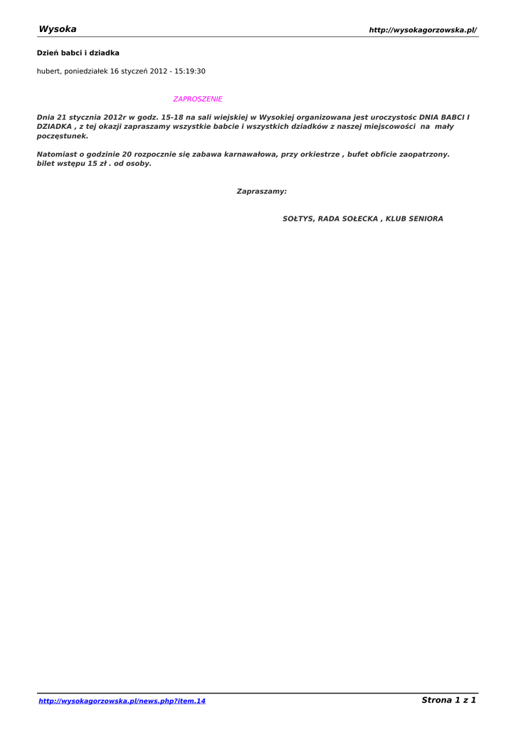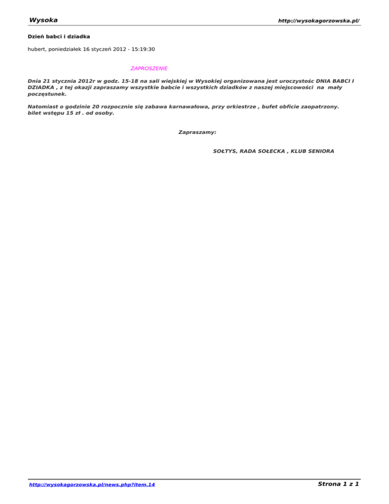 Wysoka http://wysokagorzowska.pl/ Dzień babci i dziadka hubert, poniedziałek 16 styczeń 2012 - 15:19:30 ZAPROSZENIE Dnia 21 stycznia 2012r w godz. 15-18 na sali wiejskiej w Wysokiej organizowana jest uroczystośc DNIA BABCI I DZIADKA , z tej okazji zapraszamy wszystkie babcie i wszystkich dziadków z naszej miejscowości na mały poczęstunek. Natomiast o godzinie 20 rozpocznie się zabawa karnawałowa, przy orkiestrze , bufet obficie zaopatrzony. bilet wstępu 15 zł . od osoby. Zapraszamy: SOŁTYS, RADA SOŁECKA , KLUB SENIORA http://wysokagorzowska.pl/news.php?item.14 Strona 1 z 1