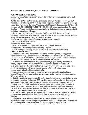 REGULAMIN KONKURSU „PIZZE, TOSTY I GRZANKI” POSTANOWIENIA OGÓLNE Konkurs „Pizze, tosty i grzanki”, zwany dalej Konkursem, organizowany jest przez spółkę: Burda Media Polska Sp. z o.o., z siedzibą przy ul. Wareckiej 11A, 00-034 Warszawa, Spółka wpisana do Krajowego Rejestru Sądowego prowadzonego przez Sąd Rejonowy dla m.st. Warszawy, XII Wydział Gospodarczy KRS, pod numerem KRS 0000257211; NIP 101-00-01-332, którą reprezentuje Tomasz Dziekan – Pełnomocnik Zarządu, uprawniony do jednoosobowej reprezentacji podmiotu zwanej dalej Burda. 1. Konkurs rozpoczyna się 7 czerwca 2012 i trwa do 5 lipca 2012 roku. Rozstrzygnięcie konkursu nastąpi 20 lipca 2012, a wyniki i lista nagrodzonych zostanie opublikowana 25 lipca 2012 na stronie http://www.przyslijprzepis.pl/konkursy/pizze-tosty-i-grzanki. 2. Nagrodami w Konkursie są: I nagroda – toster Fagor II nagroda – zestaw przypraw Prymat w wygodnych młynkach III nagroda – zestaw suplementów diety Oxycell. 3. Konkurs organizowany jest na obszarze Rzeczpospolitej Polskiej. ZASADY KONKURSU 4. Uczestnikiem Konkursu może być każda osoba fizyczna, z wyjątkiem pracowników i współpracowników Burda Media Polska Sp. z o.o. i spółek powiązanych z Burda Media Polska Sp. z o.o., w tym Burda Communications Sp. z o.o., Treehouse Sp. z o.o. oraz członków ich rodzin. 5. W Konkursie samodzielnie mogą uczestniczyć tylko osoby pełnoletnie. Osoby niepełnoletnie biorą udział w Konkursie za zgodą rodziców lub opiekunów prawnych, którzy odbierają nagrody w ich imieniu oraz udzielają zgody na publikację ich utworu oraz wykorzystanie ich wizerunku. 6. Aby wziąć udział w Konkursie należy: a) zarejestrować się na stronie internetowej www.przyslijprzepis.pl oraz wypełnić w profilu co najmniej swoje imię, nazwisko i nazwę miejscowości, w której się mieszka, b) dodać przepis na pizze, grzanki, tosty, zapiekanki w małej formie itp. wraz z autorskimi zdjęciem (minimum 500 kb). Nie może być na nim zamieszczony żaden napis czy logo) oraz opisać je słowem kluczowym „konkurs_pizze”, c) na prośbę Przyślij Przepis twórcy nagrodzonych prac prześlą na podany przez Organizatora adres pliki cyfrowe (nagrodzone fotografie) o wyższej rozdzielczości, gdyby okazało się, że zdjęcia przesłane do konkursu są zbyt słabej jakości i nie nadają się do publikacji, d) w konkursie biorą udział tylko przepisy dodane w trakcie trwania Konkursu, e) zgłoszone zdjęcie może brać udział tylko w konkursie „Pizze, tosty I grzanki”. 7. Wysyłając zgłoszenie do Konkursu w sposób opisany w punkcie 6, Uczestnik akceptuje tym samym regulamin Konkursu oraz ponadto oświadcza, że posiada pełnię praw autorskich do zgłaszanych przepisów oraz ewentualnych zdjęć użytych w przepisie, dodatkowo zgłaszając przepis do Konkursu nie narusza praw osób trzecich i udziela Burda Media Polska Sp. z o.o., Burdzie Communications Sp. z o.o. oraz Treehouse Sp. z o.o. nieodpłatnie i bezterminowo prawa do korzystania z przepisu, zdjęć oraz ich publikację. 8. Wysyłając zgłoszenie do Konkursu, a tym samym akceptując regulamin Konkursu, uczestnik Konkursu jednocześnie wyraża zgodę na dokonanie opracowania przesłanego przepisu i zdjęć, w zakresie niezbędnym z punktu widzenia technicznego, do nieodpłatnego opublikowania przepisu oraz zdjęć w magazynach związanych z Burda Media Polska Sp. z o.o., Burda Communications Sp. z o.o. i Treehouse Sp. z o.o. 9. Wysyłając zgłoszenie do Konkursu, a tym samym akceptując regulamin Konkursu, uczestnik udziela Burda Media Polska Sp. z o.o., Burda Communications Sp. z o.o. oraz Treehouse Sp. z o.o. w Warszawie, (dalej: „Spółka”) zezwolenia na nieodpłatne rozpowszechnianie i wykorzystywanie przez Spółkę, udostępnionego w ramach serwisu internetowego www.przyslijprzepis.pl (dalej: „Serwis”) wizerunku (w rozumieniu kodeksu cywilnego oraz ustawy o prawie autorskim i prawach pokrewnych) w celu umożliwienia prawidłowego i pełnego funkcjonowania świadczonych przez Spółkę usług lub funkcjonalności, w celach reklamowych prowadzonych z wykorzystaniem Serwisu przez Spółkę. Zgadza się także na nieodpłatne rozpowszechnianie i wykorzystywanie jego wizerunku jako wizerunku autora zamieszczanych przez niego w Serwisie treści, także w publikacjach poza Serwisem w tym w formie wydawnictw drukowanych (np. książek, czasopism, gazet), przy czym rozpowszechnienie takie może nastąpić tylko wraz z publikacją jego utworów lub ich części z zachowaniem praw i obowiązków wynikających z zawartej umowy licencyjnej. 10. Nagrody w Konkursie otrzymają 3 osoby, których przepisy zostaną ocenione przez redakcyjną kucharkę jako najciekawsze. 11. Warunkiem udziału w Konkursie i odebrania nagrody jest podanie pełnych i prawdziwych danych osobowych (imienia, nazwiska oraz adresu, na który ma zostać wysłana nagroda wraz z telefonem kontaktowym dla kuriera). 12. Zwycięzca zezwala na publiczne ujawnienie na stronach www.burdamedia.pl, www.przyslijprzepis.pl oraz w magazynie Przyślij Przepis swojego imienia i nazwiska oraz nazwy miejscowości, w której mieszka. 13. Uczestnik ma prawo do otrzymania tylko jednej nagrody. 14. Nagroda nie podlega zamianie na inne nagrody lub ekwiwalent pieniężny. 15. Nagrody wysyłane są do zwycięzców tylko na terenie Rzeczpospolitej Polskiej. 16. Zwycięzcy, którym zostały przyznane nagrody nie mogą przenieść praw do przyznanej mu nagrody na osoby trzecie. 17. Nagrody zostaną wysłane przesyłką pocztową bądź kurierską do Zwycięzców na podany przez Zwycięzców adres w ciągu 2 miesięcy od momentu ogłoszenia wyników. 18. W przypadku nieodebrania przesyłki przez zwycięzców przesyłka zostanie zwrócona do siedziby Organizatora (Burda Media Polska Sp. z o.o., z siedzibą przy ul. Ostrowskiego 7, 53-238 Wrocław), skąd zwycięzcy będą mogli ją odebrać osobiście w ciągu 3 miesięcy od momentu og