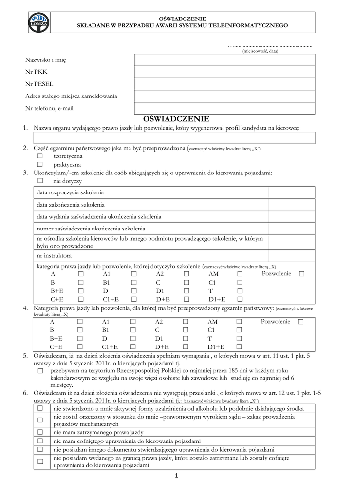 OŚWIADCZENIE SKŁADANE W PRZYPADKU AWARII SYSTEMU TELEINFORMATYCZNEGO …....................................................... (miejscowość, data) Nazwisko i imię Nr PKK Nr PESEL Adres stałego miejsca zameldowania Nr telefonu, e-mail OŚWIADCZENIE 1. Nazwa organu wydającego prawo jazdy lub pozwolenie, który wygenerował profil kandydata na kierowcę: 2. Część egzaminu państwowego jaka ma być przeprowadzona:(zaznaczyć właściwy kwadrat literą „X”) teoretyczna ☐ praktyczna ☐ 3. Ukończyłam/-em szkolenie dla osób ubiegających się o uprawnienia do kierowania pojazdami: ☐ nie dotyczy data rozpoczęcia szkolenia data zakończenia szkolenia data wydania zaświadczenia ukończenia szkolenia numer zaświadczenia ukończenia szkolenia nr ośrodka szkolenia kierowców lub innego podmiotu prowadzącego szkolenie, w którym było ono prowadzone nr instruktora kategoria prawa jazdy lub pozwolenie, której dotyczyło szkolenie (zaznaczyć właściwe kwadraty literą „X) Pozwolenie ☐ A A1 A2 AM ☐ ☐ ☐ ☐ B B1 C C1 ☐ ☐ ☐ ☐ B+E D D1 T ☐ ☐ ☐ ☐ C+E C1+E D+E D1+E ☐ ☐ ☐ ☐ 4. Kategoria prawa jazdy lub pozwolenia, dla której ma być przeprowadzony egzamin państwowy: (zaznaczyć właściwe kwadraty literą „X) Pozwolenie ☐ A A1 A2 AM ☐ ☐ ☐ ☐ B B1 C C1 ☐ ☐ ☐ ☐ B+E D D1 T ☐ ☐ ☐ ☐ C+E C1+E D+E D1+E ☐ ☐ ☐ ☐ 5. Oświadczam, iż na dzień złożenia oświadczenia spełniam wymagania , o których mowa w art. 11 ust. 1 pkt. 5 ustawy z dnia 5 stycznia 2011r. o kierujących pojazdami tj. ☐ przebywam na terytorium Rzeczypospolitej Polskiej co najmniej przez 185 dni w każdym roku kalendarzowym ze względu na swoje więzi osobiste lub zawodowe lub studiuję co najmniej od 6 miesięcy. 6. Oświadczam iż na dzień złożenia oświadczenia nie występują przesłanki , o których mowa w art. 12 ust. 1 pkt. 1-5 ustawy z dnia 5 stycznia 2011r. o kierujących pojazdami tj.: (zaznaczyć właściwe kwadraty literą „X”) nie stwierdzono u mnie aktywnej formy uzależnienia od alkoholu lub podobnie działającego środka ☐ nie został orzeczony w stosunku do mnie –prawomocnym wyrokiem sądu – zakaz prowadzenia ☐ pojazdów mechanicznych nie mam zatrzymanego prawa jazdy ☐ nie mam cofniętego uprawnienia do kierowania pojazdami ☐ nie posiadam innego dokumentu stwierdzającego uprawnienia do kierowania pojazdami ☐ nie posiadam wydanego za granicą prawa jazdy, które zostało zatrzymane lub zostały cofnięte ☐ uprawnienia do kierowania pojazdami 1 OŚWIADCZENIE SKŁADANE W PRZYPADKU AWARII SYSTEMU TELEINFORMATYCZNEGO 7. Posiadam zgodę o której mowa w art. 11 pkt. 2 ustawy z dnia 5 stycznia 2011r. o kierujących pojazdami – pisemną zgodę rodzica lub opiekuna w przypadku osób , które nie ukończyły 18 roku życia (dotyczy kategorii AM, A1,B1 i T) (zaznaczyć właściwe kwadraty literą „X) nie dotyczy ☐ posiadam zgodę ☐ 8. Posiadam uprawnienia do kierowania pojazdami kategoriizaznaczyć właściwe kwadraty literą „X) nie dotyczy ☐ Pozwolenie A A1 A2 AM ☐ ☐ ☐ ☐ B B1 C C1 ☐ ☐ ☐ ☐ B+E D D1 T ☐ ☐ ☐ ☐ C+E C1+E D+E D1+E ☐ ☐ ☐ ☐ 9. Posiadam orzeczenie lekarskie o braku przeciwwskazań zdrowotnych do prowadzenia pojazdów: ☐ ☐ nie dotyczy kategorii (zaznaczyć właściwe kwadraty literą „X) A B B+E C+E ☐ ☐ ☐ ☐ A1 B1 D C1+E ☐ ☐ ☐ ☐ A2 C D1 D+E ☐ ☐ ☐ ☐ AM C1 T D1+E ☐ ☐ ☐ ☐ Pozwolenie ☐ data wydania termin ważności numer orzeczenia lekarskiego ograniczenia zawarte w orzeczeniu lekarskim o braku przeciwwskazań zdrowotnych do kierowania pojazdem 10. Posiadam orzeczenie psychologiczne o braku przeciwwskazań psychologicznych do kierowania pojazdami: ☐ nie dotyczy kategorii: (zaznaczyć właściwe kwadraty literą „X) A A1 ☐ ☐ B B1 ☐ ☐ B+E D ☐ ☐ C+E C1+E ☐ ☐ A2 C D1 D+E ☐ ☐ ☐ ☐ AM C1 T D1+E ☐ ☐ ☐ ☐ Pozwolenie ☐ data wydania termin ważności numer orzeczenia psychologicznego 11. Zostałem skierowany na kontrolne sprawdzenie kwalifikacji w trybie: (zaznaczyć właściwe kwadraty literą „X”) ☐ nie dotyczy ☐ dotyczy ………………………………………………………………………………………………………………… ………………………………………………………………………………………………………………… 12. Inne informacje: …………………………………………………………………………………………………………………… …………………………………………………………………………………………………………………… Pouczenie: W przypadku podania nieprawidłowych danych, WORD w Łomży nie ponosi odpowiedzialności za skutki wywołane podaniem danych niezgodnych ze stanem faktycznym. …………………………………………. (własnoręczny podpis osoby składającej oświadczenie) 2