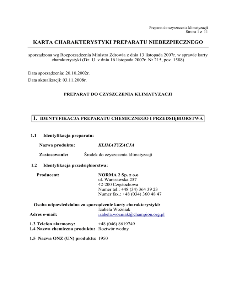 Preparat do czyszczenia klimatyzacji Strona 1 z 11 KARTA CHARAKTERYSTYKI PREPARATU NIEBEZPIECZNEGO sporządzona wg Rozporządzenia Ministra Zdrowia z dnia 13 listopada 2007r. w sprawie karty charakterystyki (Dz. U. z dnia 16 listopada 2007r. Nr 215, poz. 1588) Data sporządzenia: 20.10.2002r. Data aktualizacji: 03.11.2008r. PREPARAT DO CZYSZCZENIA KLIMATYZACJI 1. IDENTYFIKACJA PREPARATU CHEMICZNEGO I PRZEDSIĘBIORSTWA 1.1 Identyfikacja preparatu: Nazwa produktu: Zastosowanie: 1.2 KLIMATYZACJA Środek do czyszczenia klimatyzacji Identyfikacja przedsiębiorstwa: Producent: NORMA 2 Sp. z o.o ul. Warszawska 257 42-200 Częstochowa Numer tel.: +48 (34) 364 39 23 Numer fax.: +48 (034) 360 48 47 Osoba odpowiedzialna za sporządzenie karty charakterystyki: Izabela Woźniak Adres e-mail: [email protected] 1.3 Telefon alarmowy: +48 (046) 8619749 1.4 Nazwa chemiczna produktu: Roztwór wodny 1.5 Nazwa ONZ (UN) produktu: 1950 Preparat do czyszczenia klimatyzacji Strona 2 z 11 2. IDENTYFIKACJA ZAGROśEŃ ZagroŜenie poŜarowe ZagroŜenie poŜarowe: skrajnie łatwopalny. Produkt draŜniący, działa draŜniąco na oczy i skórę, pary mogą wywołać uczucie senności i zawroty głowy. ZagroŜenie toksykologiczne Preparat działa szkodliwie przez drogi oddechowe i w kontakcie ze skórą; moŜe powodować uszkodzenie płuc w przypadku połknięcia (postać aerozolowa). Działa draŜniąco na oczy i skórę. Pary mogą wywoływać uczucie senności i zawroty głowy. Powtarzające się naraŜenie moŜe powodować wysuszanie lub pękanie skóry. ZagroŜenie ekotoksykologiczne Preparat szkodliwy dla organizmów wodnych. Praktycznie nie rozpuszcza się w wodzie. Stwarza zagroŜenie dla wód powierzchniowych. 3. SKŁAD I INFORMACJA O SKŁADNIKACH Nazwa chemiczna % wag. Numer CAS Numer WE Numer indeksowy Symbole ostrzegawcze Symbole zagroŜenia Propan-2-ol >10 67-63-0 200-661-7 603-117-00-0 F, Xi R: 11-36-67 Eter alkoholu laurylowego <8 - - - Xi R: 36/38 Butan 10-15 106-97-8 203-448-7 601-004-00-0 F+ R: 12 Propan 20-30 74-98-6 200-827-9 601-003-00-5 F+ R: 12 Preparat do czyszczenia klimatyzacji Strona 3 z 11 4. PIERWSZA POMOC Zalecenia ogólne: Preparat stosowany zgodnie z przeznaczeniem, nie stwarza zagroŜenia. Zatrucie inhalacyjne: Ze względu na sposób stosowania preparatu – połknięcie mało prawdopodobne. Wypłukać jamę ustną. Zatrucie doustne: W razie połknięcia nie wywoływać wymiotów; niezwłocznie zasięgnąć porady lekarza i pokazać opakowanie lub etykietę. Postać aerozolowa – nie powinno zaistnieć. SkaŜenie oka: SkaŜone oczy płukać wodą przez 15 minut. Unikać silnego strumienia wody wobec ryzyka uszkodzenia rogówki. Zapewnić konsultację okulistyczną. SkaŜenie skóry: Zdjąć zanieczyszczoną odzieŜ, skaŜoną skórę zmyć duŜą ilością bieŜącej wody. 5. POSTĘPOWANIE W PRZYPADKU POśARU Szczególne zagroŜenia: Skrajnie łatwopalny; zbiorniki naraŜone na działanie ognia lub wysokiej temperatury mogą eksplodować. Środki gaśnicze: Dwutlenek węgla, piany, proszki gaśnicze, woda-prądy rozproszone. Zalecenia ogólne: Zaalarmować o poŜarze; z obszaru zagroŜenia usunąć wszystkie osoby nie biorące udziału w akcji gaśniczej, w razie potrzeby zarządzić ewakuację, wezwać ekipy ratownicze – StraŜ PoŜarną i Policję Państwową, stosować odzieŜ i sprzęt ochronny. Zalecenia szczegółowe: Mały poŜar gasić gaśnicą śniegową lub proszkową, duŜy poŜar gasić pianą lub rozproszonymi prądami wody. UWAGA: nie stosować zwartych strumieni wody na powierzchnię cieczy. Zbiorniki naraŜone na działanie ognia lub wysokiej temperatury chłodzić wodą, o ile to moŜliwe usunąć z obszaru zagroŜenia. Sprzęt ochronny straŜaków: aparaty izolujące drogi oddechowe. Preparat do czyszczenia klimatyzacji Strona 4 z 11 6. POSTĘPOWANIE W PRZYPADKU NIEZAMIERZONEGO UWOLNIENIA DO ŚRODOWISKA Zalecenia ogólne: Zawiadomić otoczenie o awarii; usunąć z obszaru zagroŜenia wszystkie osoby nie biorące udziału w likwidowaniu awarii; w razie potrzeby wezwać ekipy ratownicze: StraŜ PoŜarną i Policję Państwową. Środki ochrony osobistej: Unikać kontaktu z uwalniającą się cieczą; stosować rękawice ochronne i ubranie ochronne z tkanin powlekanych, okulary ochronne w szczelnej obudowie. Zalecenia szczegółowe metody unieszkodliwiania Usunąć źródła zapłonu (ugasić otwarty ogień, ogłosić zakaz palenia i uŜywania narzędzi iskrzących); zabezpieczyć zbiorniki przed nagrzaniem; pary rozcieńczyć rozproszonym strumieniem wody; o ile to moŜliwe zlikwidować wyciek (zamknąć dopływy cieczy, uszczelnić, uszkodzone opakowanie umieścić w opakowaniu awaryjnym); miejsce gromadzenia się cieczy obwałować, zebrane duŜe ilości cieczy odpompować, małe ilości rozlanej cieczy przysypać niepalnym materiałem chłonnym, zebrać i przekazać do uprawnionego odbiorcy odpadów. 7. POSTĘPOWANIE Z PREPARATEM I JEGO MAGAZYNOWANIE Podczas stosowania i przechowywania produktu przestrzegać obowiązujące przepisy bezpieczeństwa i higieny pracy. 7.1. Zapobieganie zatruciom: Podczas stosowania nie jeść, nie pić, unikać kontaktu z cieczą, przestrzegać zasad higieny osobistej, stosować odzieŜ i sprzęt ochronny, unikać wdychania par z aerozolu. Zapobieganie poŜarom i wybuchom: wyeliminować źródła zapłonu – nie uŜywać otwartego ognia, nie palić, nie uŜywać narzędzi iskrzących i odzieŜy z tkanin podatnych na elektryzację, zachować środki ostroŜności w celu uniknięcia wyładowań elektrostatycznych. Pojemniki pod ciśnieniem chronić przed słońcem i temperaturą powyŜej 50°C. Nie przekłuwać ani nie spalać takŜe po uŜyciu. Nie rozpylać nad otwartym płomieniem lub Ŝarzącymi się materiałami. Chronić przed źródłami zapłonu – nie palić w czasie rozpylania. Preparat do czyszczenia klimatyzacji Strona 5 z 11 7.2. Magazynowanie: przechowywać w oryginalnych fabrycznie zamkniętych pojemnikach. Nie trzymać