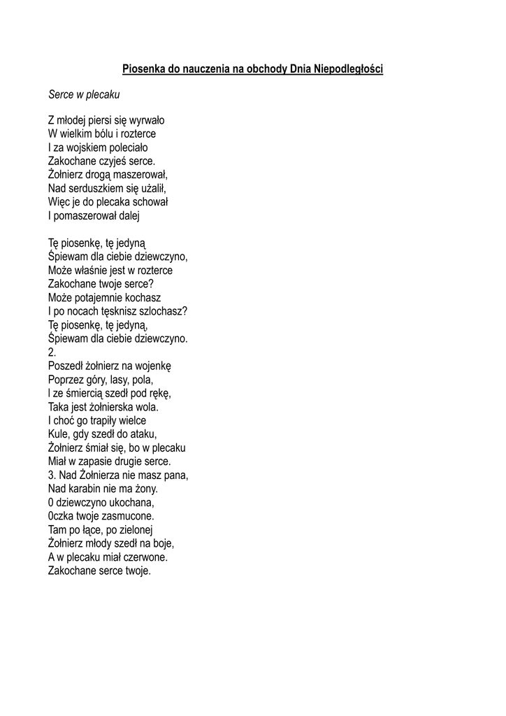 Piosenka do nauczenia na obchody Dnia Niepodległości Serce w plecaku Z młodej piersi się wyrwało W wielkim bólu i rozterce I za wojskiem poleciało Zakochane czyjeś serce. Żołnierz drogą maszerował, Nad serduszkiem się użalił, Więc je do plecaka schował I pomaszerował dalej Tę piosenkę, tę jedyną Śpiewam dla ciebie dziewczyno, Może właśnie jest w rozterce Zakochane twoje serce? Może potajemnie kochasz I po nocach tęsknisz szlochasz? Tę piosenkę, tę jedyną, Śpiewam dla ciebie dziewczyno. 2. Poszedł żołnierz na wojenkę Poprzez góry, lasy, pola, l ze śmiercią szedł pod rękę, Taka jest żołnierska wola. I choć go trapiły wielce Kule, gdy szedł do ataku, Żołnierz śmiał się, bo w plecaku Miał w zapasie drugie serce. 3. Nad Żołnierza nie masz pana, Nad karabin nie ma żony. 0 dziewczyno ukochana, 0czka twoje zasmucone. Tam po łące, po zielonej Żołnierz młody szedł na boje, A w plecaku miał czerwone. Zakochane serce twoje.