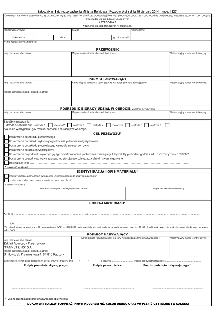 Załącznik nr 3 do rozporządzenia Ministra Rolnictwa i Rozwoju Wsi z dnia 19 sierpnia 2014 r. (poz. 1222) Dokument handlowy stosowany przy przewozie, wyłącznie na terytorium Rzeczypospolitej Polskiej, produktów ubocznych pochodzenia zwierzęcego nieprzeznaczonych do spożycia przez ludzi lub produktów pochodnych KATEGORIA 3 w rozumieniu rozporządzenia nr 1069/2009 Miejscowość wysyłki: powiat: dokument nr województwo: data godzina wysyłki Numer rejestracyjny samochodu: PRZEWOŹNIK Imię i nazwisko albo nazwa: Miejsce zamieszkania albo siedziba i adres: Weterynaryjny numer identyfikacyjny: Imię i nazwisko albo nazwa: Adres miejsca załadunku (jeżeli jest inny niż adres podmiotu zbywającego): PODMIOT ZBYWAJĄCY Weterynaryjny numer identyfikacyjny: Miejsce zamieszkania albo siedziba i adres: POŚREDNIK BIORĄCY UDZIAŁ W OBROCIE (wypełnić, gdy dotyczy) Miejsce zamieszkania albo siedziba i adres: Imię i nazwisko albo nazwa: Sposób przetwarzania:* Metoda przetwarzania: metoda 1 metoda 2 metoda 3 *Zakreślić w przypadku, gdy materiał pochodzi z zakładu przetwórczego. metoda 4 metoda 5 Weterynaryjny numer identyfikacyjny: metoda 6 metoda 7 CEL PRZEWOZU* Dostarczenie do zakładu przetwórczego Dostarczenie do zakładu wykonującego działania pośrednie i magazynowanie Dostarczenie do zakładu produkującego karmy dla zwierząt domowych Dostarczenie do spalarni/współspalarni Dostarczenie do podmiotu wykorzystującego produkty uboczne pochodzenia zwierzęcego lub produkty pochodne zgodnie z art. 18 rozporządzenia 1069/2009 Dostarczenie do podmiotu wytwarzającego lub stosującego polepszacze gleby i nawozy organiczne Inny (wpisać jaki) …………………………………………………………………………………………………………………………………………………………………. * Zakreślić właściwe IDENTYFIKACJA I OPIS MATERIAŁU* produkty uboczne pochodzenia zwierzęcego „nieprzeznaczone do spożycia przez ludzi” produkty pochodne „nieprzeznaczone do spożycia przez ludzi” * Zakreślić właściwe. Gatunek zwierzęcia, z którego pochodzi produkt: Waga całkowita materiału w kg: RODZAJ MATERIAŁU* Art. 10 lit. ……………………………………………………………………………………..) - ………………………………………………………………………………………………………………………………. lub ……………………………………………………………………………………………………………………………………………………………………………………………………………………………….. * Wymienić stosowny punkt z art. 10 rozporządzenia (WE) nr 1069/2009 i opis materiału lub, jeśli właściwe, produkt pochodny (np. art. 10 lit f - środki spożywcze, które już nie nadają się do spożycia przez ludzi; PAP). PODMIOT NABYWAJĄCY Adres miejsca rozładunku (jeśli jest inny niż siedziba podmiotu nabywającego): Weterynaryjny numer identyfikacyjny: Imię i nazwisko albo nazwa: Zakład Rolniczo - Przemysłowy "FARMUTIL HS" S.A. Miejsce zamieszkania albo siedziba i adres: Śmiłowo, ul. Przemysłowa 4, 64-810 Kaczory Samochód/kontener przed załadunkiem został umyty i odkażony dnia Podpis podmiotu zbywającego: ................................................................................ / / o godzinie................................... Podpis osoby potwierdzającej: ........................................................ Podpis przewoźnika: ................................................................................ Podpis podmiotu nabywającego:* ................................................................................ * Tylko na egzemplarzu podmiotu nabywającego i przewoźnika. DOKUMENT NALEŻY PODPISAĆ INNYM KOLOREM NIŻ KOLOR DRUKU ORAZ WYPEŁNIĆ CZYTELNIE I W CAŁOŚCI