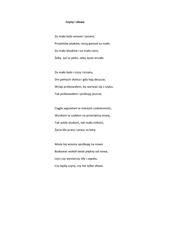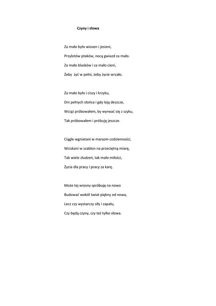Czyny i słowa Za mało było wiosen i jesieni, Przylotów ptaków, nocą gwiazd za mało. Za mało blasków i za mało cieni, Żeby żyć w pełni, żeby życie wrzało. Za mało było i ciszy i krzyku, Dni pełnych słońca i gdy leją deszcze, Wciąż próbowałem, by wyrwać się z szyku, Tak próbowałem i próbuję jeszcze. Ciągle wgniatani w marazm codzienności, Wciskani w szablon na przeciętną miarę, Tak wiele złudzeń, tak mało miłości, Życia dla pracy i pracy za karę. Może tej wiosny spróbuję na nowo Budować wokół świat piękny od nowa, Lecz czy wystarczy siły i zapału, Czy będą czyny, czy też tylko słowa. *** Tyle upadków mamy za sobą, Na skutek grzechów, ludzkich słabości, Lecz dziś ze smutkiem wyznam przed tobą, Że w nas za mało ciągle miłości. W zamęcie świata, w szaleńczym biegu, Tracimy ciągle chęć i ochotę, By w skwarze lata, zimą po śniegu Nieść krzyż wytrwale na swą Golgotę. Wciąż zbuntowani do kresu granic, Nieufni, zimni, uparci, mali, Normy, zasady wciąż mamy za nic, Pasiemy owce rózgą ze stali. Pobudź w nas Panie, swoim przykładem, Wyrwij z nas podłość , pomnażaj męstwo, Naucz ukochać własną Golgotę, Pozwól zobaczyć w Krzyżu zwycięstwo.