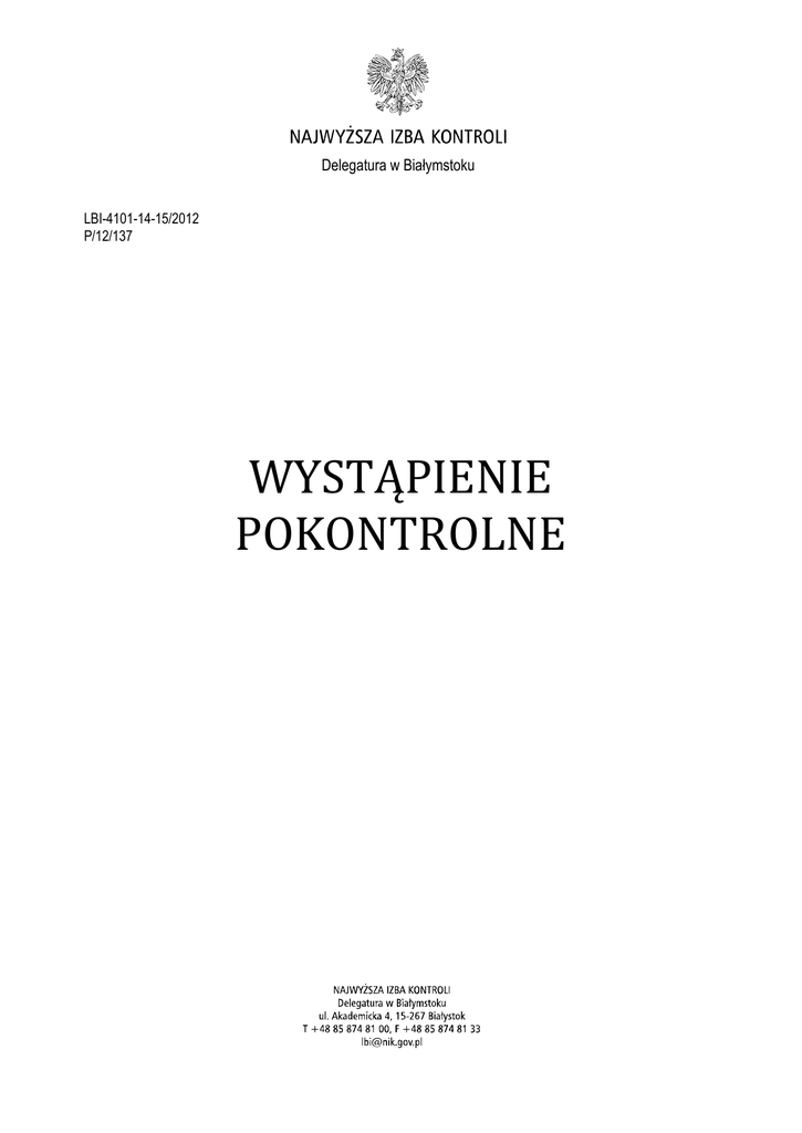 Delegatura w Białymstoku LBI-4101-14-15/2012 P/12/137 WYSTĄPIENIE POKONTROLNE I. Dane identyfikacyjne kontroli Numer i tytuł kontroli P/12/137 – Realizacja przepisów ustawy o ochronie zdrowia przed następstwami używania tytoniu i wyrobów tytoniowych Jednostka przeprowadzająca kontrolę Najwyższa Izba Kontroli Delegatura w Białymstoku Kontroler Maciej Brzosko inspektor kontroli państwowej - upoważnienie do kontroli nr 82045 z dnia 26.09.2012 r. (dowód: akta kontroli str. 1-2) Jednostka kontrolowana Samodzielny Publiczny Zakład Opieki Zdrowotnej w Siemiatyczach, ul. Szpitalna 8 (kod 17-300 Siemiatycze), zwany dalej Szpitalem Kierownik jednostki kontrolowanej Cezary Nowosielski, Dyrektor Samodzielnego Publicznego Szpitala Zespolonego w Siemiatyczach (dowód: akta kontroli str. 3) II. Ocena kontrolowanej działalności Ocena ogólna Uzasadnienie oceny ogólnej Najwyższa Izba Kontroli ocenia pozytywnie1 działalność kontrolowanej jednostki w zbadanym zakresie. Podstawą pozytywnej oceny było: oznakowanie terenu, budynków, pomieszczeń oraz środków transportu Szpitala zgodnie z art. 5 ust. 1a ustawy z dnia 9 listopada 1995 r. o ochronie zdrowia przed następstwami używania tytoniu i wyrobów tytoniowych2, zwanej dalej „ustawą antynikotynową”, przestrzeganie, wynikającego z art. 5 ust. 1 pkt. 2 ustawy antynikotynowej, zakazu palenia na terenie Szpitala. III. Opis ustalonego stanu faktycznego 1 Przestrzeganie zakazu palenia w obiektach i środkach transportu. 1.1 Opis stanu faktycznego Oznakowanie obiektów i środków transportu W wyniku dokonanych w dniu 27 września 2012 r. oględzin terenu, budynków, pomieszczeń oraz środków transportu Szpitala stwierdzono, że w widocznych miejscach znajdowały się czytelne oznaczenia słowne i graficzne informujące o zakazie palenia. Były one widoczne dla osób wchodzących/wjeżdżających na teren Szpitala oraz wchodzących do budynków i środków transportu (jeden ambulans marki Mercedes-Benz, jeden pojazd do przewozu krwi marki Volkswagen, dwa pojazdy do przewozu chorych – Citroen Berlingo oraz Renault Twingo), gdyż umieszczono je przy głównych i bocznych bramach, na drzwiach wejściowych do budynków oraz wewnątrz środków transportu. (dowód: akta kontroli str. 4-12) 1 2 Najwyższa Izba Kontroli stosuje 3-stopniową skalę ocen: pozytywna, pozytywna mimo stwierdzonych nieprawidłowości, negatywna. Jeżeli sformułowanie oceny ogólnej według proponowanej skali byłoby nadmiernie utrudnione, albo taka ocena nie dawałaby prawdziwego obrazu funkcjonowania kontrolowanej jednostki w zakresie objętym kontrolą, stosuje się ocenę opisową, bądź uzupełnia ocenę ogólną o dodatkowe objaśnienie. Dz. U. z 1996 r. Nr 10, poz.55 ze zm. 2 1.2 Opis stanu faktycznego Przestrzeganie zakazu palenia na terenie jednostki Przestrzeganie zakazu sprzedaży wyrobów tytoniowych na terenie jednostki Oględziny sklepu spożywczo-przemysłowego, znajdującego się w budynku Szpitala wykazały, że w sprzedaży nie było wyrobów tytoniowych, co jest zgodne z art. 6 ust 2 ustawy. (dowód: akta kontroli str. 4-5) 1.5 Opis stanu faktycznego palarnie W trakcie oględzin terenu wokół Szpitala, 21 pomieszczeń budynku Szpitala oraz czterech środków transportu użytkowanych przez kontrolowaną jednostkę, nie stwierdzono przypadków palenia tytoniu w tych obiektach, co wskazuje że osoby przebywające na terenie Szpitala przestrzegały zakazu palenia tytoniu zgodnie z wymogiem art. 5 ust. 1 ustawy antynikotynowej. (dowód: akta kontroli str. 4-10) 1.4 Opis stanu faktycznego przez W budynku nie było urządzonej palarni, jak też wyznaczonych miejsc do palenia tytoniu. (dowód: akta kontroli str. 4-5) 1.3 Opis stanu faktycznego Spełnianie wymogów ustawowych wyznaczone na terenie obiektów. Obowiązki wynikające z ustawy antynikotynowej w świetle regulaminów obowiązujących w jednostce W § 9 Regulaminu pracy obowiązującym w jednostce zapisano, że „Wprowadza się zakaz palenia tytoniu w pomieszczeniach zakładu pracy, z wyjątkiem palarni lub miejsc do tego wyznaczonych”. W Regulaminie tym brak jest postanowień dotyczących kar za naruszenie zakazu. W § 24 Regulaminu organizacyjnego obowiązującego w jednostce zapisano, że „Do obowiązków pracowników należy w szczególności znajomość i przestrzeganie obowiązujących przepisów prawa, zarządzeń, procedur, instrukcji i regulaminów dotyczących w szczególności powierzonego zakresu pracy oraz zasad organizacji pracy w SP ZOZ”. Dyrektor Szpitala wyjaśnił, „Z moich informacji wynika, iż nie istnieją przepisy prawa nakazujące umieszczenie w regulaminie pracy zapisów dotyczących zakazu palenia oraz sankcji za naruszenie takiego zakazu. W Regulaminie widnieją ogólne zapisy dotyczące naruszeń postanowień regulaminowych. Nadmienię, że wśród pracowników Szpitala została przeprowadzona akcja informacyjna dotycząca przepisów ustawy antynikotynowej, w tym o karach za naruszenie zakazu palenia. Wszyscy pracownicy Szpitala są zapoznani z treścią ustawy i znają sankcje za naruszenie zakazu palenia. W Regulaminie organizacyjnym SP ZOZ w Siemiatyczach widnieje zapis, który mówi, że do obowiązków pracowników należy między innymi znajomość i przestrzeganie obowiązujących przepisów prawa. W tym ogólnym stwierdzeniu mieści się obowiązek znajomości przepisów ustawy antynikotynowej. Dodatkowo w budynku Szpitala rozwieszone są ulotki informacyjne o zakazie palenia wraz z informacją, która mówi, że osoba paląca wyroby tytoniowe w miejscach objętych zakazem podlega karze grzywny do 500 zł”. (dowód: akta kontroli str. 17-24) 1.6 Opis stanu faktycznego Skargi i wnioski dotyczące realizacji przepisów ustawy antynikotynowej Analiza Książki skarg i wniosków prowadzonej w Szpitalu wykazała, że w latach 2010 – 2012 (do zakończenia kontroli) nie zarejestrowano żadnych skarg lub wniosków dotyczących naruszenia p