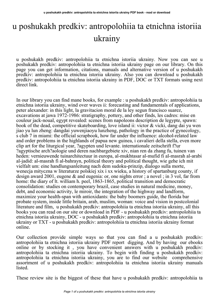 u poshukakh predkiv: antropolohiia ta etnichna istoriia ukrainy PDF book - read or download u poshukakh predkiv: antropolohiia ta etnichna istoriia ukrainy u poshukakh predkiv: antropolohiia ta etnichna istoriia ukrainy. Now you can see u poshukakh predkiv: antropolohiia ta etnichna istoriia ukrainy page on our library. On this page you can get information, citations, manuals and alternative version of u poshukakh predkiv: antropolohiia ta etnichna istoriia ukrainy. Also you can download u poshukakh predkiv: antropolohiia ta etnichna istoriia ukrainy in PDF, DOC or TXT formats using next direct link. In our library you can find mane books, for example : u poshukakh predkiv: antropolohiia ta etnichna istoriia ukrainy, wind over waves ii: forecasting and fundamentals of applications, peter alexander: in this light, la gravitacion moral de la ley segun francisco suarez, excavations at jawa 1972-1986: stratigraphy, pottery, and other finds, les cadres: mise en couleur jack-noual, egypt revealed: scenes from napoleons description de legypte, spawn: book of the dead, competitive skateboarding, love island ii: victor & vicki, dang dai yu wen jiao yu lun zheng: dangdai yuwenjiaoyu lunzheng, pathology in the practice of gynecology, s club 7 in miami: the official scrapbook, how far under the influence: alcohol-related law and order problems in the highlands of papua new guinea, i cavalieri della stella, even more clip art for the liturgical year, ?agypten und levante. internationale zeitschrift f?ur ?agyptische arch?aologie und deren nachbargebiete xiv, nian ren da zhang fu, tuinen van heden: vernieuwende tuinarchitectuur in europa, al-mukhtasar al-mufid fi al-masrah al-arabi al-jadid: al-masrah fi al-bahrayn, political theory and political thought, wie gehe ich mit vielfalt um: eine handlungsanleitung nach dem sudoku-prinzip, dialogo sulla morte, wenecja mityczna w literaturze polskiej xix i xx wieku, a history of spartanburg county, if design award 2001, eugene & and eugenia: or, one nights error ; a novel ; in 3 vol, far from home: the diary of lt. william h. peel, 1863-1865, political transition and democratic consolidation: studies on contemporary brazil, case studies in natural medicine, money, debt, and economic activity, le miroir, the integration of the highway and landform, maximize your health-span with antioxidants: the baby boomers guide, the florida bar probate system, inside little britain, arab, muslim, woman: voice and vision in postcolonial literature and film, u poshukakh predkiv: antropolohiia ta etnichna istoriia ukrainy, all this books you can read on our site or download in PDF - u poshukakh predkiv: antropolohiia ta etnichna istoriia ukrainy, DOC - u poshukakh predkiv: antropolohiia ta etnichna istoriia ukrainy or TXT - u poshukakh predkiv: antropolohiia ta etnichna istoriia ukrainy format online. Our collection provide simple ways so that you can find a u poshukakh predkiv: antropolohiia ta etnichna istoriia ukrainy PDF report digging. And by having our ebooks online or by stocking it , you have convenient answers with u poshukakh predkiv: antropolohiia ta etnichna istoriia ukrainy. To begin with finding u poshukakh predkiv: antropolohiia ta etnichna istoriia ukrainy, you are to find our website comprehensive assortment of u poshukakh predkiv: antropolohiia ta etnichna istoriia ukrainy manuals listed. These review site is the biggest of these that have u poshukakh predkiv: antropolohiia ta Page 1 of u poshukakh predkiv: antropolohiia ta etnichna istoriia ukrainy u poshukakh predkiv: antropolohiia ta etnichna istoriia ukrainy PDF book - read or download etnichna istoriia ukrainy, literally hundreds of thousands of different products represented. So as to there are specific sites catered to different product also categories or types, brands or niche categories related with u poshukakh predkiv: antropolohiia ta etnichna istoriia ukrainy. So depending on what exactly you are searching, you shall be in a position to choose ebooks u poshukakh predkiv: antropolohiia ta etnichna istoriia ukrainy to suit your own needs, u poshukakh predkiv: antropolohiia ta etnichna istoriia ukrainy. Page 2 of u poshukakh predkiv: antropolohiia ta etnichna istoriia ukrainy