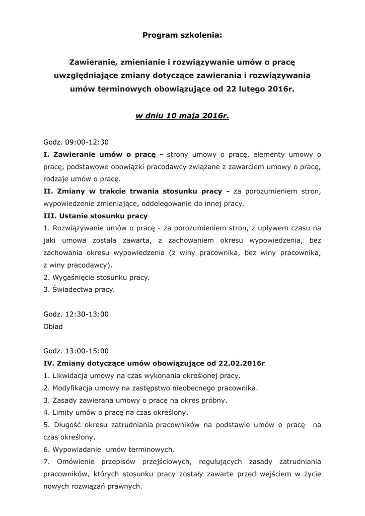 Program szkolenia: Zawieranie, zmienianie i rozwiązywanie umów o pracę uwzględniające zmiany dotyczące zawierania i rozwiązywania umów terminowych obowiązujące od 22 lutego 2016r. w dniu 10 maja 2016r. Godz. 09:00-12:30 I. Zawieranie umów o pracę - strony umowy o pracę, elementy umowy o pracę, podstawowe obowiązki pracodawcy związane z zawarciem umowy o pracę, rodzaje umów o pracę. II. Zmiany w trakcie trwania stosunku pracy - za porozumieniem stron, wypowiedzenie zmieniające, oddelegowanie do innej pracy. III. Ustanie stosunku pracy 1. Rozwiązywanie umów o pracę - za porozumieniem stron, z upływem czasu na jaki umowa została zawarta, z zachowaniem okresu wypowiedzenia, bez zachowania okresu wypowiedzenia (z winy pracownika, bez winy pracownika, z winy pracodawcy). 2. Wygaśnięcie stosunku pracy. 3. Świadectwa pracy. Godz. 12:30-13:00 Obiad Godz. 13:00-15:00 IV. Zmiany dotyczące umów obowiązujące od 22.02.2016r 1. Likwidacja umowy na czas wykonania określonej pracy. 2. Modyfikacja umowy na zastępstwo nieobecnego pracownika. 3. Zasady zawierana umowy o pracę na okres próbny. 4. Limity umów o pracę na czas określony. 5. Długość okresu zatrudniania pracowników na podstawie umów o pracę na czas określony. 6. Wypowiadanie umów terminowych. 7. Omówienie przepisów przejściowych, regulujących zasady zatrudniania pracowników, których stosunku pracy zostały zawarte przed wejściem w życie nowych rozwiązań prawnych.