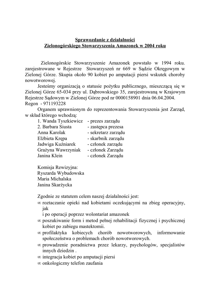 Sprawozdanie z działalności Zielonogórskiego Stowarzyszenia Amazonek w 2004 roku Zielonogórskie Stowarzyszenie Amazonek powstało w 1994 roku. zarejestrowane w Rejestrze Stowarzyszeń nr 669 w Sądzie Okręgowym w Zielonej Górze. Skupia około 90 kobiet po amputacji piersi wskutek choroby nowotworowej. Jesteśmy organizacją o statusie pożytku publicznego, mieszczącą się w Zielonej Górze 65-034 przy ul. Dąbrowskiego 35, zarejestrowaną w Krajowym Rejestrze Sądowym w Zielonej Górze pod nr 0000158901 dnia 06.04.2004. Regon - 971193228 Organem uprawnionym do reprezentowania Stowarzyszenia jest Zarząd, w skład którego wchodzą: 1. Wanda Tyszkiewicz - prezes zarządu 2. Barbara Siusta - zastępca prezesa Anna Karolak - sekretarz zarządu Elżbieta Krępa - skarbnik zarządu Jadwiga Kuźniarek - członek zarządu Grażyna Wawrzyniak - członek Zarządu Janina Klein - członek Zarządu Komisja Rewizyjna: Ryszarda Wybudowska Maria Michalska Janina Skarżycka Zgodnie ze statutem celem naszej działalności jest: • roztaczanie opieki nad kobietami oczekującymi na zbieg operacyjny, jak i po operacji poprzez wolontariat amazonek • poszukiwanie form i metod pełnej rehabilitacji fizycznej i psychicznej kobiet po zabiegu mastektomii. • profilaktyka kobiecych chorób nowotworowych, informowanie społeczeństwa o problemach chorób nowotworowych. • prowadzenie poradnictwa przez lekarzy, psychologów, specjalistów innych dziedzin . • integracja kobiet po amputacji piersi • onkologiczny telefon zaufania W Stowarzyszeniu działa grupa 9 ochotniczek przeszkolonych na kursach I i II stopnia, które wspierają psychicznie kobiety przed i po zabiegu amputacji piersi, udzielaja praktycznych wskazówek, wręczają poradniki dla amazonek. Ochotniczki chodzą systematycznie (dwa razy w tygodniu) do szpitala. W 2004 roku przeszkolono 2 ochotniczki na kursie I-go stopina i 2 na kursie II-go stopnia. Rehabilitację psychiczną prowadzi zatrudniony na umowę- zlecenie psycholog-terapeuta, przeszkolony w 2004 roku przez Federację Polskich Klubów Kobiet po Mastektomii. W 2004 roku odbywały się raz w tygodniu w dwóch grupach zajęcia z psychologiem, istniała też możliwość skorzystania z terapii indywidualnej. Nowością wprowadzoną w 2004 roku były warsztaty psychologiczne dla ochotniczek. Raz w miesiącu odbywały się spotkania, na których ochotniczki korzystały z pomocy psychologa w radzeniu sobie z problemami i sytuacjami wynikającymi ze spotkań z chorymi kobietami. Bardzo ważnym elementem działalności Stowarzyszenia jest rehabilitacja fizyczna poprzez gimnastykę korekcyjną, masaż limfatyczny oraz zajęcia na basenie. Posiadamy własną salę rehabilitacyjną przy Szpitalu Wojewódzkim w Zielonej Górze wyposażoną w potrzebny sprzęt. Zatrudniamy na umowęzlecenie rehabilitantkę przeszkoloną przez Instytut Onkologii. Amazonki gimnastykują się 2 razy w tygodniu w dwóch grupach w sali rehabilitacyjnej, tam też raz w tygodniu korzystają z masażu limfatycznego. Również raz w tygodniu odbywają się zajęcia na basenie. Następnym kierunkiem działania Zielonogórskiego Stowarzyszenia Amazonek jest profilaktyka kobiecych chorób nowotworowych. Stowarzyszenie aktywnie uczestniczy we wszelkich inicjatywach mających na celu uświadomienie społeczeństwu zagrożeń tymi chorobami. Czynimy to między innymi poprzez wygłaszanie pogadanek na spotkaniach z uczniami szkół średnich i studentami Uniwersytetu Zielonogórskiego a także z dorosłymi mieszkańcami naszego miasta. Kilkakrotnie mówiłyśmy o profilaktyce i działalności Stowarzyszenia w prasie, radio i telewizji. Stowarzyszenie działa również na rzecz integracji środowiska kobiet po amputacji piersi poprzez organizowanie cotygodniowych spotkań w naszej siedzibie. Problematyka tych spotkań jest bardzo różnorodna, poruszająca istotne dla kobiet problemy i zagadnienia. Stowarzyszenie dysponuje lokalem, w którym odbywają się spotkania. Funkcjonuje biuro Stowarzyszenia, codziennie pełnione są dyżury, a także działa onkologiczny telefon zaufania - stacjonarny i komórkowy umożliwiający osobom zainteresowanym kontakt i uzyskanie wszelkich informacji. Współpracujemy z ościennymi Stowarzyszeniami Amazonek oraz innymi organizacjami i stowarzyszeniami działającymi na rzecz osób niepełnosprawnych w kraju i za granicą ( Guben i Cottbus ). Przedstawicielki Stowarzyszenia uczestniczyły w szkoleniach i konferencjach dotyczących pisania projektów, ustalania zasad i form współpracy samorządów z organizacjami pozarządowymi, spotkaniach organizacji działających na rzecz kobiet. Rok 2004 był rokiem jubileuszu X-lecia istnienia Zielonogórskiego Stowarzyszenia Amazonek. Wymagało to wielkiej pracy i dzięki zaangażowaniu Zarządu, komitetu organizacyjnego i członkiń Stowarzyszenia 23-go października 2004 odbył się Koncert Nadziei w Filharmonii Zielonogórskiej. Uczestniczyło w nim wielu zaproszonych gości, przedstawicieli władz, mieszkańców Zielonej ory, bardzo liczne delegacje stowarzyszeń amazonek z kraju, delegacje z Guben i Cottbus, łącznie 400 osób. Stowarzyszenie nasze za pracę na rzecz kobiet zostało odznaczone przez panią wicemarszałek Senatu Jolantę Danielak Srebrnym Medalem Senatu. Bilans Stowarzyszenia na dzień 31.12.2004r. wykazuje zysk w kwocie 12.451,39 zł. Przychody uzyskaliśmy z następujących źródeł: 1. Składki członkowskie 7.489,82 2. Środki pochodzące z budżetu państwa i gminy 16.999,70 w tym: • Urząd Miasta Zielona Góra ( na rehabilitację fizyczną kobiet po mastektomii) 7.000,00 • Lubuski Urząd Marszałkowski ( na rehabilitację psychiczna kobiet po mastektomii) 5.000,00 • Miejski Ośr. Pomocy Społecznej Zielona Góra ( na organizację obchodów X-lecia Stowarzyszenia ) 4.499,70 • Urząd Miasta Zielona Góra - prezydent ( dofinans. Org.obchodów X-lecia Stow.) 500,00 3. Darowizny od osób prawnych 13.750,00 4. Darowizn