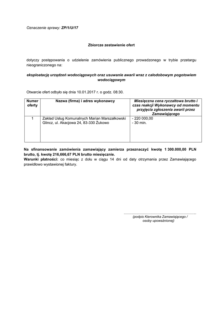 Oznaczenie sprawy: ZP/1/U/17 Zbiorcze zestawienie ofert dotyczy postępowania o udzielenie zamówienia publicznego prowadzonego w trybie przetargu nieograniczonego na: eksploatację urządzeń wodociągowych oraz usuwanie awarii wraz z całodobowym pogotowiem wodociągowym Otwarcie ofert odbyło się dnia 10.01.2017 r. o godz. 08:30. Numer oferty Nazwa (firma) i adres wykonawcy 1 Zakład Usług Komunalnych Marian Marszałkowski Glincz, ul. Akacjowa 24, 83-330 Żukowo Miesięczna cena ryczałtowa brutto i czas reakcji Wykonawcy od momentu przyjęcia zgłoszenia awarii przez Zamawiającego - 220 000,00 - 30 min. Na sfinansowanie zamówienia zamawiający zamierza przeznaczyć kwotę 1 300.000,00 PLN brutto, tj. kwotę 216,666,67 PLN brutto miesięcznie. Warunki płatności: co miesiąc z dołu w ciągu 14 dni od daty otrzymania przez Zamawiającego prawidłowo wystawionej faktury. ……………………………………………………….. (podpis Kierownika Zamawiającego / osoby upoważnionej)