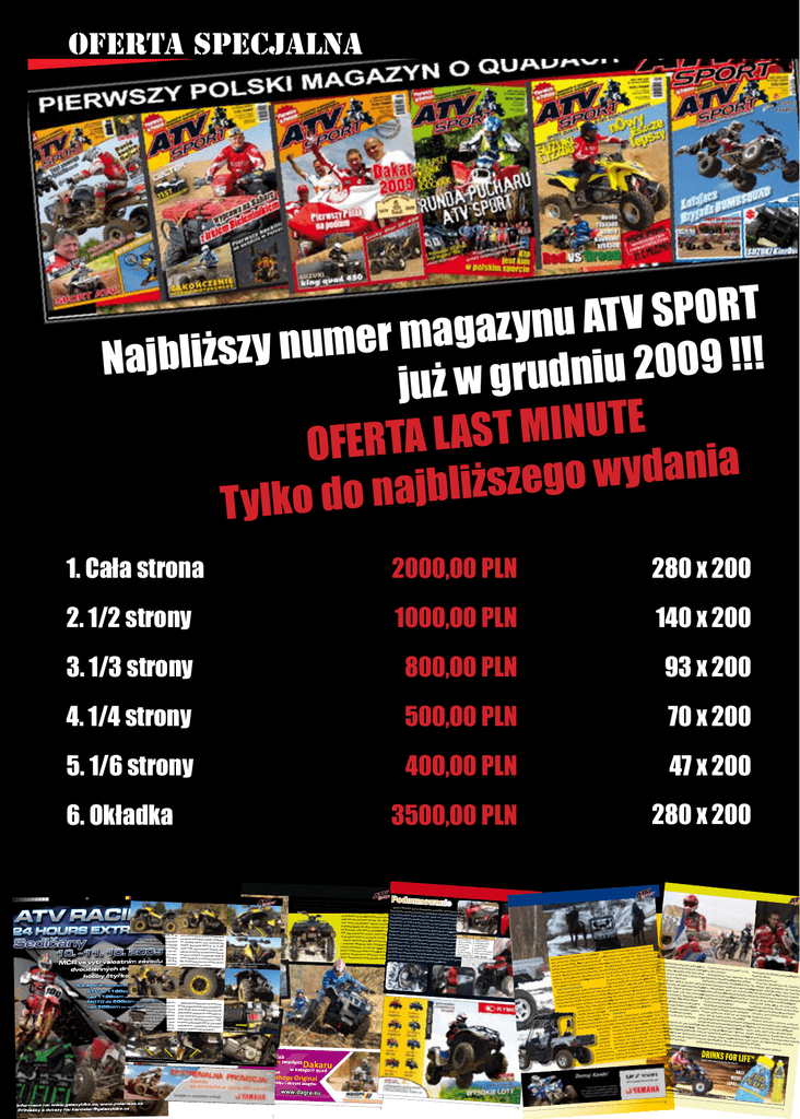 OFERTA SPECJALNA T R O P S V T A u n zy a g a m r e m u n ! ! ! 9 Najbliższy 0 0 2 u i n d już w gru E T U N I M T S A L OFERTA a i n a d y w o g e z żs i l b j a n o d o k l y T 1. Cała strona 2000,00 PLN 280 x 200 2. 1/2 strony 1000,00 PLN 140 x 200 3. 1/3 strony 800,00 PLN 93 x 200 4. 1/4 strony 500,00 PLN 70 x 200 5. 1/6 strony 400,00 PLN 47 x 200 3500,00 PLN 280 x 200 6. Okładka Podsumowanie Kazuma nawiązujedużych do quadów japońskich zania zwiększego, ale starszego modelu Prairie z niezależnym zawieszeniem, Kawasaki a jest 650. generalnie prościej Kymco MXU500 4x4 skromniej i skonstruowany, Zacznijmy od to prawdziwy, porządny wyglądubudowy i obu modeli.bez wstydu terenowiec, który czerpiąc rozwią może konkurować - Kawasaki jest odrobinę staromodny. z pojazdami japońskic Lampy w tej samej klasie h konkurentów pojemnościowej. Silnik prostokątne niczymczterokołowcach w sprzeddo szybkiej jazdy ma po bezdrożach, a właściwo wystarczającą moc piętnastu lat, kanciaste plastiki. Ale czy ko-to przyzwoite, że ści terenowe są na nawet przez chwilę tyle muś może przeszkadzać? Raczej nie nie pomyśleliśmy powinno, przedniego mostu, o blokadzie której konstruktorzy bopojazd do jazdy wtrudnym terenie nie musiOgólna nie przewidzieli w ocena jest Kymco. dobra, szczególnie się lansować, tylko dobrze działać, dzięki jakości materiałó reflektory a kładności wykonan do- w i ia. Mały minus za tylne KVF dają przyzwoite światło, nawet lepsze zawieszenie i nurkujący przód, niż co nie nieco ogranicza Plusy w okrągłych lampach nowszych modeli. Być możliwości szybkiej może rozwiązaniem jazdy po bezdroża twysokBKBkoś ch. problemu Kazuma wporównaniu do ć byłoby zastosowanie KVF jest ładniejszazawieszenia z tciekawZEFTJgn niezależn tyłu, co firma Kymco ego – nawiązuje do dobrego stylu Grizzly,nawet opracowuje na sezon tmocnZTJMOJL MXU500 jeszcze nie a 2009. wszedł do światowe tIPNPMPHBDKB można powiedzieć, że wzoruje się j elity, ale jego na bu - pretendować. Cena na ErogoXB poziomie 25900 złotych zaczyna do niej dowie. Lampy są podobnie okrągłe, obok a nich model Kymco do poziomu zbliża największ tczytFMnZMJD[OJL y cen pojazdów japońskic sprytnie wbudowano estetyczne kierunkow tEPCSBzwrotność - jest silna. Sporą zachętą h, do kupna będzie homologa tu konkurencja skazy. Wtestowanej wersji plastiki wykonano której nie oferuje większość acja drogowa, producentów japońskic h. dobre prowadzenie powodują, że na mocy na hamowni, jednak oznakowania DPS torze zachowywał się jak rasowy sporna samym pojeździe rozwiały wątpliwotowiec. Jednak cały czas trzeba się mieć ści. Według zapisu, moc testowanego na baczności, bo wspomaganie wymaga modelu Renegade 800X XC to 53 kW, przyzwyczajenia, a potężną moc trzeba czyli 71 KM. Już po naszych jazdach, okaumieć opanować. Wszystkich nas nur- zało się, że pomiar na hamowni wykonał towało, czy silnik faktycznie ma moc serwis w Czechach, a wynik jaki osiągnął 85 KM, jak zapowiadali marketingowcy ich Renegade XC w symulacji wyniósł 74 Can-Am'a. W porównaniu do modelu KM. W symulacji, bo moc na kole nie jest Połączenie żółtych i czarnych 2008 z silnikiem 64KM, przyśpieszenie plastików przecież równa mocy silnika. tworzy ciekawy styl modelu XC Minusy tOBETterowność tOJFTUBCJMnZQrzZ NBLTZNBMnyDI QrǗEkPǴDJBDI tróȈOJDFXzestrPKFOJV zawieszFOJBQrzFE- owym . lcem zjazd ożen ia: z lt hamu mati c V-be naste pując e przeł i - Ultra zny (R) to bar ksza mam y ową. Zwię Do” wybo ru szybkie (H), bieg wstecjest jedną onność użytk na ładowność „paki (L), giwana wszechstr ymal przy - terenowe al (N) – całość obsłu owe do waż maks lemów etap. dzo, ponie Do coużytk te srebrnym oraz neutr sprawia prob agającychLudzie byli zbyt zmęcz d 180kg. tego, , która nie eni, żeby jechać pokry ścigać. Tomusia iej wym wynosi pona się i – Chyba łoby się źle skońc e felgi, fotele e w onym dźwigienką ożenia. Dla bardz ngo - dali parki iniow Francuzi ie przeł zyć. Dlategślisz mało czasu szeniczerw ze hamulec łożono alum o o Meca System się nie spisali? Co myna zdał przejazd, żeby , gazowe zawiel limitowany „Spor tzmianł zamontowany jeszc wanie ztyłu, testów niewyzwanie, ale zas materiałem zosta mode ale zębatkę oszczę to podc nie zrobili etapu było jakieś – Doświadczen ? k nie i jest iu jedna dojechać do Po gnięc – Miałeś chwile dziło mierzonego. ie było odwro zacią mogłe zwykłej wersj (P), który i m kolorze. Wkońcuco mety. oczekiwania zwątpienia? prawda od mu zada nia. górki entów, wy wdół.– Nie ego który z . Nawaliło to,wyglą tne niż nasze– Z połam elem i n”, się u kilku erzon ało Editio wątpi łem wsiebie co powi aną tarczą? Najbardziej m oprócz kolor ej ą, Rhino zsuw , miałem jakieś zadziwiało mnie,dało solidnie. – Po za renowobawy , czy dam radę, różni się niczy tym jajeździ hamulca rączk i odpotrzeb jazdy te z przodu trzyma niale. albo konstr że ukcja Nie ch ale wspa łem jak nigdy tylny żeby się wycof jąca urządzenia, nie ia kół dlatego, że zależ nośc ale wygląda y mimo, żewyglą nie potrafiłem, „złotówa” ać. Słabym punkt pomyślałem, h, napędzan , -czteroW całą nawigację, dwa pojazd ja, tylko oszczędzać awar yjnyc dała słabo, ale musiałem cylindrowy em nie byłem y możliwość W Jedno serce, cjach nieste jedno mam silnik. ze ale sytua wszyst jest ty zony quad. Cały czas wytrz du I jadąc, tylny kie wibrac chłod czterech. może się jeszc nie był tak potrze tak o to, czy. on Duszą pojaz przebitych tiresba ymała hamulec kierowca wszystkich ności 660 cm³, wtrys- k pali cały quad mocno je. Od wytrzyma. Najlep martwiłem cowy bny. końco o pojem Na wych lls-ówskrzyn emalnych różni silnik zny że ekstr wy ciągnę wibrow ronic anizm szy też etapac ia biegów też suwo dowód li mnie przez ny ał.przebi czy mech Po ciu ko