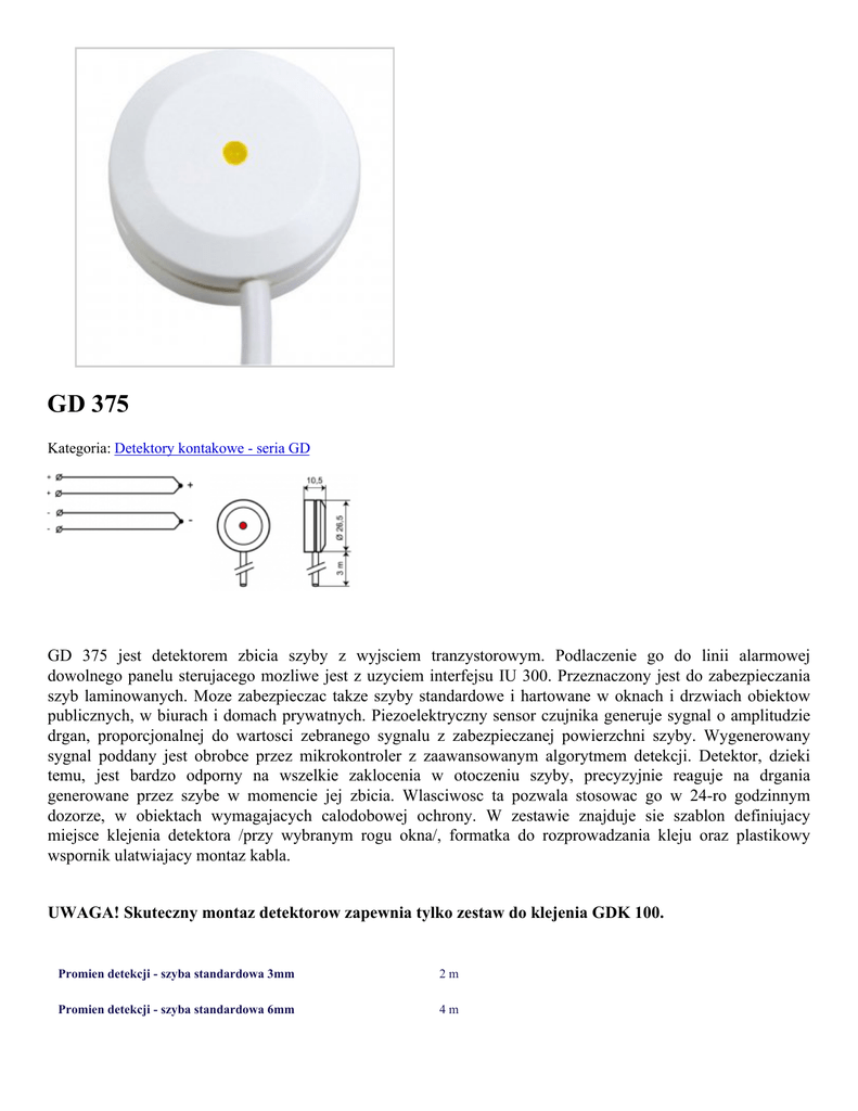 GD 375 Kategoria: Detektory kontakowe - seria GD GD 375 jest detektorem zbicia szyby z wyjsciem tranzystorowym. Podlaczenie go do linii alarmowej dowolnego panelu sterujacego mozliwe jest z uzyciem interfejsu IU 300. Przeznaczony jest do zabezpieczania szyb laminowanych. Moze zabezpieczac takze szyby standardowe i hartowane w oknach i drzwiach obiektow publicznych, w biurach i domach prywatnych. Piezoelektryczny sensor czujnika generuje sygnal o amplitudzie drgan, proporcjonalnej do wartosci zebranego sygnalu z zabezpieczanej powierzchni szyby. Wygenerowany sygnal poddany jest obrobce przez mikrokontroler z zaawansowanym algorytmem detekcji. Detektor, dzieki temu, jest bardzo odporny na wszelkie zaklocenia w otoczeniu szyby, precyzyjnie reaguje na drgania generowane przez szybe w momencie jej zbicia. Wlasciwosc ta pozwala stosowac go w 24-ro godzinnym dozorze, w obiektach wymagajacych calodobowej ochrony. W zestawie znajduje sie szablon definiujacy miejsce klejenia detektora /przy wybranym rogu okna/, formatka do rozprowadzania kleju oraz plastikowy wspornik ulatwiajacy montaz kabla. UWAGA! Skuteczny montaz detektorow zapewnia tylko zestaw do klejenia GDK 100. Promien detekcji - szyba standardowa 3mm 2m Promien detekcji - szyba standardowa 6mm 4m Napiecie zasilania 4 - 15 VDC Pobor pradu w czasie czuwania 5 ?A Pobor pradu w czasie alarmu 7 mA Sygnalizacja alarmu Dioda LED Czas podtrzymania alarmu Zatrzask Petla sabotazowa Tak Kasowanie alarmu Zdjecie zasilania Podlaczanie Kabel Obudowa / kolor Plastikowa ABS / bialy, brazowy Temperatura pracy -25 ÷ +55°C Kategoria ochrony budowy IP 67 Wymiary (H x ? ) mm 11x27 Dlugosc kabla m 3 Atesty Zgodny z CE