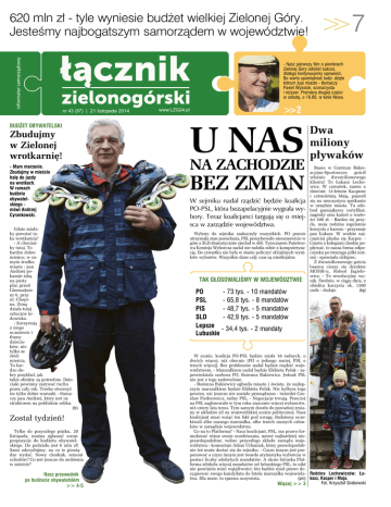 620 mln zł - tyle wyniesie budżet wielkiej Zielonej Góry. Jesteśmy najbogatszym samorządem w województwie! >>7 - Nasz pierwszy film o pionierach Zielonej Góry odniósł sukces, dlatego kontynuujemy opowieść. Bo warto upamiętniać ludzi, dzięki którym żyje miasto - tłumaczy Paweł Wysocki, scenarzysta i reżyser. Premiera drugiej części w sobotę, o 16.00, w kinie Newa. nr 43 (97) | 21 listopada 2014 BUDŻET OBYWATELSKI >>2 U NAS NA ZACHODZIE Zbudujmy w Zielonej wrotkarnię! - Mam marzenie. Zbudujmy w mieście halę do jazdy na wrotkach. W ramach budżetu obywatelskiego mówi Andrzej Cyrankowski. BEZ ZMIAN W sejmiku nadal rządzić będzie koalicja PO-PSL, która bezapelacyjnie wygrała wybory. Teraz koalicjanci targują się o miejsca w zarządzie województwa. Gdzie miałaby powstać taka wrotkarnia? - A chociażby tutaj. To bardzo dobre miejsce, w samym środku miasta - pan Andrzej pokazuje ręką na pusty plac przed Gimnazjum nr 6, przy ul. Chopina. Zimą działa tutaj sztuczne lodowisko. - Korzystają z niego uczniowie i tłumy dzieciaków, nie tylko ze śródmieścia. To bardzo dobry przykład, jak takie obiekty są potrzebne. Dzieciaki powinny zażywać ruchu przez cały rok. Trzeba stworzyć im tylko dobre warunki - tłumaczy pan Andrzej, który jest instruktorem na pobliskim orliku. (tc) Został tydzień! Tylko do przyszłego piątku, 28 listopada, można zgłaszać swoje propozycje do budżetu obywatelskiego. Do podziału jest 6 mln zł! Sami zdecydujmy, na co te pieniądze wydać. Nowy chodnik, remont schodów? Co jest jeszcze do zrobienia w mieście? Nasz przewodnik po budżecie obywatelskim >> 4-5 Wybory do sejmiku zaskoczyły wszystkich. PO prawie utrzymała stan posiadania, PSL poszybowało niesamowicie w górę a SLD dramatycznie zjechał w dół. Tymczasem Państwowa Komisja Wyborcza nadal nie radziła sobie z komputeryzacją. Do czwartku nie była w stanie policzyć oficjalnych wyników wyborów. Wszystkie dane cały czas są nieoficjalne. TAK GŁOSOWALIŚMY W WOJEWÓDZTWIE PO - 73 tys. - 10 mandatów PSL - 65,8 tys. - 8 mandatów PIS - 48,7 tys. - 5 mandatów SLD - 42,9 tys. - 5 mandatów Lepsze - 34,4 tys. - 2 mandaty Lubuskie Dwa miliony pływaków Basen w Centrum Rekreacyjno-Sportowym gościł właśnie dwumilionowego klienta! To Łukasz Lechowicz. W czwartek, razem z dziećmi: 13-letnim Kacprem i czteroletnią Mają, pojawił się na uroczystym spotkaniu w urzędzie miasta. Tu odebrał pamiątkowy certyfikat, nagrody oraz karnet o wartości 500 zł. - Bardzo się przyda, moja rodzina regularnie korzysta z basenu - przyznaje pan Łukasz. W wodzie najczęściej pluska się Kacper. Często z kolegami chodzę popływać, to nasza forma odpoczynku po treningu piłki nożnej - opowiada chłopiec. Z dwumilionowego gościa basenu cieszy się dyrektor MOSiR-u, Robert Jagiełowicz. - To rewelacyjny wynik. Średnio, w ciągu dnia, z obiektu korzysta ok. 1300 osób - dodaje. (kg) W sumie, koalicja PO-PSL będzie miała 18 radnych, o dwóch więcej, niż obecnie (PO o jednego mniej, PSL o trzech więcej). Bez problemów nadal będzie rządzić województwem. - Marszałkiem nadal będzie Elżbieta Polak - zapowiedziała szefowa PO, Bożenna Bukiewicz. Jednak PSL nie jest z tego zadowolone. - Bożenna Bukiewicz ogłosiła miastu i światu, że najlepszym marszałkiem będzie Elżbieta Polak. Nie byłbym tego pewien, nic jeszcze nie zostało przesądzone - twierdzi Czesław Fiedorowicz, radny PSL. - Negocjacje trwają. Przecież na PSL zagłosowało w tym roku znacznie więcej wyborców, niż cztery lata temu. Tym samym doszło do poważnej zmiany w układzie sił na wojewódzkiej scenie politycznej. Nasz koalicjant musi wziąć ten fakt pod uwagę. Będziemy oczekiwali albo naszego marszałka, albo trzech naszych członków w zarządzie województwa. Co na to Platforma? - Nasz koalicjant, PSL, ma prawo formułować różne swoje oczekiwania, nawet najbardziej nieprawdopodobne, wobec przyszłego składu zarządu województwa - komentuje Adam Urbaniak, który prawdopodobnie też może dostać się do sejmiku. - Czym innym jest proponować a czym innym jest twarda arytmetyka wyborcza w postaci liczby zdobytych mandatów. A skoro lubuska Platforma zdobyła więcej mandatów od lubuskiego PSL, to nikt nie powinien mieć wątpliwości: kto będzie miał prawo desygnować swego kandydata do fotela marszałka wojewódz- Rodzina Lechowiczów: Łutwa. Dla mnie, to sprawa oczywista. (pm) kasz, Kacper i Maja. Fot. Krzysztof Grabowski Więcej >> 3 2 łącznik zielonogórski | 21 listopada 2014 www.Lzg24.pl Z Z Y C I A M I A S T A I G M I N Y >>>>> Raculska świetlica, po remoncie, tętni życiem! Niedawno odbyła się tu promocja książki Zama Believingooda „Życie Jadzi według mnie”. Goście spotkali się z autorem i wysłuchali koncertu. Fot. Materiały wydawcy/MW SKALA Piotr Wower W ZIELONEJ GÓRZE W ZIELONEJ GÓRZE Nie tylko o snach Pokolędujmy! Dziś, piątek, 21 listopada, o 11.00, w Galerii Grafiki Biblioteki Sztuki (Wydział Artystyczny, ul. Wiśniowa 10) odbędzie się otwarcie wystawy Małgorzaty Rekusz, poznańskiej artystki. Autorka pokaże prace z cyklu Nie tylko sny. W programie także wykład pt. „Nie tylko sny - wklęsłodruki”. (dsp) ZOK zaprasza szkoły podstawowe i gimnazja na eliminacje miejskie XXV Spotkań Grup Kolędniczych i Jasełkowych, które odbędą się 15 grudnia w Hydro(za)gadce. Zgłoszenia do 2 grudnia: Zielonogórski Ośrodek Kultury, ul. Festiwalowa 3, 65520 Zielona Góra. Szczegóły na: www.zok.com.pl (dsp) W ZIELONEJ GÓRZE W ZIELONEJ GÓRZE Bajka o zwierzakach Turniej tenisa stołowego Biblioteka im. C. Norwida zaprasza na bajkę w wykonaniu Teatru Idy Ochockiej pt. „Kociopsik” - w tę sobotę, 22 listopada oraz w przyszłą, 29 listopada, o 12.00 w sali Dębowej biblioteki przy al. Wojska Polskiego. Wstęp wolny - ilość miejsc ograniczona. Spektakl dla widzów od 3 lat. (dsp) MOSiR zaprasza w niedzielę, 23 listopada, na