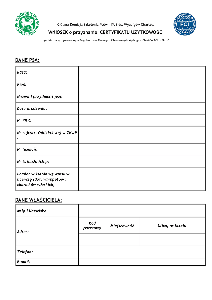Główna Komisja Szkolenia Psów - KUS ds. Wyścigów Chartów WNIOSEK o przyznanie CERTYFIKATU UŻYTKOWOŚCI zgodnie z Międzynarodowym Regulaminem Torowych i Terenowych Wyścigów Chartów FCI - Pkt. 6 DANE PSA: Rasa: Pł eć : Nazwa i przydomek psa: Data urodzenia: Nr PKR: Nr rejestr. Oddział owej w ZKwP : Nr licencji: Nr tatuaż u /chip: Pomiar w kłę bie wg wpisu w licencję (dot. whippetó w i charcikó w wł oskich) DANE WŁAŚCICIELA: Imię i Nazwisko: Adres: Telefon: E-mail: Kod pocztowy Miejscowość Ulica, nr lokalu Główna Komisja Szkolenia Psów - KUS ds. Wyścigów Chartów WNIOSEK o przyznanie CERTYFIKATU UŻYTKOWOŚCI zgodnie z Międzynarodowym Regulaminem Torowych i Terenowych Wyścigów Chartów FCI - Pkt. 6 DANE PSA Z ZAWODÓW: Dot.: COURSINGU Zawody, w których pies uplasował się co najmniej dwukrotnie w pierwszej połowie stawki uczestników Lp Nazwa zawodów z prawem do wniosku CACIL Miejsce Zawodów Data Zawodów Typ zawodów Lokata Ilość psów w stawce Dodatkowe wymagania Nie mniej niż 75% punktów możliwych do zdobycia podczas zawodów Wynik max. ilość punktów możliwych do zdobycia 1. 2. Uczestnictwo w Międzynarodowych Zawodach z prawem do wniosku CACIL Lp Nazwa zawodów z prawem do wniosku CACIL Miejsce Zawodów: Data Zawodów Miejscowość /Kraj Lokata psa na zawodach Ilość psów w stawce, uczestniczący ch w dniu zawodów Okres miedzy datą najwcześniej rozgrywanych zawodów z wniosku , a najpóźniej, jednak nie mniej niż 1 rok i 1 dzień 3. 4. DATA: ……………………………………………….. PODPIS: ………………………………………………….. Główna Komisja Szkolenia Psów - KUS ds. Wyścigów Chartów WNIOSEK o przyznanie CERTYFIKATU UŻYTKOWOŚCI zgodnie z Międzynarodowym Regulaminem Torowych i Terenowych Wyścigów Chartów FCI - Pkt. 6 ZAŁĄCZNIKI : - ksero licencji, książeczki licencyjnej ( strona z danymi psa, strony z wynikami z zawodów, strona z potwierdzoną opłatą członkowską) z potwierdzeniem zgodności z oryginałem przez oddział macierzysty - ksero rodowodu psa Wszystkie dokumenty należy wysłać za pomocą poczty elektronicznej na adres [email protected]