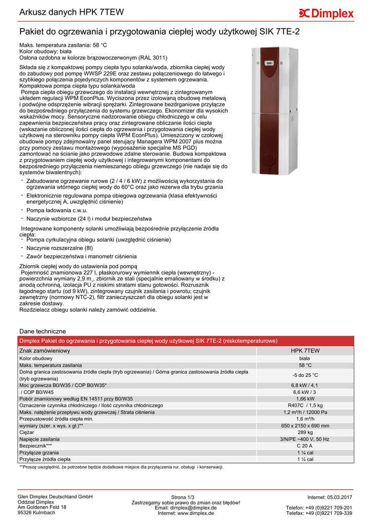 Arkusz danych HPK 7TEW Pakiet do ogrzewania i przygotowania ciepłej wody użytkowej SIK 7TE-2 Maks. temperatura zasilania: 58 °C Kolor obudowy: biała Osłona ozdobna w kolorze brązowoczerwonym (RAL 3011) Składa się z kompaktowej pompy ciepła typu solanka/woda, zbiornika ciepłej wody do zabudowy pod pompę WWSP 229E oraz zestawu połączeniowego do łatwego i szybkiego połączenia pojedynczych komponentów z systemem ogrzewania. Kompaktowa pompa ciepła typu solanka/woda Pompa ciepła obiegu grzewczego do instalacji wewnętrznej z zintegrowanym układem regulacji WPM EconPlus. Wyciszona przez izolowaną obudowę metalową i podwójne odsprzężenie wibracji sprężarki. Zintegrowane bezdrganiowe przyłącze do bezpośredniego przyłączenia do systemu grzewczego. Ekonomizer dla wysokich wskaźników mocy. Sensoryczne nadzorowanie obiegu chłodniczego w celu zapewnienia bezpieczeństwa pracy oraz zintegrowane obliczanie ilości ciepła (wskazanie obliczonej ilości ciepła do ogrzewania i przygotowania ciepłej wody użytkowej na sterowniku pompy ciepła WPM EconPlus). Umieszczony w czołowej obudowie pompy zdejmowalny panel sterujący Managera WPM 2007 plus można przy pomocy zestawu montażowego (wyposażenie specjalne MS PGD) zamontować na ścianie jako przewodowe zdalne sterowanie. Budowa kompaktowa z przygotowaniem ciepłej wody użytkowej i integrowanymi komponentami do bezpośredniego przyłączenia niemieszanego obiegu grzewczego (nie nadaje się do systemów biwalentnych): - Zabudowane ogrzewanie rurowe (2 / 4 / 6 kW) z możliwością wykorzystania do ogrzewania wtórnego ciepłej wody do 60°C oraz jako rezerwa dla trybu grzania - Elektronicznie regulowana pompa obiegowa ogrzewania (klasa efektywności energetycznej A, uwzględnić ciśnienie) - Pompa ładowania c.w.u. - Naczynie wzbiorcze (24 l) i moduł bezpieczeństwa Integrowane komponenty solanki umożliwiają bezpośrednie przyłączenie źródła ciepła: - Pompa cyrkulacyjna obiegu solanki (uwzględnić ciśnienie) - Naczynie rozszerzalne (8l) - Zawór bezpieczeństwa i manometr ciśnienia Zbiornik ciepłej wody do ustawienia pod pompą Pojemność znamionowa 227 l, płaskorurowy wymiennik ciepła (wewnętrzny) powierzchnia wymiany 2,9 m˛, zbiornik ze stali (specjalnie emaliowany w środku) z anodą ochronną, izolacja PU z niskimi stratami stanu gotowości. Rozrusznik łagodnego startu (od 9 kW), zintegrowany czujnik zasilania i powrotu; czujnik zewnętrzny (normowy NTC-2), filtr zanieczyszczeń dla obiegu solanki jest w zakresie dostawy. Rozdzielacz obiegu solanki należy zamówić oddzielnie. Dane techniczne Dimplex Pakiet do ogrzewania i przygotowania ciepłej wody użytkowej SIK 7TE-2 (niskotemperaturowe) Znak zamówieniowy HPK 7TEW Kolor obudowy Maks. temperatura zasilania Dolna granica zastosowania źródła ciepła (tryb ogrzewania) / Górna granica zastosowania źródła ciepła (tryb ogrzewania) Moc grzewcza B0/W35 / COP B0/W35* / COP B0/W45 Pobór znamionowy według EN 14511 przy B0/W35 Oznaczenie czynnika chłodniczego / Ilość czynnika chłodniczego Maks. natężenie przepływu wody grzewczej / Strata ciśnienia Przepustowość źródła ciepła min. wymiary (szer. x wys. x gł.)** Ciężar Napięcie zasilania Bezpiecznik*** Przyłącze grzania Przyłącze źródła ciepła biała 58 °C -5 do 25 °C 6,8 kW / 4,1 6,6 kW / 3 1,66 kW R407C / 1,5 kg 1,2 m³/h / 12000 Pa 1,6 m³/h 650 x 2150 x 690 mm 289 kg 3/N/PE ~400 V, 50 Hz C 20 A 1 ¼ cal 1 ¼ cal **Proszę uwzględnić, że potrzebne będzie dodatkowe miejsce dla przyłączenia rur, obsługi i konserwacji. Glen Dimplex Deutschland GmbH Oddział Dimplex Am Goldenen Feld 18 95326 Kulmbach Strona 1/3 Zastrzegamy sobie prawo do zmian oraz błędów! Email: [email protected] Internet: www.dimplex.de Internet: 05.03.2017 Telefon: +49 (0)9221 709-201 Telefax: +49 (0)9221 709-339 Arkusz danych HPK 7TEW ***Die Absicherung ist als allpolige Trennvorrichtung auszuführen (gemeinsame Abschaltung aller Phasen)! Glen Dimplex Deutschland GmbH Oddział Dimplex Am Goldenen Feld 18 95326 Kulmbach Strona 2/3 Zastrzegamy sobie prawo do zmian oraz błędów! Email: [email protected] Internet: www.dimplex.de Internet: 05.03.2017 Telefon: +49 (0)9221 709-201 Telefax: +49 (0)9221 709-339 Wyposażenie urządzenia HPK 7TEW Opis Numer Ilości artykułu przykładowe HPK 7TEW 362590 1 SYL 250 352260 AP SVT 348900 SVT 200KV 363860 SVT 300KV 363870 SVT 400KV 363880 AFN 825 328610 PSW 100 PSP 100E VSH KS VSE 32-50 VSE 32-100 VSE 32-150 VSE 32-200 VSE 32-300 351090 353360 343110 362520 362530 362540 362550 362560 NWPM EWPM LWPM 410 AP PGD FG 3115 NTC-10M 356960 356970 339410 356570 336620 363600 Typ-nr Sztuk Cena Pompa ciepła Pakiet do ogrzewania i przygotowania ciepłej wody użytkowej SIK 7TE-2 Elastyczne taśmy izolacyjne do podłożenia Wyposażenie dodatkowe źródła ciepła Zestaw przyłączeniowy rozdzielacza solanki Rozdzielacz obiegu solanki 2-krotny ze złączkami śrubowymi z pierścieniem zaciskowym Rozdzielacz obiegu solanki 3-krotny ze złączkami śrubowymi z pierścieniem zaciskowym Rozdzielacz obiegu solanki 4-krotny ze złączkami śrubowymi z pierścieniem zaciskowym Środek przeciw zamarzaniu dla obiegu solanki 20 l 1 1 3 Akcesoria hydrauliczne Podstawa zbiornika buforowego 100l* Zbiornik buforowy do zabudowy pod pompą* Zestaw połączeniowego grzania* Wstępnie obrobiona rura falista ze stali nierdzewnej DN 32 Wstępnie obrobiona rura falista ze stali nierdzewnej DN 32 Wstępnie obrobiona rura falista ze stali nierdzewnej DN 32 Wstępnie obrobiona rura falista ze stali nierdzewnej DN 32 Wstępnie obrobiona rura falista ze stali nierdzewnej DN 32 Wyposażenie dodatkowe techniki regulacji Rozszerzenie dla podłączenia sieci Ethernet Rozszerzenie dla przyłączenia magistrali KNX/EIB Rozszerzenie dla połączenia typu Modbus Pilot zdalnego sterowania WPM 2006/2007/EconPlus/R* Czujnik temperatury zewnętrznej w obudowie Czujnik temperatury NTC-10 z tuleją 