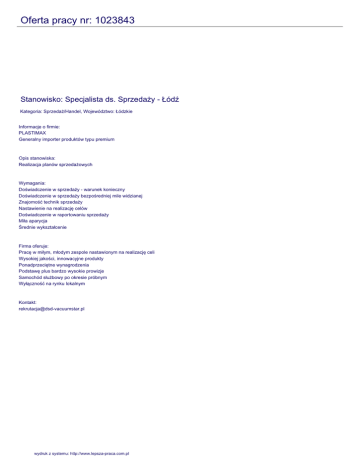 Oferta pracy nr: 1023843 Stanowisko: Specjalista ds. Sprzedaży - Łódź Kategoria: Sprzedaż/Handel, Województwo: Łódzkie Informacje o firmie: PLASTIMAX Generalny importer produktów typu premium Opis stanowiska: Realizacja planów sprzedażowych Wymagania: Doświadczenie w sprzedaży - warunek konieczny Doświadczenie w sprzedaży bezpośredniej mile widzianej Znajomość technik sprzedaży Nastawienie na realizację celów Doświadczenie w raportowaniu sprzedaży Miła aparycja Średnie wykształcenie Firma oferuje: Pracę w miłym, młodym zespole nastawionym na realizację celi Wysokiej jakości, innowacyjne produkty Ponadprzeciętne wynagrodzenia Podstawę plus bardzo wysokie prowizje Samochód służbowy po okresie próbnym Wyłączność na rynku lokalnym Kontakt: [email protected] wydruk z systemu: http://www.lepsza-praca.com.pl