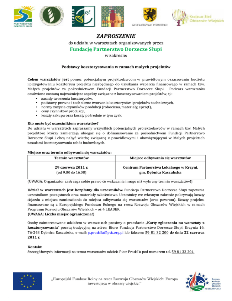 ZAPROSZENIE do udziału w warsztatach organizowanych przez Fundację Partnerstwo Dorzecze Słupi w zakresie: Podstawy kosztorysowania w ramach małych projektów Celem warsztatów jest pomoc potencjalnym projektodawcom w prawidłowym oszacowaniu budżetu i przygotowaniu kosztorysu projektu niezbędnego do uzyskania wsparcia finansowego w ramach tzw. Małych projektów za pośrednictwem Fundacji Partnerstwo Dorzecze Słupi. Podczas warsztatów omówione zostaną najważniejsze aspekty związane z kosztorysowaniem projektów, tj.: • zasady tworzenia kosztorysów, • podstawy prawne i techniczne tworzenia kosztorysów i projektów technicznych, • normy zużycia czynników produkcji (robocizna, materiały, sprzęt), • ceny czynników produkcji, • koszty zakupu oraz koszty pośrednie w tym zysk. Kto może być uczestnikiem warsztatów? Do udziału w warsztatach zapraszamy wszystkich potencjalnych projektodawców w ramach tzw. Małych projektów, którzy zamierzają ubiegać się o dofinansowanie za pośrednictwem Fundacji Partnerstwo Dorzecze Słupi i chcą nabyć wiedzę związaną z prawidłowymi i obowiązującymi w Małych projektach zasadami kosztorysowania robót budowlanych. Miejsce oraz termin odbywania się warsztatów: Termin warsztatów Miejsce odbywania się warsztatów 29 czerwca 2011 r. (od 9.00 do 16.00) Centrum Partnerstwa Lokalnego w Krzyni, gm. Dębnica Kaszubska (UWAGA: Organizator zastrzega sobie prawo do wskazania innego niż wybrany termin warsztatów!) Udział w warsztatach jest bezpłatny dla uczestników. Fundacja Partnerstwo Dorzecze Słupi zapewnia uczestnikom poczęstunek oraz materiały szkoleniowe. Uczestnicy we własnym zakresie pokrywają koszty dojazdu z miejsca zamieszkania do miejsca odbywania się warsztatów (oraz powrotu). Koszty projektu finansowane są z Europejskiego Funduszu Rolnego na rzecz Rozwoju Obszarów Wiejskich w ramach Programu Rozwoju Obszarów Wiejskich – oś 4 LEADER. (UWAGA: Liczba miejsc ograniczona!) Osoby zainteresowane udziałem w warsztatach prosimy o przesłanie „Karty zgłoszenia na warsztaty z kosztorysowania” pocztą tradycyjną na adres: Biuro Fundacja Partnerstwo Dorzecze Słupi, Krzynia 16, 76-248 Dębnica Kaszubska, e-mail: [email protected] lub faksem: 59 81 32 200 do dnia 22 czerwca 2011 r. Kontakt: Szczegółowych informacji na temat warsztatów udziela Piotr Pradella pod numerem tel. 59 81 32 201. „Europejski Fundusz Rolny na rzecz Rozwoju Obszarów Wiejskich: Europa inwestująca w obszary wiejskie.”