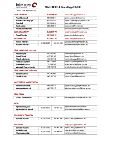 filia LUBLIN ul. Grabskiego 25/25I DZIAŁ OSOBOWY 81 531 00 60 [email protected] 81 531 00 64 81 531 00 61 81 531 00 63 81 531 00 65 [email protected] [email protected] [email protected] [email protected] [email protected] DZIAŁ CIĘŻAROWY 81 531 00 70 [email protected] Paweł Sternik 81 531 00 70 [email protected] 81 718 43 25 [email protected] Paweł Łukaszek Tomasz Kołodziejczyk Piotr Rak Jacek Jasina Arkadiusz Poterucha INTERMOTORS Janusz Kotliński Tomasz Wilczek 81 718 43 25 665-391-558 [email protected] [email protected] DZIAŁ HANDLOWY osobowy Adam Filipek Paweł Siczek Marek Jakubczyk Radosław Symbor Emilia Pelczarska Wojciech Zygmuntowicz 697 893 860 697 980 107 661 924 912 661 773 053 721 008 580 665 770 079 [email protected] [email protected] [email protected] [email protected] [email protected] [email protected] 697 980 050 665 390 743 [email protected] [email protected] 609 608 820 665 780 315 [email protected] [email protected] 661 924 911 [email protected] DZIAŁ HANDLOWY ciężarowy Jarosław Jarosz Daniel Jachacz WYPOSAŻENIE WARSZTATÓW Jarosław Skrzypek Wiesław Wieczorek DZIAŁ OPON Łukasz Gajowniczek KASA Agnieszka Szyszka Agnieszka Matyjaszek 81 531 00 72 697 965 662 [email protected] [email protected] 81 531 00 82 697 965 698 [email protected] REKLAMACJE / ZWROTY Bartosz Tkaczyk MAGAZYN Bartosz Tkaczyk Rafał Pietrzyk Marcin Wyroślak [email protected] 81 531 00 82 697 965 698 81 531 00 81 697 890 873 [email protected] [email protected] [email protected]