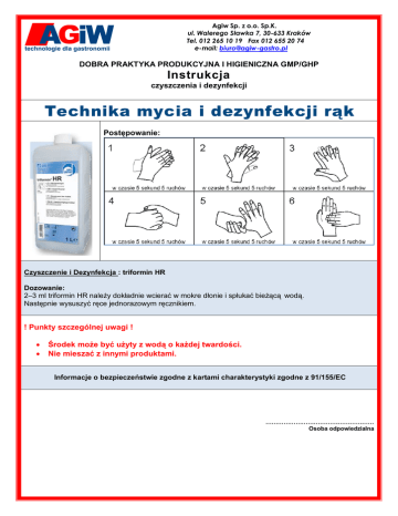 Agiw Sp. z o.o. Sp.K. ul. Walerego Sławka 7, 30-633 Kraków Tel. 012 265 10 19 Fax 012 655 20 74 e-mail: [email protected] DOBRA PRAKTYKA PRODUKCYJNA I HIGIENICZNA GMP/GHP Instrukcja czyszczenia i dezynfekcji Technika mycia i dezynfekcji rąk Postępowanie: Czyszczenie i Dezynfekcja : triformin HR Dozowanie: 2–3 ml triformin HR należy dokładnie wcierać w mokre dłonie i spłukać bieżącą wodą. Następnie wysuszyć ręce jednorazowym ręcznikiem. ! Punkty szczególnej uwagi ! Środek może być użyty z wodą o każdej twardości. Nie mieszać z innymi produktami. Informacje o bezpieczeństwie zgodne z kartami charakterystyki zgodne z 91/155/EC ……………………………………………… Osoba odpowiedzialna