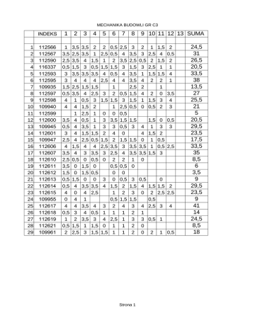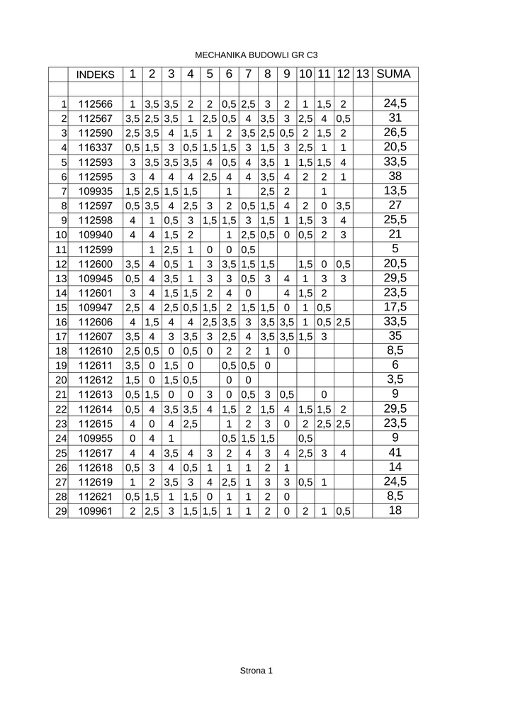 MECHANIKA BUDOWLI GR C3 1 2 3 4 5 6 7 8 9 10 11 12 13 14 15 16 17 18 19 20 21 22 23 24 25 26 27 28 29 INDEKS 1 2 3 4 5 6 7 112566 112567 112590 116337 112593 112595 109935 112597 112598 109940 112599 112600 109945 112601 109947 112606 112607 112610 112611 112612 112613 112614 112615 109955 112617 112618 112619 112621 109961 1 3,5 2,5 0,5 3 3 1,5 0,5 4 4 3,5 2,5 3,5 1,5 3,5 4 2,5 3,5 1 4 1 4 4 4 4 1,5 4 0,5 0 0 1,5 4 0 4 4 3 2 1,5 2,5 3,5 3,5 4 3 3,5 4 1,5 4 0,5 1,5 2,5 0,5 3,5 1,5 2,5 4 3 0 1,5 1,5 0 3,5 4 1 3,5 4 3,5 1 3 2 1 1,5 0,5 3,5 4 1,5 2,5 3 2 1 1 1 1,5 0,5 4 3,5 0,5 0 0,5 0 3,5 2,5 2 2,5 1 1,5 4 2,5 2,5 4 3,5 3 4 4 4 0,5 3 1,5 1,5 3 1 4 0 1,5 0,5 0,5 2 1,5 0,5 4 1 2 1,5 1 0 3,5 3 4 2 3,5 2,5 2 0,5 0 0 1,5 1 0,5 2 1 2,5 1 1 3,5 0,5 3 2,5 4 3,5 2,5 3,5 1,5 0,5 0,5 4 0 4 0,5 1 0,5 2 3 1,5 0 3 3 2 1,5 2,5 3 0 3 4 8 3 3,5 2,5 1,5 3,5 3,5 2,5 0,5 1,5 3 1,5 2,5 0,5 0,5 1,5 1,5 0,5 3 0 1,5 1,5 3 3,5 4 3,5 2 1 0,5 0 0 0,5 3 2 1,5 2 3 1,5 1,5 4 3 1 2 1 3 1 2 1 2 Strona 1 9 10 11 12 13 SUMA 2 3 0,5 3 1 4 2 4 1 0 4 4 0 3,5 3,5 0 1 2,5 2 2,5 1,5 2 1,5 4 1,5 1 1,5 2 1 2 0 1,5 3 0,5 2 1,5 1 1,5 1 1 1,5 2 0,5 2 1 4 1 3,5 4 3 0 0,5 3 3 2 0,5 0,5 2,5 3 0,5 0 4 1,5 1,5 0 2 2,5 0,5 4 2,5 3 1 3 0,5 1 0 0 2 1 2 2,5 4 0,5 24,5 31 26,5 20,5 33,5 38 13,5 27 25,5 21 5 20,5 29,5 23,5 17,5 33,5 35 8,5 6 3,5 9 29,5 23,5 9 41 14 24,5 8,5 18