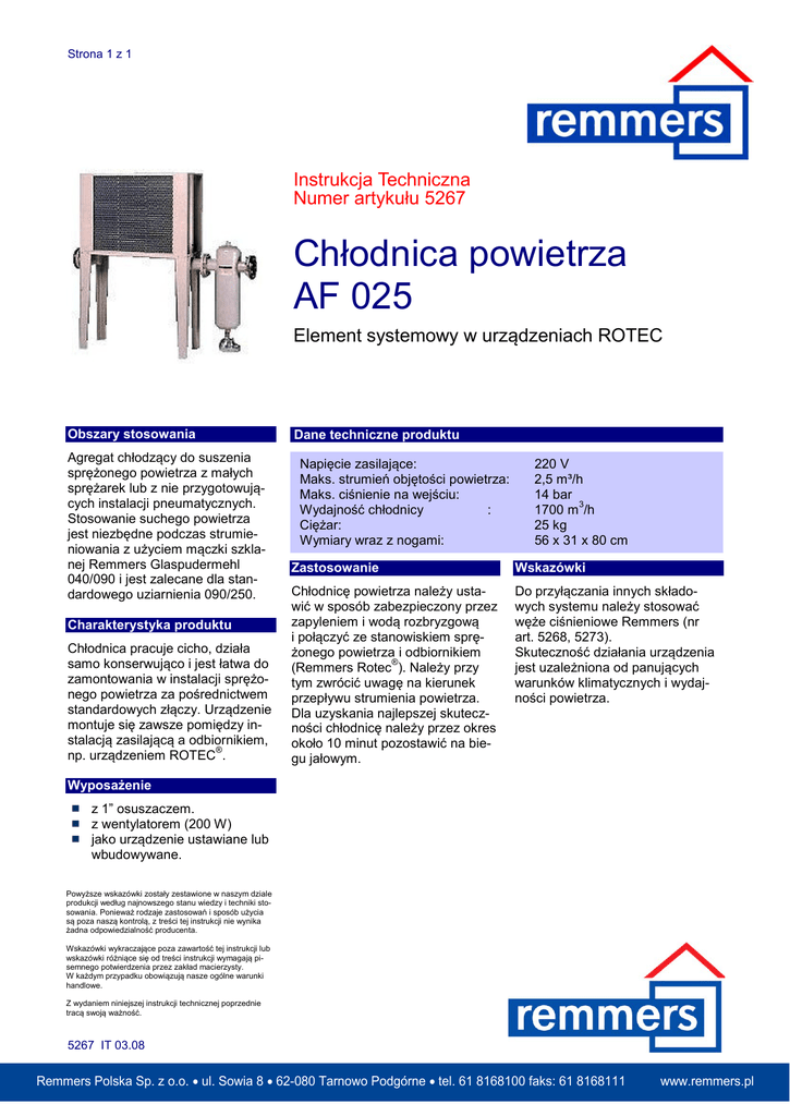 Strona 1 z 1 Instrukcja Techniczna Numer artykułu 5267 Chłodnica powietrza AF 025 Element systemowy w urządzeniach ROTEC Obszary stosowania Agregat chłodzący do suszenia sprężonego powietrza z małych sprężarek lub z nie przygotowujących instalacji pneumatycznych. Stosowanie suchego powietrza jest niezbędne podczas strumieniowania z użyciem mączki szklanej Remmers Glaspudermehl 040/090 i jest zalecane dla standardowego uziarnienia 090/250. Charakterystyka produktu Chłodnica pracuje cicho, działa samo konserwująco i jest łatwa do zamontowania w instalacji sprężonego powietrza za pośrednictwem standardowych złączy. Urządzenie montuje się zawsze pomiędzy instalacją zasilającą a odbiornikiem, ® np. urządzeniem ROTEC . Dane techniczne produktu Napięcie zasilające: Maks. strumień objętości powietrza: Maks. ciśnienie na wejściu: Wydajność chłodnicy : Ciężar: Wymiary wraz z nogami: 220 V 2,5 m³/h 14 bar 3 1700 m /h 25 kg 56 x 31 x 80 cm Zastosowanie Wskazówki Chłodnicę powietrza należy ustawić w sposób zabezpieczony przez zapyleniem i wodą rozbryzgową i połączyć ze stanowiskiem sprężonego powietrza i odbiornikiem ® (Remmers Rotec ). Należy przy tym zwrócić uwagę na kierunek przepływu strumienia powietrza. Dla uzyskania najlepszej skuteczności chłodnicę należy przez okres około 10 minut pozostawić na biegu jałowym. Do przyłączania innych składowych systemu należy stosować węże ciśnieniowe Remmers (nr art. 5268, 5273). Skuteczność działania urządzenia jest uzależniona od panujących warunków klimatycznych i wydajności powietrza. Wyposażenie z 1” osuszaczem. z wentylatorem (200 W) jako urządzenie ustawiane lub wbudowywane. Powyższe wskazówki zostały zestawione w naszym dziale produkcji według najnowszego stanu wiedzy i techniki stosowania. Ponieważ rodzaje zastosowań i sposób użycia są poza naszą kontrolą, z treści tej instrukcji nie wynika żadna odpowiedzialność producenta. Wskazówki wykraczające poza zawartość tej instrukcji lub wskazówki różniące się od treści instrukcji wymagają pisemnego potwierdzenia przez zakład macierzysty. W każdym przypadku obowiązują nasze ogólne warunki handlowe. Z wydaniem niniejszej instrukcji technicznej poprzednie tracą swoją ważność. 5267 IT 03.08 Remmers Polska Sp. z o.o. • ul. Sowia 8 • 62-080 Tarnowo Podgórne • tel. 61 8168100 faks: 61 8168111 www.remmers.pl