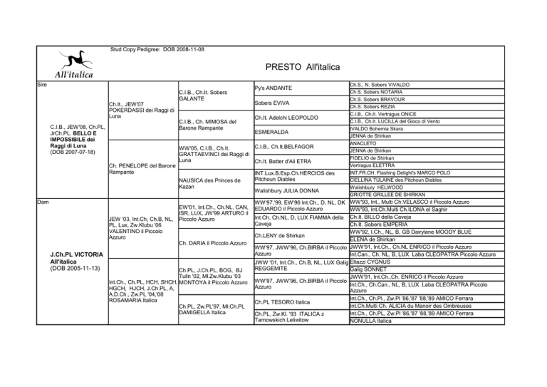 Stud Copy Pedigree: DOB 2008-11-08 PRESTO All'italica Sire C.I.B., Ch.It. Sobers GALANTE Ch.It., JEW'07 POKERDASSI dei Raggi di Luna C.I.B., Ch. MIMOSA del Barone Rampante C.I.B., JEW'08, Ch.PL, JrCh.PL. BELLO E IMPOSSIBILE dei Raggi di Luna (DOB 2007-07-18) Ch. PENELOPE del Barone Rampante Dam EW'01, Int.Ch., Ch.NL, CAN, ISR, LUX, JW'99 ARTURO il Piccolo Azzuro Ch. DARIA il Piccolo Azzuro J.Ch.PL VICTORIA All'italica (DOB 2005-11-13) Sobers EVIVA Ch.It. Adelchi LEOPOLDO ESMERALDA C.I.B., Ch.It.BELFAGOR WW'05, C.I.B., Ch.It. GRATTAEVINCI dei Raggi di Luna Ch.It. Batter d'Ali ETRA NAUSICA des Princes de Kazan JEW '03, Int.Ch, Ch.B, NL, PL, Lux, Zw.Klubu '06 VALENTINO il Piccolo Azzuro Py's ANDANTE Ch.PL, J.Ch.PL, BOG, BJ Tulln '02, Mł.Zw.Klubu '03 Int.Ch., Ch.PL, HCH, SHCH, MONTOYA il Piccolo Azzuro HGCH, HJCH, J.Ch.PL, A, A.D.Ch., Zw.PL '04,'08 ROSAMARIA Italica Ch.PL, Zw.PL'97, Mł.Ch.PL DAMIGELLA Italica INT.Lux.B.Esp.Ch.HERCIOS des Pitchoun Diables Walishbury JULIA DONNA Ch.S., N. Sobers VIVALDO Ch.S. Sobers NOTARIA Ch.S. Sobers BRAVOUR Ch.S. Sobers REZIA C.I.B., Ch.It. Vertragus ONICE C.I.B., Ch.It. LUCILLA del Gioco di Vento IVALDO Bohemia Skara JENNA de Shirkan ANACLETO JENNA de Shirkan FIDELIO de Shirkan Vertragus ELETTRA INT.FR.CH. Flashing Delight's MARCO POLO CIELLINA TULAINE des Pitchoun Diables Walishbury HELWOOD GRIOTTE GRILLEE DE SHIRKAN WW'97,'99, EW'96 Int.Ch., D, NL, DK WW'93, Int., Multi Ch.VELASCO il Piccolo Azzuro EDUARDO il Piccolo Azzuro WW'93, Int.Ch.Multi Ch.ILONA el Saghir Int.Ch, Ch.NL, D, LUX FIAMMA della Ch.It. BILLO della Caveja Caveja Ch.It. Sobers EMPERIA WW'92, I.Ch., NL, B, GB Dairylane MOODY BLUE Ch.LENY de Shirkan ELENA de Shirkan WW'97, JWW'96, Ch.BIRBA il Piccolo JWW'91, Int.Ch., Ch.NL ENRICO il Piccolo Azzuro Azzuro Int.Can., Ch. NL, B, LUX Laba CLEOPATRA Piccolo Azzuro JWW '01, Int.Ch., Ch.B, NL, LUX Galig Eltazzi CYGNUS REGGEMITE Galig SONNET JWW'91, Int.Ch.,Ch. ENRICO il Piccolo Azzuro WW'97, JWW'96, Ch.BIRBA il Piccolo Int.Ch., Ch.Can., NL, B, LUX. Laba CLEOPATRA Piccolo Azzuro Azzuro Int.Ch., Ch.Pl., Zw.Pl '86,'87 '88,'89 AMICO Ferrara Ch.PL TESORO Italica Int.Ch.Multi Ch. ALICIA du Manoir des Ombreuses Int.Ch., Ch.PL, Zw.Pl '86,'87 '88,'89 AMICO Ferrara Ch.PL, Zw.Kl. '93 ITALICA z Tarnowskich Leliwitow NONULLA Italica