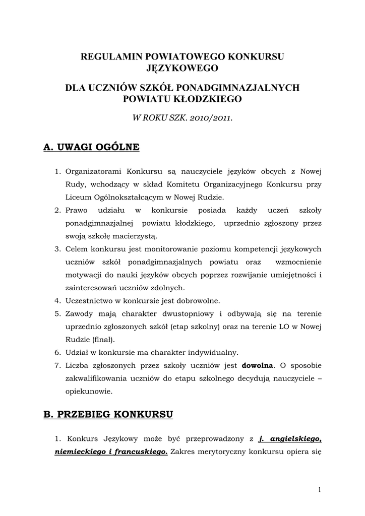REGULAMIN POWIATOWEGO KONKURSU JĘZYKOWEGO DLA UCZNIÓW SZKÓŁ PONADGIMNAZJALNYCH POWIATU KŁODZKIEGO W ROKU SZK. 2010/2011. A. UWAGI OGÓLNE 1. Organizatorami Konkursu są nauczyciele języków obcych z Nowej Rudy, wchodzący w skład Komitetu Organizacyjnego Konkursu przy Liceum Ogólnokształcącym w Nowej Rudzie. 2. Prawo udziału w ponadgimnazjalnej konkursie posiada powiatu kłodzkiego, każdy uczeń szkoły uprzednio zgłoszony przez swoją szkołę macierzystą. 3. Celem konkursu jest monitorowanie poziomu kompetencji językowych uczniów szkół ponadgimnazjalnych powiatu oraz wzmocnienie motywacji do nauki języków obcych poprzez rozwijanie umiejętności i zainteresowań uczniów zdolnych. 4. Uczestnictwo w konkursie jest dobrowolne. 5. Zawody mają charakter dwustopniowy i odbywają się na terenie uprzednio zgłoszonych szkół (etap szkolny) oraz na terenie LO w Nowej Rudzie (finał). 6. Udział w konkursie ma charakter indywidualny. 7. Liczba zgłoszonych przez szkoły uczniów jest dowolna. O sposobie zakwalifikowania uczniów do etapu szkolnego decydują nauczyciele – opiekunowie. B. PRZEBIEG KONKURSU 1. Konkurs Językowy może być przeprowadzony z j. angielskiego, niemieckiego i francuskiego. Zakres merytoryczny konkursu opiera się 1 na podstawie programowej dla szkół ponadgimnazjalnych oraz aktualnych informatorach maturalnych z języków obcych. 2. Pierwsza część konkursu (etap szkolny) składa się z testów obejmujących wiedzę pogrupowaną w dwóch obszarach: a. Rozumienie tekstu czytanego. (20 pkt) b. Test leksykalno – gramatyczny. (40 pkt) 3. Na rozwiązanie testu na poziomie szkoły przeznacza się do 70 minut. Po zakończeniu tego etapu nauczyciele zobowiązani są do terminowego sprawdzenia prac swoich uczniów oraz odesłania na adres Komitetu Organizacyjnego tylko tych prac, które osiągnęły wcześniej określony w piśmie przewodnim poziom punktów. Do prac proszę dołaczyć zbiorową listę z danymi i pieczęcią szkoły macierzystej, nazwiskami uczniów oraz ilością zdobytych przez nich punktów. Przysłanie prac, o których mowa powyżej NIE oznacza zakwalifikowania uczniów do finału. 4. Najwyższe wyniki punktowe uzyskane wg listy rankingowej w danym roku szkolnym w etapie szkolnym są podstawą do zakwalifikowania uczniów do finału. 5. Finał konkursu składa się z : a. testu rozumienia ze słuchu (10 pkt) b. stosowania struktur leksykalno – gramatycznych(10 pkt) c. egzaminu ustnego (20 pkt) przeprowadzonego przez Komisję (w składzie nie mniej niż 1 nauczyciela danego języka obcego szkół ponadgimnazjalnych zaproszonych na finał i jednego członka Komitetu Organizacyjnego, którego rolą jest zapoznanie pozostałych członków Komisji z kryteriami oceniania tej części oraz przewodniczenie obradom) 6. Egzamin ustny (część finału) będzie się składał z dwóch zadań – rozmowy na podstawie materiału stymulującego i prezentacji tematu połączonego z dyskusją. 2 7. Podczas egzaminu ustnego nauczyciel wchodzący w skład Komisji nie powinien egzaminować ucznia, którego przygotowywał do Konkursu w szkole macierzystej. 8. Ostateczne wyniki konkursu ustalane zostają tylko w oparciu o punkty uzyskane tylko w finale. Jeśli uczestnicy uzyskają równą liczbę punktów, przeprowadza się między nimi dodatkowy egzamin (test leksykalno – gramatyczny lub egzamin ustny), który wyłoni zwycięzcę. 9. W celu przystąpienia do Konkursu, szkoły zobowiązane są do jednorazowego zgłoszenia uczestnictwa i wskazania koordynatora na załączonych poniżej formularzach (jeden formularz dla wszystkich języków) i nadesłania ich pocztą w ustalonym terminie na adres Komitetu. 10. Dyrektor każdej szkoły biorącej udział w Konkursie wskazuje szkolnego koordynatora Językowego, którego do spraw Powiatowego Konkursu zadaniem jest prawidłowe i terminowe wypełnienie formalności związanych z Konkursem (w etapie szkolnym i ewentualnie w finale) i zapoznanie się i innych zainteresowanych nauczycieli z regulaminem Konkursu, a także ( w razie potrzeby) kontakt z Komitetem Organizacyjnym Konkursu. 11.Organizatorzy konkursu zastrzegają sobie prawo do dokonywania zmian w terminarzu i regulaminie konkursu. C. UPRAWNIENIA 1. Wszyscy uczniowie biorący udział w finale otrzymują pamiątkowe dyplomy. 2. Laureaci otrzymują nagrody rzeczowe. 3 D. TERMINARZ KONKURSU NA ROK 2010/2011 ZGŁOSZENIA PROSIMY NADSYŁAĆ POCZTĄ W NIEPRZEKRACZALNYM TERMINIE DO 19.11.2010r ETAP SZKOLNY: 13 grudnia 2010 godzina 9.00 – j. angielski 14 grudnia 2010 godzina 9.00 – j. niemiecki 15 grudnia 2010 godzina 9.00 – j. francuski FINAŁ 3 lutego 2011 roku - godz. 9.00 w LO w Nowej Rudzie E.ADRES KOMITETU ORGANIZACYJNEGO Komitet Organizacyjny Powiatowego Konkursu Języków Obcych dla Szkół Ponadgimnazjalnych LICEUM OGÓLNOKSZTAŁCĄCE W NOWEJ RUDZIE OSIEDLE PIASTOWSKIE 17 57-400 NOWA RUDA UWAGA!!! Organizatorzy konkursu zastrzegają sobie prawo do dokonywania zmian w terminarzu i regulaminie konkursu. Informacje o ewentualnych zmianach pojawią się na stronie internetowej LO w Nowej Rudzie: www.liceum.nowaruda.pl 4 KARTA ZGŁOSZENIA UDZIAŁU W POWIATOWYM KONKURSIE JĘZYKÓW OBCYCH SZKOŁA: ADRES: TELEFON: EMAIL: ZGŁASZA UDZIAŁ W KONKURSIE Z JĘZYKA: (1, 2 LUB 3 JĘZYKI) data, miejsce, pieczątka szkoły dyrektor 5 SZKOLNY KOORDYNATOR POWIATOWEGO KONKURSU JĘZYKÓW OBCYCH (IMIĘ, NAZWISKO, FUNKCJA, EMAIL PRYWATNY I SZKOŁY, TEL.KOM.) Podpis i pieczęć dyrektora szkoły Oświadczam, że zapoznałem/am się z regulaminem POWIATOWEGO KONKURSU JĘZYKÓW OBCYCH i znane mi są obowiązki koordynatora szkolnego. Data i miejsce, podpis koordynatora 6