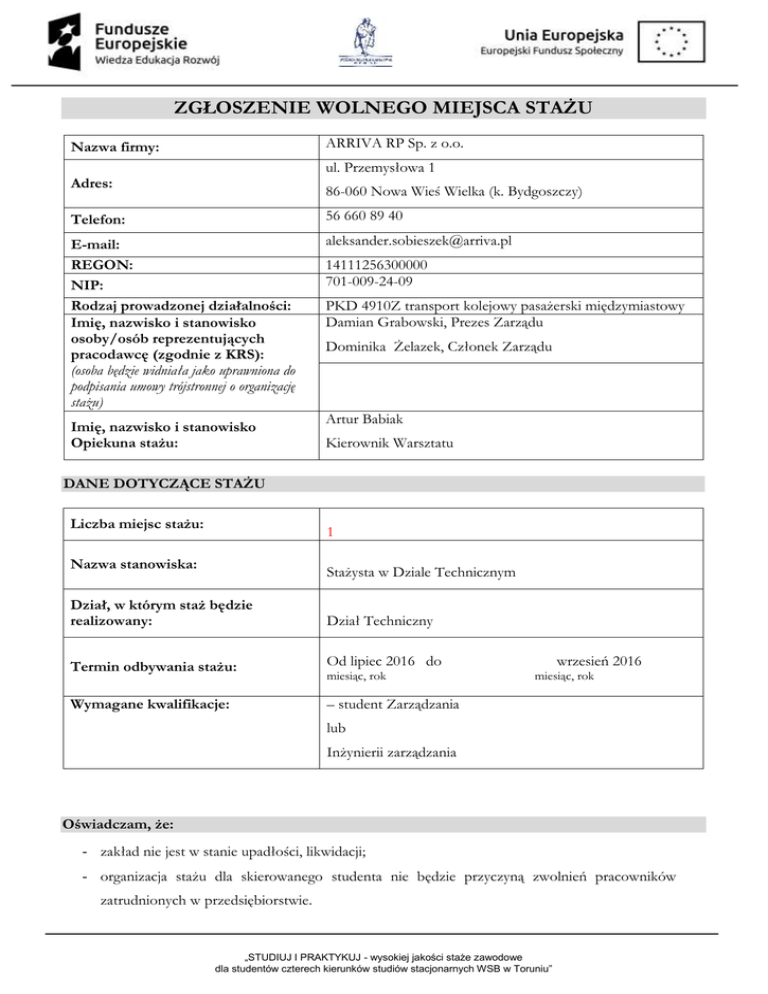 ZGŁOSZENIE WOLNEGO MIEJSCA STAŻU ARRIVA RP Sp. z o.o. Nazwa firmy: ul. Przemysłowa 1 Adres: 86-060 Nowa Wieś Wielka (k. Bydgoszczy) Telefon: 56 660 89 40 E-mail: REGON: NIP: Rodzaj prowadzonej działalności: Imię, nazwisko i stanowisko osoby/osób reprezentujących pracodawcę (zgodnie z KRS): (osoba będzie widniała jako uprawniona do podpisania umowy trójstronnej o organizację stażu) [email protected] Imię, nazwisko i stanowisko Opiekuna stażu: 14111256300000 701-009-24-09 PKD 4910Z transport kolejowy pasażerski międzymiastowy Damian Grabowski, Prezes Zarządu Dominika Żelazek, Członek Zarządu Artur Babiak Kierownik Warsztatu DANE DOTYCZĄCE STAŻU Liczba miejsc stażu: 1 Nazwa stanowiska: Stażysta w Dziale Technicznym Dział, w którym staż będzie realizowany: Dział Techniczny Termin odbywania stażu: Od lipiec 2016 do Wymagane kwalifikacje: – student Zarządzania miesiąc, rok wrzesień 2016 miesiąc, rok lub Inżynierii zarządzania Oświadczam, że: - zakład nie jest w stanie upadłości, likwidacji; - organizacja stażu dla skierowanego studenta nie będzie przyczyną zwolnień pracowników zatrudnionych w przedsiębiorstwie. „STUDIUJ I PRAKTYKUJ - wysokiej jakości staże zawodowe dla studentów czterech kierunków studiów stacjonarnych WSB w Toruniu” SZCZEGÓŁOWY PROGRAM STAŻU Zakres obowiązków Stażysty Wsparcie prac działu w zakresie: Utrzymania i zarzadzania systemem jakości, analizowanie kompletności niezbędnej dokumentacji. Pomoc w realizacji procedur Systemu Zarządzania Bezpieczeństwem (SMS - safety management system) i QMS (Quality Management System) w Spółce Kontrolowania jakości wykonanych przeglądów wg opracowanych procedur kontroli jakości. Pomoc w nadzorze nad wyznaczonymi procedurami. Analizowanie wyników przeglądów i dostępnych danych jakościowych. Przygotowywanie zestawień, analiz i prezentacji dotyczących utrzymania jakości. Sporządzaniu wymaganej przez system jakości dokumentacji. Przygotowywania analiz i zestawień. Ulepszania i opracowywanie procedur jakościowych. Opracowywanie i aktualizowania procedur. Zapoznanie się z systemem zarządzania bezpieczeństwem. Zapoznanie się z systemami informatycznymi stosowanymi w Dziale Technicznym. Zapoznanie się z funkcjonowaniem działu, strukturą organizacyjną i działalnością Spółki, procedurami i rolą Działu Technicznego. Wymiar godzinowy Liczba godzin dziennie: 8 Godziny pracy: od 8.00 do 16.00 Praca przy monitorze ekranowym co najmniej połowę dobowego wymiaru czasu pracy TAK □ NIE □ Cele edukacyjne 1. Zapoznanie z funkcjonowaniem spółki, w szczególności z organizacją systemów i procesów zapewniających efektywną organizację transportu pasażerskiego na kolei. 2. Zapoznanie z obowiązkami wykonywanymi przez pracowników działu, zapoznanie się z organizacją działu, celami i planami działania oraz z dokumentacją, obowiązującymi procedurami i przepisami i ich praktycznym wykorzystaniem i wdrażaniem w życie. 3. Zapoznanie z otoczeniem organizacji (m.in. zarządca infrastruktury, organizator przewozów, Urząd Transportu Kolejowego). 4. Rozwój umiejętności pracy zespołowej poprzez współpracę ze specjalistami działu. 5. Rozwinięcie umiejętności przygotowywanie dokumentów, zestawień i raportów, analizowania przepisów i danych. 7. Zapoznanie się z fachową terminologią stosowaną na kolei i podczas dokonywania przeglądów technicznych pojazdów szynowych. 8. Nabycie praktycznej umiejętności rozwiązywania problemów związanych z pracą Działu Technicznego. 9 Zapoznanie się z zagadnieniami zapewnienia jakości. „STUDIUJ I PRAKTYKUJ - wysokiej jakości staże zawodowe dla studentów czterech kierunków studiów stacjonarnych WSB w Toruniu” Zobowiązuję się do: - dostarczenia, wraz z wypełnionym Zgłoszeniem wolnego miejsca stażu, kserokopii wpisu do KRS - dostarczenia kalkulacji godzin zrealizowanych w ramach pełnienia obowiązków przez Opiekuna stażysty (obejmującej liczbę przepracowanych godzin) oraz potwierdzenia dokonanych wypłat wynagrodzeń (wyciąg z konta lub potwierdzenie wykonania operacji). Kalkulacja będzie podstawą rozliczenia wkładu własnego przedsiębiorcy – ubruttowionego wynagrodzenia Opiekuna stażysty w wysokości 382,40 zł. Toruń, 10.06.2016r. ………………………….. Miejscowość i data …………………..………………………………….. Podpis osoby reprezentującej i pieczątka firm „STUDIUJ I PRAKTYKUJ - wysokiej jakości staże zawodowe dla studentów czterech kierunków studiów stacjonarnych WSB w Toruniu”