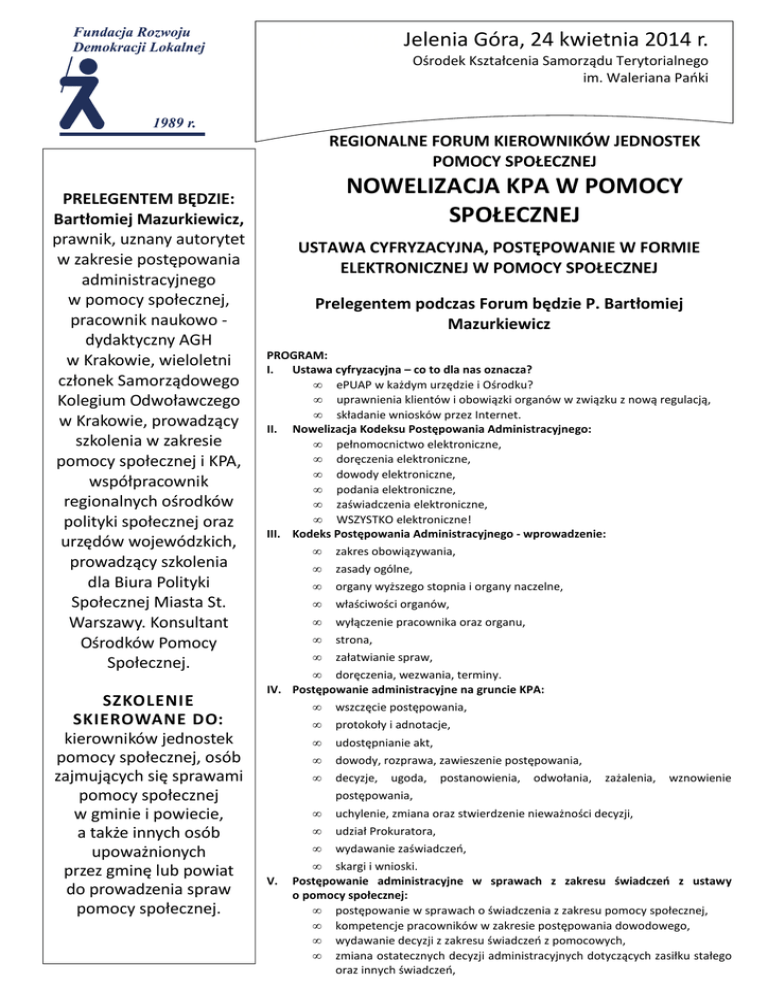 Jelenia Góra, 24 kwietnia 2014 r. Rozwiązania informatyczne Ośrodek Kształcenia Samorządu Terytorialnego im. Waleriana Pańki REGIONALNE FORUM KIEROWNIKÓW JEDNOSTEK POMOCY SPOŁECZNEJ PRELEGENTEM BĘDZIE: Bartłomiej Mazurkiewicz, prawnik, uznany autorytet w zakresie postępowania administracyjnego w pomocy społecznej, pracownik naukowo dydaktyczny AGH w Krakowie, wieloletni członek Samorządowego Kolegium Odwoławczego w Krakowie, prowadzący szkolenia w zakresie pomocy społecznej i KPA, współpracownik regionalnych ośrodków polityki społecznej oraz urzędów wojewódzkich, prowadzący szkolenia dla Biura Polityki Społecznej Miasta St. Warszawy. Konsultant Ośrodków Pomocy Społecznej. SZKOLENIE SKIEROWANE DO: kierowników jednostek pomocy społecznej, osób zajmujących się sprawami pomocy społecznej w gminie i powiecie, a także innych osób upoważnionych przez gminę lub powiat do prowadzenia spraw pomocy społecznej. NOWELIZACJA KPA W POMOCY SPOŁECZNEJ USTAWA CYFRYZACYJNA, POSTĘPOWANIE W FORMIE ELEKTRONICZNEJ W POMOCY SPOŁECZNEJ Prelegentem podczas Forum będzie P. Bartłomiej Mazurkiewicz PROGRAM: I. Ustawa cyfryzacyjna – co to dla nas oznacza? • ePUAP w każdym urzędzie i Ośrodku? • uprawnienia klientów i obowiązki organów w związku z nową regulacją, • składanie wniosków przez Internet. II. Nowelizacja Kodeksu Postępowania Administracyjnego: • pełnomocnictwo elektroniczne, • doręczenia elektroniczne, • dowody elektroniczne, • podania elektroniczne, • zaświadczenia elektroniczne, • WSZYSTKO elektroniczne! III. Kodeks Postępowania Administracyjnego - wprowadzenie: • zakres obowiązywania, • zasady ogólne, • organy wyższego stopnia i organy naczelne, • właściwości organów, • wyłączenie pracownika oraz organu, • strona, • załatwianie spraw, • doręczenia, wezwania, terminy. IV. Postępowanie administracyjne na gruncie KPA: • wszczęcie postępowania, • protokoły i adnotacje, • udostępnianie akt, • dowody, rozprawa, zawieszenie postępowania, • decyzje, ugoda, postanowienia, odwołania, zażalenia, wznowienie postępowania, V. • uchylenie, zmiana oraz stwierdzenie nieważności decyzji, • udział Prokuratora, • wydawanie zaświadczeń, • skargi i wnioski. Postępowanie administracyjne w sprawach z zakresu świadczeń z ustawy o pomocy społecznej: • postępowanie w sprawach o świadczenia z zakresu pomocy społecznej, • kompetencje pracowników w zakresie postępowania dowodowego, • wydawanie decyzji z zakresu świadczeń z pomocowych, • zmiana ostatecznych decyzji administracyjnych dotyczących zasiłku stałego oraz innych świadczeń, Zgłoszenia: Wypełnioną kartę zgłoszenia należy przesłać mailem lub faksem do 17 kwietnia 2014. Uwaga: Ilość miejsc ograniczona. Brak pisemnej rezygnacji na 3 dni przed szkoleniem będzie równoznaczny z obciążeniem Państwa pełnym kosztem szkolenia. DANE DO KONTAKTU: Ośrodek Kształcenia Samorządu Terytorialnego im. Waleriana Pańki 40-014 Katowice ul. Mariacka 1 tel/fax. 32 259 86 73, 32 253 84 09, e-mail: [email protected] www.okst.pl OSOBA DO KONTAKTU: Barbara Tekień, tel. 32 206 98 43 w. 34, [email protected] • procedura administracyjna na podstawie ustawy o pomocy społecznej. VI. Postępowanie administracyjne w świadczeniach z rodzinnych i funduszu alimentacyjnego: • wydawanie decyzji z zakresu świadczeń, • zmiana ostatecznych decyzji administracyjnych, • wszczęcie a wznowienie, • nienależnie pobrane świadczenia, • ile KPA jest w postępowaniu w sprawie dłużników? Zapraszamy na spotkanie organizacyjne Regionalnego Forum Kierowników Pomocy Społecznej. Zachęcam tych z Państwa, którzy jeszcze nie zgłosili swojego akcesu do Forum, do rozważenia przystąpienia do tego gremium. Aby stać się członkiem Forum należy wypełnić deklarację członkowską (deklaracja wraz z projektem Statutu znajduje się na stronie www.okst.pl) i przesłać ją mailem lub faxem do Ośrodka. Miejsce spotkania: Jelenia Góra, Hotel EUROPA, ul. 1 Maja 16/18, sala zielona. Wjazd na parking Hotelu Europa od strony ul. Armii Krajowej. Termin i godzina: 24 kwietnia 2014 r. godz. 9.00 – 15.00. Koszt uczestnictwa: członkowie Forum 199 zł netto/os. Pozostali uczestnicy: 299 zł netto/os. Udział w szkoleniu zwolniony z VAT w przypadku finansowania szkolenia ze środków publicznych. Cena zawiera materiały szkoleniowe, zaświadczenie o ukończeniu szkolenia, poczęstunek i serwis kawowy. W razie potrzeby w zastępstwie członka Forum, w szkoleniu może uczestniczyć inna wyznaczona osoba z danej placówki, korzystając przy tym z rabatu przysługującego członkom Forum. Karta zgłoszenia – kod szkolenia: 479/14D/FPS Nazwa Nabywcy(dane do FVAT):..................................................................................................................………………………………………… Ulica, nr domu: ........................................................ Miejscowość ………………………………………..…..………………kod pocztowy……….….…………………... NIP: .................................................................... Tel................................................... e - mail ……………………………………………………………….………………… 1. ...................................................................................................................................................................................................................................... imię i nazwisko, (wypełnić drukowanymi) wydział/ stanowisko 2....................................................................................................................................................................................................................................... imię i nazwisko, (wypełnić drukowanymi) członek forum tak wydzi