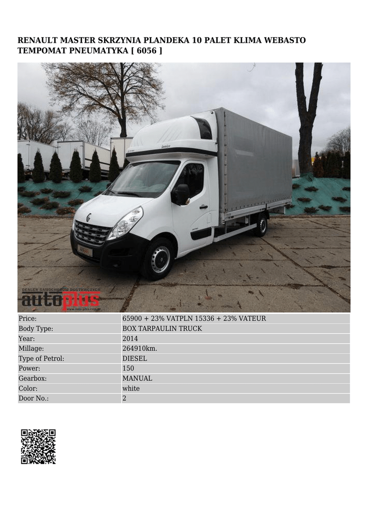 RENAULT MASTER SKRZYNIA PLANDEKA 10 PALET KLIMA WEBASTO TEMPOMAT PNEUMATYKA [ 6056 ] Price: Body Type: Year: Millage: Type of Petrol: Power: Gearbox: Color: Door No.: 65900 + 23% VATPLN 15336 + 23% VATEUR BOX TARPAULIN TRUCK 2014 264910km. DIESEL 150 MANUAL white 2 ADDITIONAL INFORMATION ● ● ● ● ● accident-free serwisowany w ASO zarejestrowany w polsce stan bardzo dobry Kupiony w salonie w Polsce OPTIONAL EXTRAS ● ● ● ● ● ● ● ● ● ● ● ABS centralny zamek elektryczne lusterka immobiliser klimatyzacja komputer radio / cd tempomat wspomaganie kierownicy elektryczne szyby ogrzewanie postojowe DESCRIPTION NUMBER OFERTY- 6056 Bought from a dealer in Poland in perfect condition Renault Master stake body tarpaulin with a sleeper cab. First registration 2014. Car looks greate. Full service. It is accident-free. Paint in very good condition. The interior is clean and very well maintained. Well equipped. The suspension and gearbox work perfectly. Dynamic 2.3 dCi engine has a power of 150 hp. He runs evenly and quietly. Auto-equipped, with air conditioning, webasto, cruise control and pneumatic suspension. We invite you for a test drive. On the car can be load 10 europalet. Height tarpaulin 230 cm or 250 cm. Equipment: - ABS - Drivers airbag - Immobilizer - Central lock - Radio CD - Air Conditioning - Webasto - Cruise control - Pneumatic suspension - 10 Europalets - On-board computer - Electric windows and mirrors - Power steering - Multifunctional steering wheel - armrest - 6 speed - 3 seats - Sleeper cabin - Dimensions of the box: Length / 485 cm / width / 220 cm / Height / 230 -250 cm /