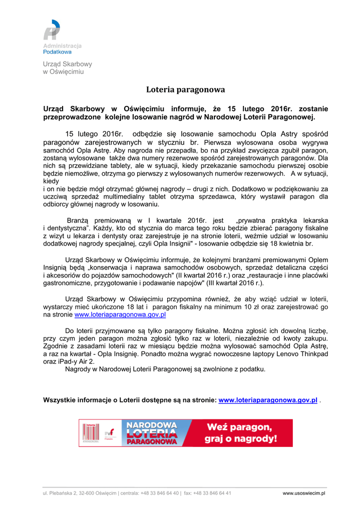 Urząd Skarbowy w Oświęcimiu Loteria paragonowa Urząd Skarbowy w Oświęcimiu informuje, że 15 lutego 2016r. zostanie przeprowadzone kolejne losowanie nagród w Narodowej Loterii Paragonowej. 15 lutego 2016r. odbędzie się losowanie samochodu Opla Astry spośród paragonów zarejestrowanych w styczniu br. Pierwsza wylosowana osoba wygrywa samochód Opla Astrę. Aby nagroda nie przepadła, bo na przykład zwycięzca zgubił paragon, zostaną wylosowane także dwa numery rezerwowe spośród zarejestrowanych paragonów. Dla nich są przewidziane tablety, ale w sytuacji, kiedy przekazanie samochodu pierwszej osobie będzie niemożliwe, otrzyma go pierwszy z wylosowanych numerów rezerwowych. A w sytuacji, kiedy i on nie będzie mógł otrzymać głównej nagrody – drugi z nich. Dodatkowo w podziękowaniu za uczciwą sprzedaż multimedialny tablet otrzyma sprzedawca, który wystawił paragon dla odbiorcy głównej nagrody w losowaniu. Branżą premiowaną w I kwartale 2016r. jest „prywatna praktyka lekarska i dentystyczna”. Każdy, kto od stycznia do marca tego roku będzie zbierać paragony fiskalne z wizyt u lekarza i dentysty oraz zarejestruje je na stronie loterii, weźmie udział w losowaniu dodatkowej nagrody specjalnej, czyli Opla Insignii" - losowanie odbędzie się 18 kwietnia br. Urząd Skarbowy w Oświęcimiu informuje, że kolejnymi branżami premiowanymi Oplem Insignią będą „konserwacja i naprawa samochodów osobowych, sprzedaż detaliczna części i akcesoriów do pojazdów samochodowych" (II kwartał 2016 r.) oraz „restauracje i inne placówki gastronomiczne, przygotowanie i podawanie napojów" (III kwartał 2016 r.). Urząd Skarbowy w Oświęcimiu przypomina również, że aby wziąć udział w loterii, wystarczy mieć ukończone 18 lat i paragon fiskalny na minimum 10 zł oraz zarejestrować go na stronie www.loteriaparagonowa.gov.pl Do loterii przyjmowane są tylko paragony fiskalne. Można zgłosić ich dowolną liczbę, przy czym jeden paragon można zgłosić tylko raz w loterii, niezależnie od kwoty zakupu. Zgodnie z zasadami loterii raz w miesiącu będzie można wylosować samochód Opla Astrę, a raz na kwartał - Opla Insignię. Ponadto można wygrać nowoczesne laptopy Lenovo Thinkpad oraz iPad-y Air 2. Nagrody w Narodowej Loterii Paragonowej są zwolnione z podatku. Wszystkie informacje o Loterii dostępne są na stronie: www.loteriaparagonowa.gov.pl . ul. Plebańska 2, 32-600 Oświęcim | centrala: +48 33 846 64 40 | fax: +48 33 846 64 41 www.usoswiecim.pl