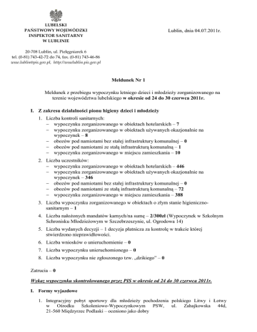 LUBELSKI PAŃSTWOWY WOJEWÓDZKI INSPEKTOR SANITARNY W LUBLINIE Lublin, dnia 04.07.2011r. 20-708 Lublin, ul. Pielęgniarek 6 tel. (0-81) 743-42-72 do 74, fax. (0-81) 743-46-86 [email protected], http://wsselublin.pis.gov.pl Meldunek Nr 1 Meldunek z przebiegu wypoczynku letniego dzieci i młodzieŜy zorganizowanego na terenie województwa lubelskiego w okresie od 24 do 30 czerwca 2011r. I. Z zakresu działalności pionu higieny dzieci i młodzieŜy 1. Liczba kontroli sanitarnych: − wypoczynku zorganizowanego w obiektach hotelarskich – 7 − wypoczynku zorganizowanego w obiektach uŜywanych okazjonalnie na wypoczynek – 8 − obozów pod namiotami bez stałej infrastruktury komunalnej – 0 − obozów pod namiotami ze stałą infrastrukturą komunalną – 1 − wypoczynku zorganizowanego w miejscu zamieszkania – 10 2. Liczba uczestników: − wypoczynku zorganizowanego w obiektach hotelarskich – 446 − wypoczynku zorganizowanego w obiektach uŜywanych okazjonalnie na wypoczynek – 346 − obozów pod namiotami bez stałej infrastruktury komunalnej – 0 − obozów pod namiotami ze stałą infrastrukturą komunalną – 72 − wypoczynku zorganizowanego w miejscu zamieszkania – 388 3. Liczba wypoczynku zorganizowanego w obiektach o złym stanie higienicznosanitarnym – 1 4. Liczba nałoŜonych mandatów karnych/na sumę – 2/300zł (Wypoczynek w Szkolnym Schronisku MłodzieŜowym w Szczebrzeszynie, ul. Ogrodowa 14) 5. Liczba wydanych decyzji – 1 decyzja płatnicza za kontrolę w trakcie której stwierdzono nieprawidłowości. 6. Liczba wniosków o unieruchomienie – 0 7. Liczba wypoczynku unieruchomionego – 0 8. Liczba wypoczynku nie zgłoszonego tzw. „dzikiego” – 0 Zatrucia – 0 Wykaz wypoczynku skontrolowanego przez PIS w okresie od 24 do 30 czerwca 2011r. I. Formy wyjazdowe 1. Integracyjny pobyt sportowy dla młodzieŜy pochodzenia polskiego Litwy i Łotwy w Ośrodku Szkoleniowo-Wypoczynkowym PSW, ul. Zahajkowska 44d, 21-560 Międzyrzec Podlaski – oceniono jako dobry 2. ,,Kraina nad Tanwią” Ośrodek wypoczynkowy Wólka Biska śary 26, 23-435 Biszcza – oceniono jako dobry 3. Baza wypoczynkowa Chełmskiego Ośrodka Wsparcia Bliźniego „CARITAS” w Puszczy gm. śmudź. I turnus obozu szkoleniowo-wypoczynkowego dla dzieci z rodzin ubogich i patologicznych z terenu powiatu chełmskiego i województwa lubelskiego – oceniono jako dobry 4. ALMATUR Ośrodek Wypoczynkowy, ul. Turystyczna 10 E, 23-300 Janów Lubelski – oceniono jako dobry 5. Ośrodek ”ZALEW” Sp. z o. o., ul. Turystyczna 10, 23-300 Janów Lubelski – oceniono jako dobry 6. Internat przy Zespole 23-313 Potok Wielki Szkół Centrum Kształcenia Rolniczego w Potoczku, 7. Szkoła Podstawowa im. Kornela Makuszyńskiego w Łańcuchowie – oceniono jako dobry 8. PW „ROMANUM” Zajazd „IMPERIUM”, ul. Lubelska 1, 21-136 Firlej – oceniono jako dobry 9. Ośrodek Sportów Wodnych – „POLESIE” w Firleju ul. Wczasowa 4, 21-136 Firlej – oceniono jako dobry 10. Dom Pracy Twórczej w Kazimierzu Dolnym ul. Małachowskiego 17 – oceniono jako dobry 11. Interimpex- Ośrodek Wczasowy „Świtezianka” 22-232 Okuninka – oceniono jako dobry 12. Pensjonat Bankowy, Antoni Kobielas, 22-232 Okuninka – oceniono jako dobry 13. Wypoczynek w Ośrodku Wypoczynkowym ul. Wczasowa 23 – oceniono jako dobry „Pszczeliniec” w Krasnobrodzie, 14. Wypoczynek w Szkolnym Schronisku MłodzieŜowym w Szczebrzeszynie, ul. Ogrodowa 14 – nałoŜono 2 mandaty karne na łączną kwotę 300zł za zaniedbania sanitarnohigieniczne. Ponowna kontrola wykazała usunięcie nieprawidłowości. II. Wypoczynek w miejscu zamieszkania 1. Publiczna Szkoła Podstawowa w Dąbrowie 22-500 Hrubieszów 2. Publiczna Szkoła Podstawowa w Koble 22-500 Hrubieszów 3. Szkoła Podstawowa w Ślipczu 22-500 Hrubieszów 4. Szkoła Podstawowa w Czerniczynie 22-500 Hrubieszów 5. Szkoła Podstawowa w Mienianach 22-500 Hrubieszów 6. Zespół Szkół Nr 4 im. Jana Pawła II, ul. Piłsudskiego 21, 22-300 Krasnystaw 7. Szkoła Podstawowa im. Jana Pawła II Nr 51 ul. Bursztynowa 22, 20-576 Lublin 8. Stowarzyszenie Twórców Kultury NadbuŜańskiej, im. Janusza Kalinowskiego Al. Piłsudskiego 52, 22-200 Włodawa 9. Szkoła Podstawowa Nr 2, ul. Kopernika 3, 22-200 Włodawa 10. Półkolonie zorganizowane przez Stowarzyszenie Otwarte Serca w Osiedlowym Domu Kultury w Zamościu, ul. Wyszyńskiego 28 A II. Zakres tematyczny tygodniowych meldunków dotyczących obiektów Ŝywnościowo-Ŝywieniowych placówek wypoczynku dzieci i młodzieŜy Liczba obiektów skontrolowanych 14 Liczba kontroli 14 Liczba wydanych decyzji adm. (w tym unieruchom.) (*) - Stopień wdroŜenia Procedur GHP/GMP Zasad systemu HACCP WdroŜono w 12 Obiektach WdroŜono Obiekt. - 11 Niekompletne opracowanie procedur – 1 WdroŜono częściowo- 2 Brak opracowania - 1 Nieoprac. - 1 Ocena sposobu Ŝywienia , stopień urozmaicenia posiłków We wszystkich 14 obiektach jadłospisy planowane są na okres turnusu, są urozmaicone, wykorzystywane są produkty sezonowe oraz produkty z kaŜdej grupy Działania represyjne Liczba i kwota mandatów karnych (**) - Uwagi (***) Inne - - odpady poprodukcyjne usuwane jako odpady komunalne (14) W okresie od 27.06.2011 r. do 01.07.2011 r. nie wydawano decyzji administracyjnych, natomiast w 1 obiekcie w Stołówce Wypoczynku Letniego Dzieci i MłodzieŜy „Caritas” w Puszczy stwierdzone podczas kontroli uchybienia higieniczno - sanitarne wpisano do ksiąŜki kontroli. Zalecono doprowadzić do prawidłowego stanu urządzenie chłodnicze słuŜące do przechowywania Ŝywności oraz zapewnić dezynfekcję chemiczną naczyń stołowych do czasu wyposaŜenia obiektu w sprawną maszynę do mycia i wyparzania naczyń. W w/w obiekcie przygotowywane są śniadania, podwieczorki i kolacje, natomiast obiady w formie cateringu dostarczane są ze stołówki „CARITAS” w Chełmie ul. Lubelska 134 a. – planowana kontrola obiektu w lipcu br. Procedury GHP