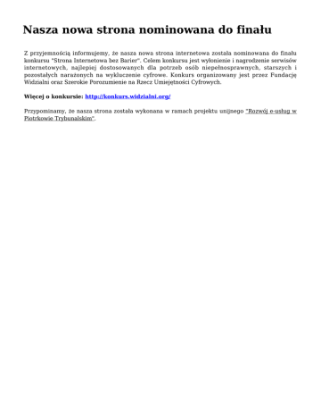Nasza nowa strona nominowana do finału Z przyjemnością informujemy, że nasza nowa strona internetowa została nominowana do finału konkursu "Strona Internetowa bez Barier". Celem konkursu jest wyłonienie i nagrodzenie serwisów internetowych, najlepiej dostosowanych dla potrzeb osób niepełnosprawnych, starszych i pozostałych narażonych na wykluczenie cyfrowe. Konkurs organizowany jest przez Fundację Widzialni oraz Szerokie Porozumienie na Rzecz Umiejętności Cyfrowych. Więcej o konkursie: http://konkurs.widzialni.org/ Przypominamy, że nasza strona została wykonana w ramach projektu unijnego "Rozwój e-usług w Piotrkowie Trybunalskim".