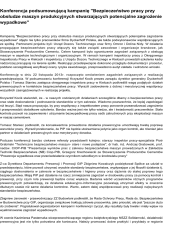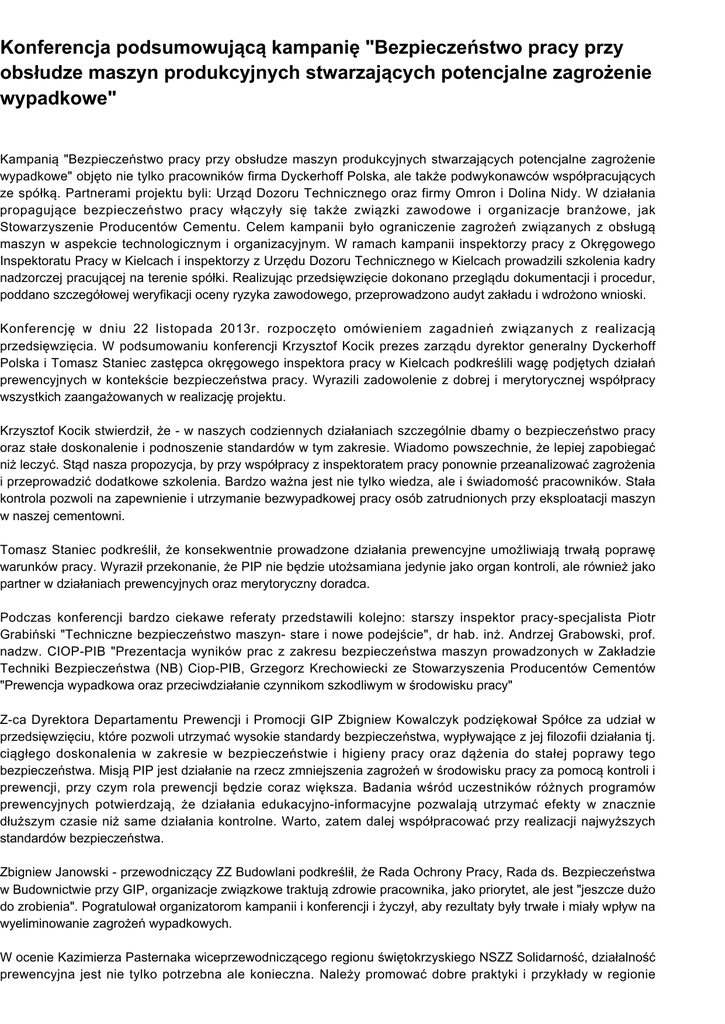 Konferencja podsumowującą kampanię "Bezpieczeństwo pracy przy obsłudze maszyn produkcyjnych stwarzających potencjalne zagrożenie wypadkowe" Kampanią "Bezpieczeństwo pracy przy obsłudze maszyn produkcyjnych stwarzających potencjalne zagrożenie wypadkowe" objęto nie tylko pracowników firma Dyckerhoff Polska, ale także podwykonawców współpracujących ze spółką. Partnerami projektu byli: Urząd Dozoru Technicznego oraz firmy Omron i Dolina Nidy. W działania propagujące bezpieczeństwo pracy włączyły się także związki zawodowe i organizacje branżowe, jak Stowarzyszenie Producentów Cementu. Celem kampanii było ograniczenie zagrożeń związanych z obsługą maszyn w aspekcie technologicznym i organizacyjnym. W ramach kampanii inspektorzy pracy z Okręgowego Inspektoratu Pracy w Kielcach i inspektorzy z Urzędu Dozoru Technicznego w Kielcach prowadzili szkolenia kadry nadzorczej pracującej na terenie spółki. Realizując przedsięwzięcie dokonano przeglądu dokumentacji i procedur, poddano szczegółowej weryfikacji oceny ryzyka zawodowego, przeprowadzono audyt zakładu i wdrożono wnioski. Konferencję w dniu 22 listopada 2013r. rozpoczęto omówieniem zagadnień związanych z realizacją przedsięwzięcia. W podsumowaniu konferencji Krzysztof Kocik prezes zarządu dyrektor generalny Dyckerhoff Polska i Tomasz Staniec zastępca okręgowego inspektora pracy w Kielcach podkreślili wagę podjętych działań prewencyjnych w kontekście bezpieczeństwa pracy. Wyrazili zadowolenie z dobrej i merytorycznej współpracy wszystkich zaangażowanych w realizację projektu. Krzysztof Kocik stwierdził, że - w naszych codziennych działaniach szczególnie dbamy o bezpieczeństwo pracy oraz stałe doskonalenie i podnoszenie standardów w tym zakresie. Wiadomo powszechnie, że lepiej zapobiegać niż leczyć. Stąd nasza propozycja, by przy współpracy z inspektoratem pracy ponownie przeanalizować zagrożenia i przeprowadzić dodatkowe szkolenia. Bardzo ważna jest nie tylko wiedza, ale i świadomość pracowników. Stała kontrola pozwoli na zapewnienie i utrzymanie bezwypadkowej pracy osób zatrudnionych przy eksploatacji maszyn w naszej cementowni. Tomasz Staniec podkreślił, że konsekwentnie prowadzone działania prewencyjne umożliwiają trwałą poprawę warunków pracy. Wyraził przekonanie, że PIP nie będzie utożsamiana jedynie jako organ kontroli, ale również jako partner w działaniach prewencyjnych oraz merytoryczny doradca. Podczas konferencji bardzo ciekawe referaty przedstawili kolejno: starszy inspektor pracy-specjalista Piotr Grabiński "Techniczne bezpieczeństwo maszyn- stare i nowe podejście", dr hab. inż. Andrzej Grabowski, prof. nadzw. CIOP-PIB "Prezentacja wyników prac z zakresu bezpieczeństwa maszyn prowadzonych w Zakładzie Techniki Bezpieczeństwa (NB) Ciop-PIB, Grzegorz Krechowiecki ze Stowarzyszenia Producentów Cementów "Prewencja wypadkowa oraz przeciwdziałanie czynnikom szkodliwym w środowisku pracy" Z-ca Dyrektora Departamentu Prewencji i Promocji GIP Zbigniew Kowalczyk podziękował Spółce za udział w przedsięwzięciu, które pozwoli utrzymać wysokie standardy bezpieczeństwa, wypływające z jej filozofii działania tj. ciągłego doskonalenia w zakresie w bezpieczeństwie i higieny pracy oraz dążenia do stałej poprawy tego bezpieczeństwa. Misją PIP jest działanie na rzecz zmniejszenia zagrożeń w środowisku pracy za pomocą kontroli i prewencji, przy czym rola prewencji będzie coraz większa. Badania wśród uczestników różnych programów prewencyjnych potwierdzają, że działania edukacyjno-informacyjne pozwalają utrzymać efekty w znacznie dłuższym czasie niż same działania kontrolne. Warto, zatem dalej współpracować przy realizacji najwyższych standardów bezpieczeństwa. Zbigniew Janowski - przewodniczący ZZ Budowlani podkreślił, że Rada Ochrony Pracy, Rada ds. Bezpieczeństwa w Budownictwie przy GIP, organizacje związkowe traktują zdrowie pracownika, jako priorytet, ale jest "jeszcze dużo do zrobienia". Pogratulował organizatorom kampanii i konferencji i życzył, aby rezultaty były trwałe i miały wpływ na wyeliminowanie zagrożeń wypadkowych. W ocenie Kazimierza Pasternaka wiceprzewodniczącego regionu świętokrzyskiego NSZZ Solidarność, działalność prewencyjna jest nie tylko potrzebna ale konieczna. Należy promować dobre praktyki i przykłady w regionie zwłaszcza w sytuacji, gdzie przepisy bhp są powszechnie łamane. Cenne jest współdziałanie państwowych organów nadzoru, zakładowych organizacji związkowych i społecznych inspektorów pracy. Zaznaczył, że o bezpieczeństwie pracy musimy rozmawiać w kategoriach mentalnych. Pracownik musi zrozumieć, że warto przestrzegać obowiązujące zasady i przepisy. Niezwykle ważna jest organizacja pracy, szkolenie kadry nadzorczej. Janusz Kwapisz dyrektor ds. zarządzania jakością i środowiskiem i bhp Doliny Nidy sp. z o. o. przedstawił działania prewencyjne realizowane na terenie własnej firmy i wyraził gotowość do przeprowadzenia w 2014r. programu prewencyjnego wspólnie z OIP Kielce. Jacek Starula specjalista ds. bhp Dyckerhoff Polska przedstawił efekty kampanii polegające przede wszystkim na zapewnieniu wyższych standardów przy liniach przesyłowych, przenośnikach taśmowych, linii zasypowej opon do pieca, przy suwnicach oraz zorganizowaniu procedur bezpiecznego usuwania awarii. Dla uczestników szkolenia i konferencji przygotowano zestaw materiałów informacyjnych zawierający pakiet wydawnictw PIP, zbiór przepisów, instrukcje, oceny ryzyka zawodowego oraz film na DVD ze szkoleń, obrazujący efekty działań prewencyjnych. W trakcie konferencji pokazano film zrealizowany na terenie spółki, w którym pracownicy spółki pokazali efekty uzyskane w wyniku podjętego programu prewencyjnego. Na zakończenie konferencji głos zabrała Marzena Rabiasz dyrektor Okręgowego Urzędu Górniczego w Kiel