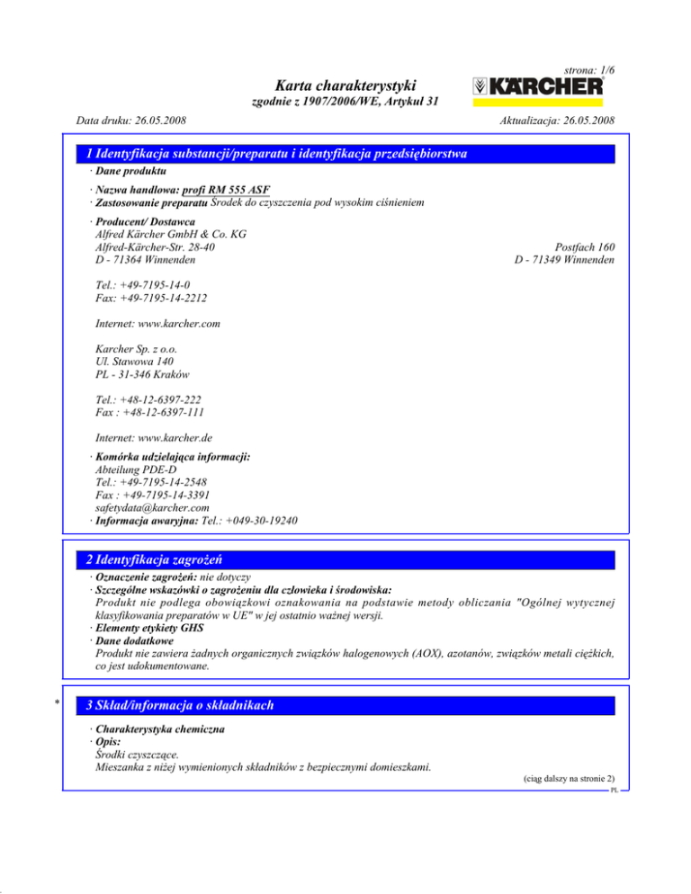 DR strona: 1/6 Karta charakterystyki zgodnie z 1907/2006/WE, Artykuł 31 Data druku: 26.05.2008 Aktualizacja: 26.05.2008 1 Identyfikacja substancji/preparatu i identyfikacja przedsiębiorstwa · Dane produktu · Nazwa handlowa: profi RM 555 ASF · Zastosowanie preparatu Środek do czyszczenia pod wysokim ciśnieniem · Producent/ Dostawca Alfred Kärcher GmbH & Co. KG Alfred-Kärcher-Str. 28-40 D - 71364 Winnenden Postfach 160 D - 71349 Winnenden Tel.: +49-7195-14-0 Fax: +49-7195-14-2212 Internet: www.karcher.com Karcher Sp. z o.o. Ul. Stawowa 140 PL - 31-346 Kraków Tel.: +48-12-6397-222 Fax : +48-12-6397-111 Internet: www.karcher.de · Komórka udzielająca informacji: Abteilung PDE-D Tel.: +49-7195-14-2548 Fax : +49-7195-14-3391 [email protected] · Informacja awaryjna: Tel.: +049-30-19240 2 Identyfikacja zagrożeń · Oznaczenie zagrożeń: nie dotyczy · Szczególne wskazówki o zagrożeniu dla człowieka i środowiska: Produkt nie podlega obowiązkowi oznakowania na podstawie metody obliczania "Ogólnej wytycznej klasyfikowania preparatów w UE" w jej ostatnio ważnej wersji. · Elementy etykiety GHS · Dane dodatkowe Produkt nie zawiera żadnych organicznych związków halogenowych (AOX), azotanów, związków metali ciężkich, co jest udokumentowane. * 3 Skład/informacja o składnikach · Charakterystyka chemiczna · Opis: Środki czyszczące. Mieszanka z niżej wymienionych składników z bezpiecznymi domieszkami. (ciąg dalszy na stronie 2) PL DR strona: 2/6 Karta charakterystyki zgodnie z 1907/2006/WE, Artykuł 31 Data druku: 26.05.2008 Aktualizacja: 26.05.2008 Nazwa handlowa: profi RM 555 ASF (ciąg dalszy od strony 1) · Składniki niebezpieczne: 61827-42-7 polietylenoglikoeter alkilu + 8 EO < 2,5% Xn, Xi; R 22-41 Niebezpieczeństwo: 3.1.O/3; 3.3/1 · Wskazówki dodatkowe: Pełna treść przytoczonych wskazówek dotyczących zagrożeń znajduje się w rozdziale 16. 4 Pierwsza pomoc · Wskazówki ogólne: Środki specjalne nie są konieczne. · po wdychaniu: Dostarczyć świeże powietrze, w razie dolegliwości wezwać lekarza. · po styczności ze skórą: Ogólnie produkt nie działa drażniąco na skórę. Spłukać ciepłą wodą. · po styczności z okiem: Płukać oczy z otwartą powieką przez kilka minut pod bieżącą wodą. W przypadku utrzymującej się dolegliwości zasięgnąć porady lekarza. · po przełknięciu: Przepłukać jamę ustną i obficie popić wodą. Przy trwałych dolegliwościach porozumieć się z lekarzem. 5 Postępowanie w przypadku pożaru · Przydatne środki gaśnicze: CO2, proszek gaśniczy lub strumień wody. Większy pożar zwalczać strumieniem wody lub pianą odporną na działanie alkoholu. · Specjalne wyposażenie ochronne: Środki specjalne nie są konieczne. 6 Postępowanie w przypadku niezamierzonego uwolnienia do środowiska · Środki ostrożności dostosowane do danej osoby: Nie konieczne. · Środki ochrony środowiska: Rozcieńczyć dużą ilością wody. Nie dopuścić do przedostania się do podłoża /ziemi. Nie dopuścić do przeniknięcia do kanalizacji /wód powierzchniowych /wód gruntowych. · Metoda oczyszczania/ wchłaniania: Zebrać za pomocą materiału wiążącego ciecze (piasek, ziemia okrzemkowa, materiał wiążący kwasy, materiał wiążący uniwersalny). · Wskazówki dodatkowe: Nie powstają żadne materiały niebezpieczne. 7 Postępowanie z substancją/preparatem i jej/jego magazynowanie · Sposób obchodzenia się: · Wskazówki dla bezpiecznego użytkowania: Środki specjalne nie są konieczne. · Wskazówki dla ochrony przeciwpożarowej i przeciwwybuchowej: Nie są potrzebne szczególne zabiegi. · Składowanie: · Wymagania w stosunku do pomieszczeń składowych i zbiorników: Brak szczególnych wymagań. (ciąg dalszy na stronie 3) PL DR strona: 3/6 Karta charakterystyki zgodnie z 1907/2006/WE, Artykuł 31 Data druku: 26.05.2008 Aktualizacja: 26.05.2008 Nazwa handlowa: profi RM 555 ASF (ciąg dalszy od strony 2) · Wskazówki odnośnie wspólnego składowania: nie konieczne · Dalsze wskazówki odnośnie warunków składowania: brak · Klasa składowania: . 8 Kontrola narażenia i środki ochrony indywidualnej · Dodatkowe wskazówki dla wykonania urządzeń technicznych: Brak dalszych danych, patrz punkt 7. · Składniki wraz z kontrolowanymi wartościami granicznymi zależnymi od miejsca pracy: Produkt nie zawiera znaczących ilości materiałów, których wartości graniczne musiałyby być kontrolowane pod kątem warunków miejsca pracy. · Wskazówki dodatkowe: Podstawą były aktualnie obowiązujące wykazy. · Osobiste wyposażenie ochronne: · Ogólne środki ochrony i higieny: Należy przestrzegać zwyczajne środki ostrożności przy obchodzeniu się z chemikaliami. · Ochrona dróg oddechowych: Nie konieczne. · Ochrona rąk: Rękawice z gumy. · Materiał, z którego wykonane są rękawice Wybór odpowiednich rękawic nie zależy tylko od materiału, lecz także od innych cech jakościowych i zmienia się od producenta do producenta. · Czas penetracji dla materiału, z którego wykonane są rękawice Od producenta rękawic należy uzyskać informację na temat dokładnego czasu przebicia i go przestrzegać. · Do długotrwałego kontaktu w miejscach bez zwiększonego zagrożenia uszkodzeniem (np. laboratorium) nadają się rękawice z następującego materiału: * Kauczuk butylowy 0,7 mm, 480 min · Jako ochrona przed spryskaniem nadają się rękawice z następujących materiałów: * Kauczuk nitrylowy 0,4 mm, 30 min · Ochrona oczu: Okulary ochronne zalecane podczas napełniania. * 9 Właściwości fizyczne i chemiczne · Ogólne dane Forma: Kolor: Zapach: płynny żółty charakterystyczny · Zmiana stanu Punkt wrzenia/ Zakres wrzenia: 100°C · Punkt zapłonu: nie nadający się do zastosowania · Samozapłon: Produkt nie jest samozapalny. · Niebezpieczeństwo wybuchu: Produkt nie jest grozi wybuchem. · Gęstość w 20°C: 1 g/cm3 (ciąg dalszy na stronie 4) PL DR strona: 4/6 Ka