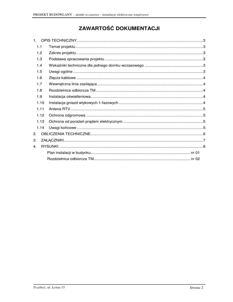 PROJEKT BUDOWLANY – domki wczasowe - instalacje elektryczne wnętrzowe ZAWARTOŚĆ DOKUMENTACJI 1. OPIS TECHNICZNY.....................................................................................................................3 1.1 Temat projektu ......................................................................................................................3 1.2 Zakres projektu .....................................................................................................................3 1.3 Podstawa opracowania projektu ...........................................................................................3 1.4 Wskaźniki techniczne dla jednego domku wczasowego ......................................................3 1.5 Uwagi ogólne ........................................................................................................................3 1.6 Złącza kablowe .....................................................................................................................4 1.7 Wewnętrzna linia zasilająca ..................................................................................................4 1.8 Rozdzielnica odbiorcza TM ...................................................................................................4 1.9 Instalacja oświetleniowa ........................................................................................................4 1.10 Instalacja gniazd wtykowych 1-fazowych ..............................................................................4 1.11 Antena RTV...........................................................................................................................5 1.12 Ochrona odgromowa ............................................................................................................5 1.13 Ochrona od porażeń prądem elektrycznym ..........................................................................5 1.14 Uwagi końcowe .....................................................................................................................5 2. OBLICZENIA TECHNICZNE ........................................................................................................6 3. ZAŁĄCZNIKI.................................................................................................................................7 4. RYSUNKI .....................................................................................................................................8 Plan instalacji w budynku ............................................................................................ nr 01 Rozdzielnica odbiorcza TM ......................................................................................... nr 02 Trzebież; ul. Leśna 15 Strona 2 PROJEKT BUDOWLANY – domki wczasowe - instalacje elektryczne wnętrzowe 1. OPIS TECHNICZNY 1.1 Temat projektu Instalacje elektryczne wnętrzowe w istniejących domkach wczasowych w Ośrodku Wypoczynkowym przy ul. Leśnej 15 w Trzebieży. 1.2 Zakres projektu Wewnętrzna linia zasilająca YDY 5x10mm 2 Rozdzielnica odbiorcza TM Instalacja odbiorcza gniazd wtykowych 1-fazowych Instalacja odbiorcza oświetleniowa Demontaż instalacji istniejących 1.3 Podstawa opracowania projektu Umowa o dostawę energii elektrycznej nr HWK/AM/1075/2004 między ENEA S. A. i OSiR w Policach. Architektoniczny projekt budowlany w skali 1:100. Uzgodnienia międzybranżowe. Obowiązujące normy i przepisy w zakresie projektowania. 1.4 Wskaźniki techniczne dla jednego domku wczasowego Moc instalowana Pi = 21,50kW Moc obliczeniowa P = 11,70kW Prąd obliczeniowy I = 18,0A 1.5 Uwagi ogólne Ośrodek wypoczynkowy posiada własną stację transformatorową z transformatorem o mocy 160kVA, z której zasilane są wszystkie obiekty. Pośredni pomiar energii dla całego Ośrodka odbywa się po stronie 0,4kV. Domki letniskowe zasilane są magistralnie siecią kablową z 2 kablami YKY 4x25mm . Każdy z domków wczasowych wyposażony jest w złącze kablowe znajdujące się w zewnętrznej ścianie budynku. Do złączy jw. wprowadzone są przelotowo linie zasilające, z których jedna jest nieczynna (rezerwowa) a wcześniej służyła do ogrzewania akumulacyjnego. Każde z złącz kablowych w remontowanych budynkach są w złym stanie technicznym i wymagają wymiany. Opisana sieć zasilająca pozostaje bez zmian. Wyeksploatowana instalacja wnętrzowa w obu domkach podlega demontażowi. Trzebież; ul. Leśna 15 Strona 3 PROJEKT BUDOWLANY – domki wczasowe - instalacje elektryczne wnętrzowe W każdym z 5 remontowanych budynków należy wykonać analogiczne instalacje elektryczne, a plan i opis dotyczący jednego należy zastosować w każdym. 1.6 Złącza kablowe Po demontażu istniejących złączy kablowych należy zamontować nowe o analogicznym układzie elektrycznym. W miejscu dotychczasowych złączy należy zabudować złącza kablowe wnękowe w obudowie z tworzywa sztucznego. Istniejące wnęki wymagać będą przystosowania do gabarytów nowych złączy. Rodzaje zamków do złączy należy uzgodnić z administracją Ośrodka. 1.7 Wewnętrzna linia zasilająca Od wymienionych złączy kablowych do projektowanych rozdzielnic odbiorczych TM należy 2 ułożyć przewody YDY 5x10mm . Wlz należy ułożyć w wykutych bruzdach pod tynkiem. 1.8 Rozdzielnica odbiorcza TM Rozdzielnica odbiorcza TM w obudowie typu Eskinoxe 3x18, z tworzywa sztucznego, firmy Legrand należy zabudować w przygotowanej wnęce w przedsionku. Rozdzielnice należy wyposażyć wg załączonego schematu strukturalnego. Rezerwowe miejsca na rozdzielnicy należy zamaskować. Rozdzielnica będzie wyposażona w zaciski PE oraz N do przyłączenia przewodów. Fazowe żyły obwodów odbiorczych przyłączać należy do zacisków wyłączników instalacyjnych. 1.9 Instalacja oświetleniowa Instalację oświetleniową należy wykonać przewodami kabelkowymi typu YDYżo lub YDYpżo 2 z żyłami o przekroju 1,5mm układa