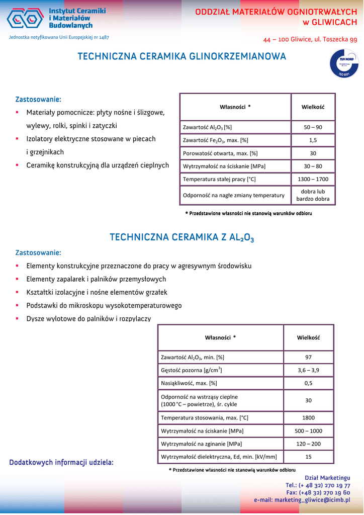 ODDZIAŁ MATERIAŁÓW OGNIOTRWAŁYCH w GLIWICACH Jednostka notyfikowana Unii Europejskiej nr 1487 44 – 100 Gliwice, ul. Toszecka 99 TECHNICZNA CERAMIKA GLINOKRZEMIANOWA Zastosowanie: Zastosowanie: Własności * Materiały pomocnicze: płyty nośne i ślizgowe, Wielkość wylewy, rolki, spinki i zatyczki Zawartość Al2O3 [%] Izolatory elektryczne stosowane w piecach Zawartość Fe2O3, max. [%] 1,5 i grzejnikach Porowatość otwarta, max. [%] 30 Ceramikę konstrukcyjną dla urządzeń cieplnych Wytrzymałość na ściskanie [MPa] 50 – 90 30 – 80 Temperatura stałej pracy [°C] 1300 – 1700 Odporność na nagłe zmiany temperatury dobra lub bardzo dobra * Przedstawione własności nie stanowią warunków odbioru TECHNICZNA CERAMIKA Z AL 2O3 Zastosowanie: Zastosowanie: Elementy konstrukcyjne przeznaczone do pracy w agresywnym środowisku Elementy zapalarek i palników przemysłowych Kształtki izolacyjne i nośne elementów grzałek Podstawki do mikroskopu wysokotemperaturowego Dysze wylotowe do palników i rozpylaczy Własności * Wielkość Zawartość Al2O3, min. [%] 97 3 Gęstość pozorna [g/cm ] 3,6 – 3,9 Nasiąkliwość, max. [%] 0,5 Odporność na wstrząsy cieplne (1000 °C – powietrze), śr. cykle 30 Temperatura stosowania, max. [°C] Dodatkowych informacji udziela: 1800 Wytrzymałość na ściskanie [MPa] 500 – 1000 Wytrzymałość na zginanie [MPa] 120 – 200 Wytrzymałość dielektryczna, Ed, min. [kV/mm] 15 * Przedstawione własności nie stanowią warunków odbioru Dział Marketingu Tel.: Tel.: (+ 48 32) 270 19 77 Fax: Fax : (+48 32) 270 19 60 e- mail: [email protected] marketing [email protected] ODDZIAŁ MATERIAŁÓW OGNIOTRWAŁYCH w GLIWICACH Jednostka notyfikowana Unii Europejskiej nr 1487 44 – 100 Gliwice, ul. Toszecka 99 CERAMIKA Z WĘGLIKA KRZEMU K RZEMU NA WIĄZANIU AZOTKOWYM AZ OTKOWYM Zastosowanie: Zastosowanie: Słupki i płyty rusztowe w piecach do wypalania ceramiki szlachetnej Własności * Wielkość Zawartość SiC [%] i elektrotechnicznej ~80 Temperatura stosowania, max. [°C] 1600 Osłony termopar Gęstość pozorna, min. [g/cm ] 2,5 Kształtki stanowiące wymurówkę Porowatość otwarta [%] 18 pieców grzewczych Odporność na wstrząsy cieplne [n/H2O] >40 Wytrzymałość na ściskanie [MPa] 100 3 Wytrzymałość cieplna w temperaturze [W/mK] 400°C do 5,7 600°C do 5,8 800°C do 6,1 3 Odporność na ścieranie, max. [cm ] 5,5 * Przedstawione własności nie stanowią warunków odbioru TECHNICZNA CERAMIKA KORDIERYTOWA Zastosowanie: Zastosowanie: Palniki – radiatory Płytki perforowane Własności * Wielkość Zawartość MgO, śr. [%] 20 Zawartość Fe2O3, max. [%] 5 Porowatość otwarta, [%] 20 – 30 Temperatura stosowania, max. [°C] 1300 Odporność na nagłe zmiany temperatury bardzo dobra * Przedstawione własności nie stanowią warunków odbioru Dodatkowych informacji udziela: Dział Marketingu Tel.: Tel.: (+ 48 32) 270 19 77 Fax: Fax : (+48 32) 270 19 60 e- mail: [email protected] marketing [email protected]